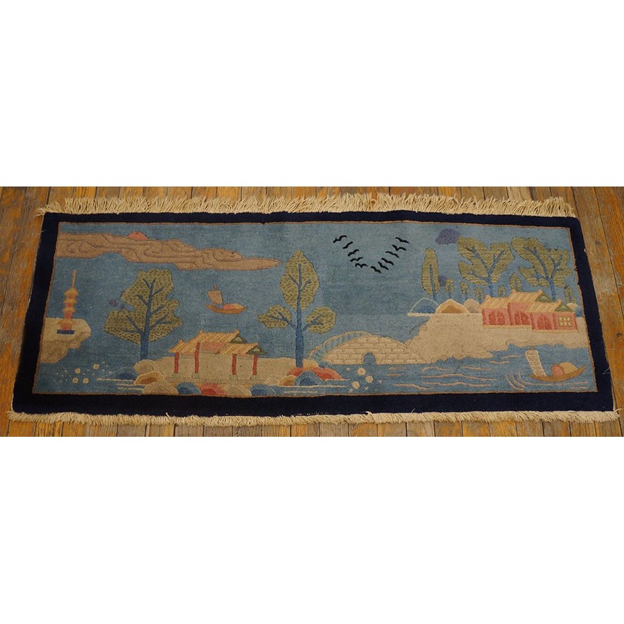 DescriptionChineseCarpets made in China proper. See entries Ningshia, Peking, Art Deco. Chinese - Art DecoAs the name implies, pieces woven between the wars for the Western market by mostly American owned firms especially Nichols and Fette, in thick heavy weaves using strong colors, asymmetric patterns and downplaying the Chinese-ness of the carpet. Nichols rugs are more strong toned than the pastel Fette. Most were woven in the coastal port city of Tientsin. Other lesser known workshops were also active. Some pieces are ultra-geometric and haute-Deco moderne in character: these are very rare. More frequent are pieces with bits of Chinese ornament: vases or other precious objects, paeonies, vines, fences, etc. Most common is the 9 x 12 size, in colors never found in mainstream Chinese rugs: backgrounds in black, mauve, purple, hot pink, orange, olive, employing the best synthetic chrome dyes of the period. Prices are still reasonable and carpets in top condition are available. | |