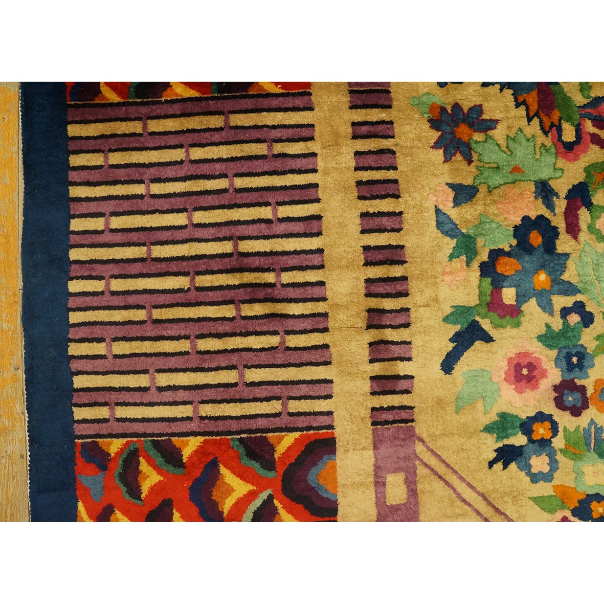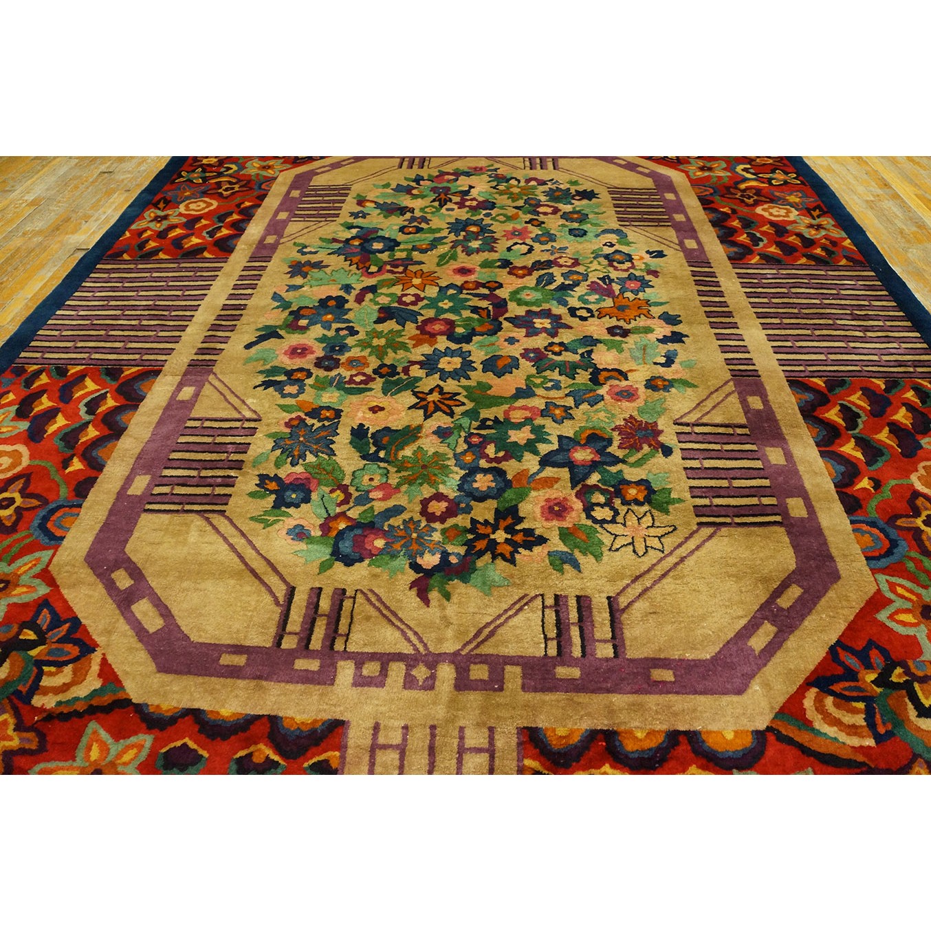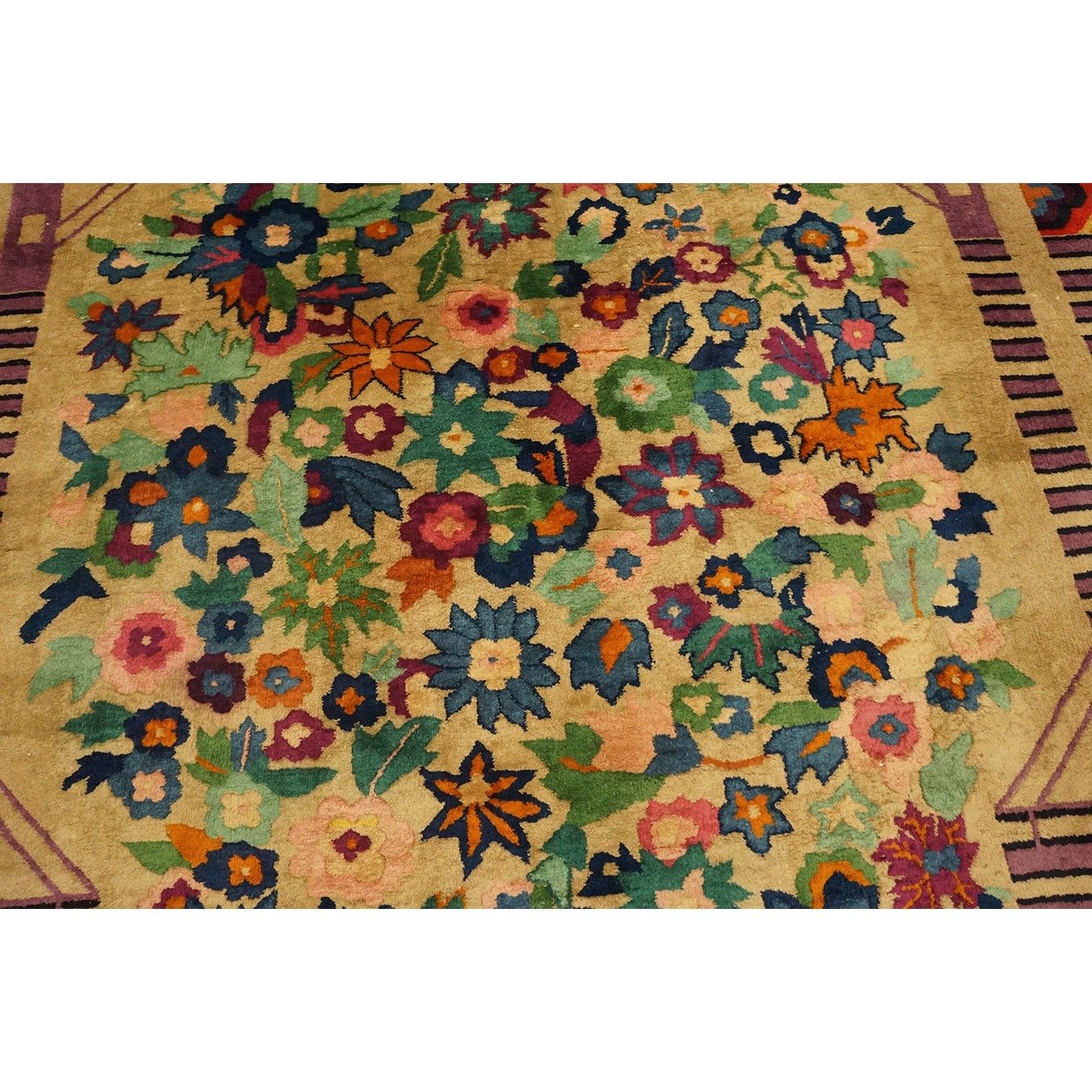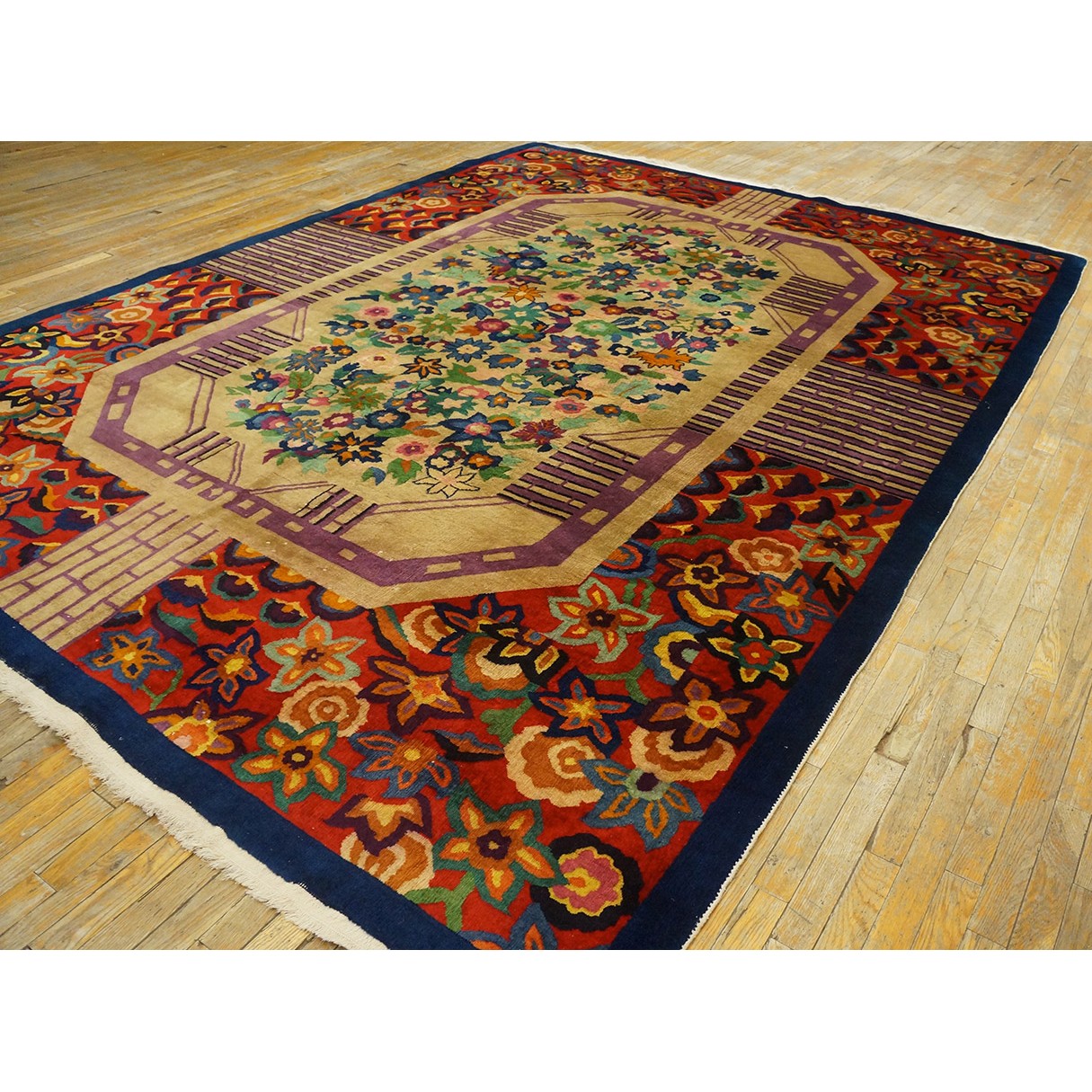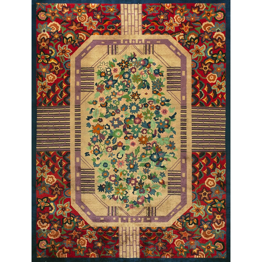 DescriptionChineseCarpets made in China proper. See entries Ningshia, Peking, Art Deco. Chinese - Art DecoAs the name implies, pieces woven between the wars for the Western market by mostly American owned firms especially Nichols and Fette, in thick heavy weaves using strong colors, asymmetric patterns and downplaying the Chinese-ness of the carpet. Nichols rugs are more strong toned than the pastel Fette. Most were woven in the coastal port city of Tientsin. Other lesser known workshops were also active. Some pieces are ultra-geometric and haute-Deco moderne in character: these are very rare. More frequent are pieces with bits of Chinese ornament: vases or other precious objects, paeonies, vines, fences, etc. Most common is the 9 x 12 size, in colors never found in mainstream Chinese rugs: backgrounds in black, mauve, purple, hot pink, orange, olive, employing the best synthetic chrome dyes of the period. Prices are still reasonable and carpets in top condition are available. | |