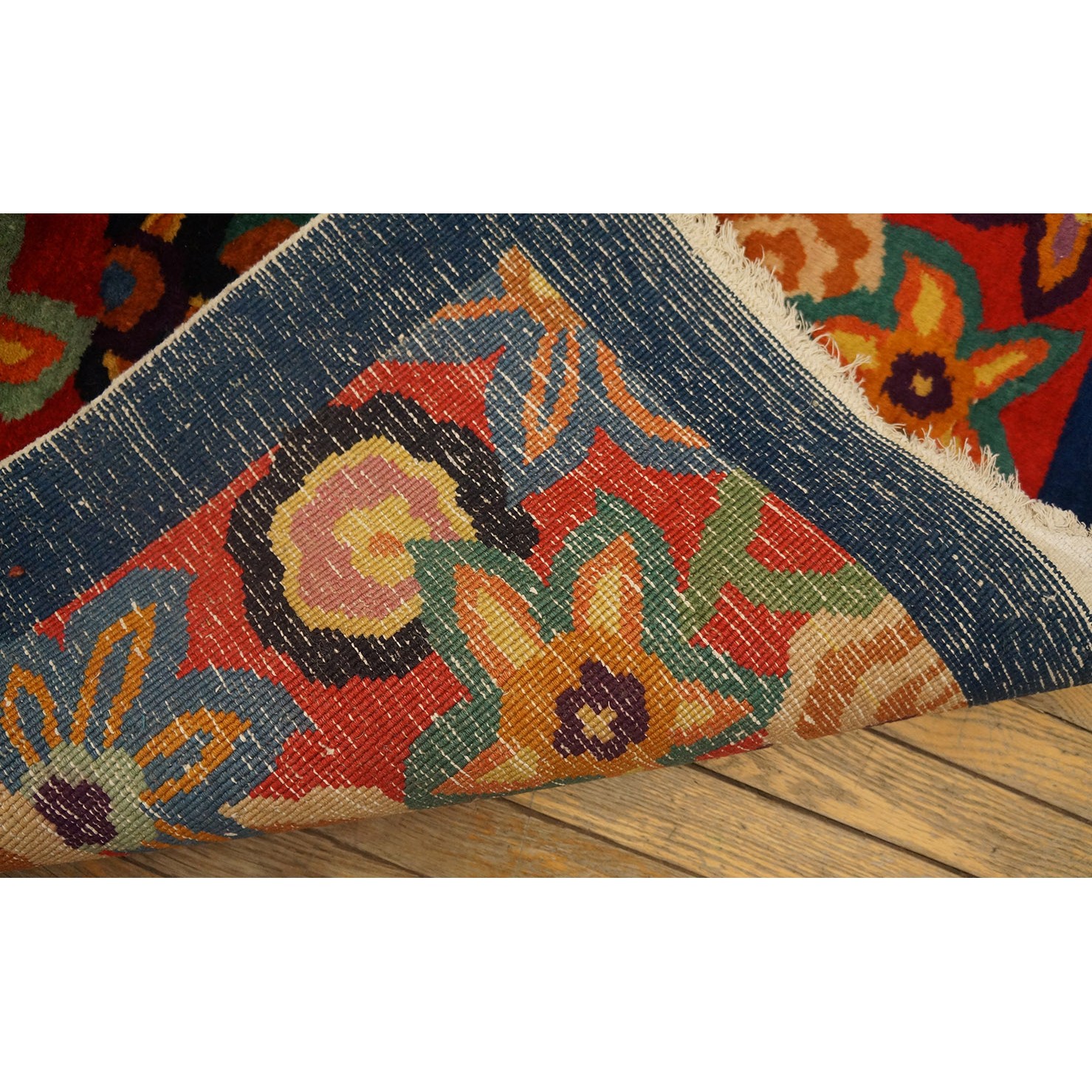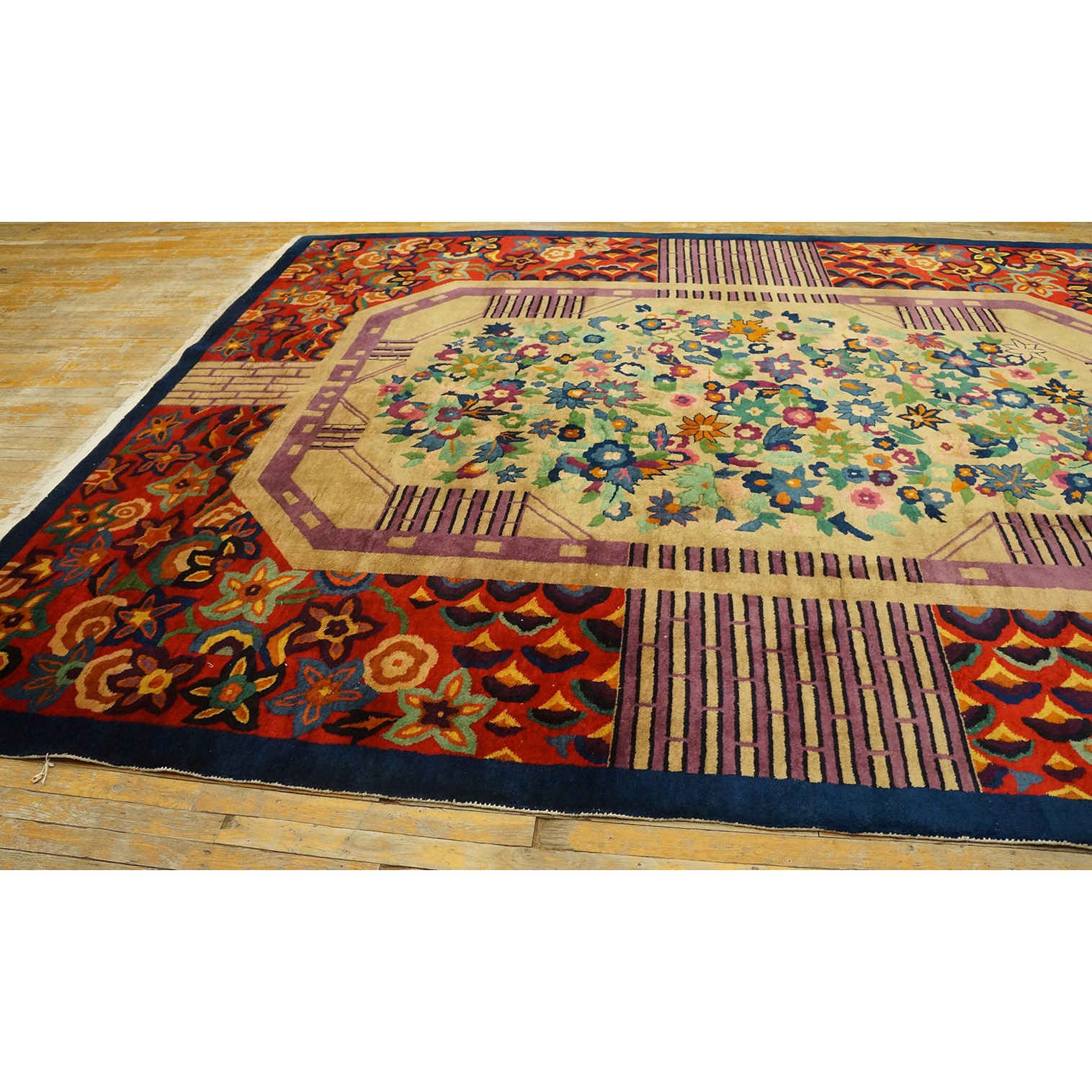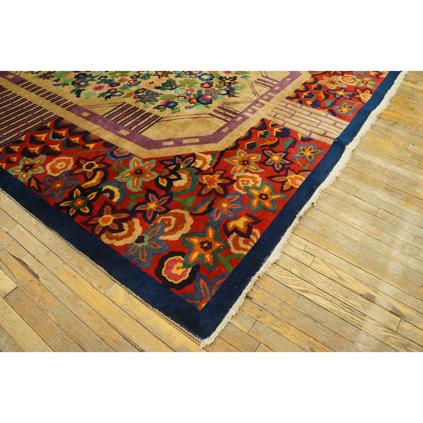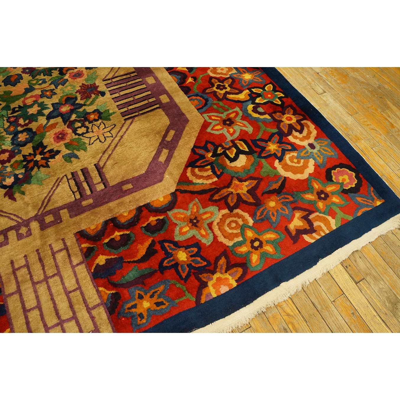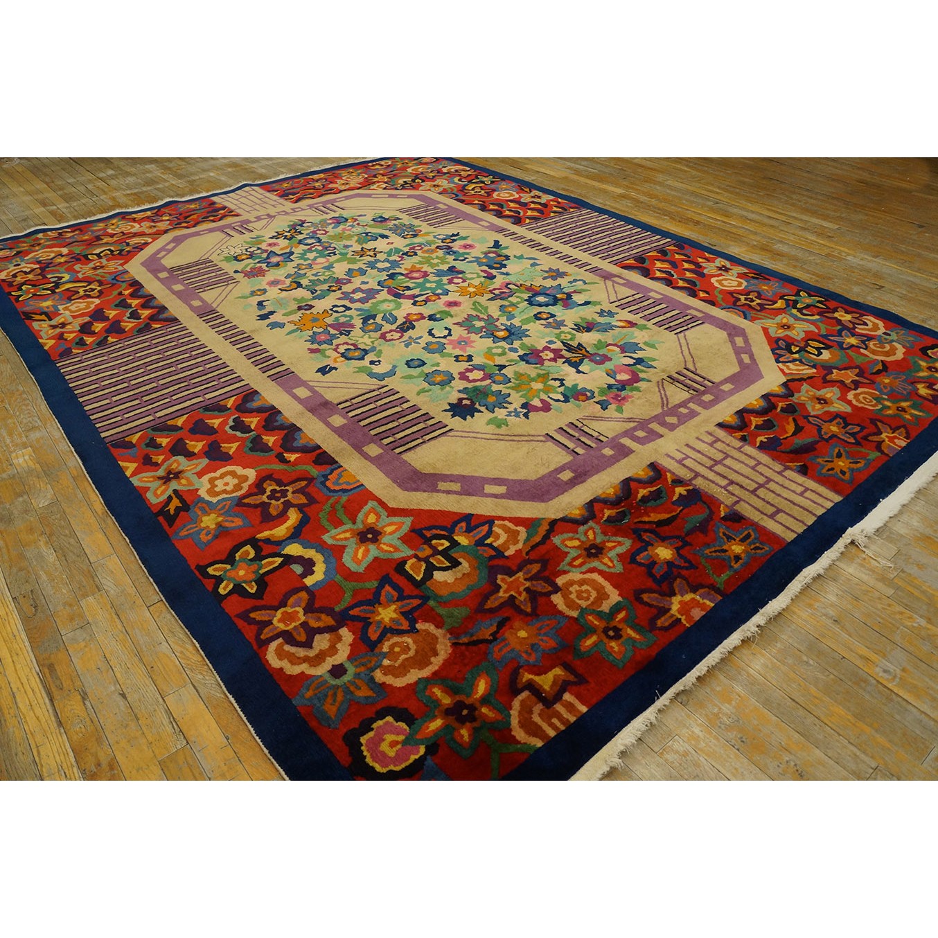 DescriptionChineseCarpets made in China proper. See entries Ningshia, Peking, Art Deco. Chinese - Art DecoAs the name implies, pieces woven between the wars for the Western market by mostly American owned firms especially Nichols and Fette, in thick heavy weaves using strong colors, asymmetric patterns and downplaying the Chinese-ness of the carpet. Nichols rugs are more strong toned than the pastel Fette. Most were woven in the coastal port city of Tientsin. Other lesser known workshops were also active. Some pieces are ultra-geometric and haute-Deco moderne in character: these are very rare. More frequent are pieces with bits of Chinese ornament: vases or other precious objects, paeonies, vines, fences, etc. Most common is the 9 x 12 size, in colors never found in mainstream Chinese rugs: backgrounds in black, mauve, purple, hot pink, orange, olive, employing the best synthetic chrome dyes of the period. Prices are still reasonable and carpets in top condition are available. | |
