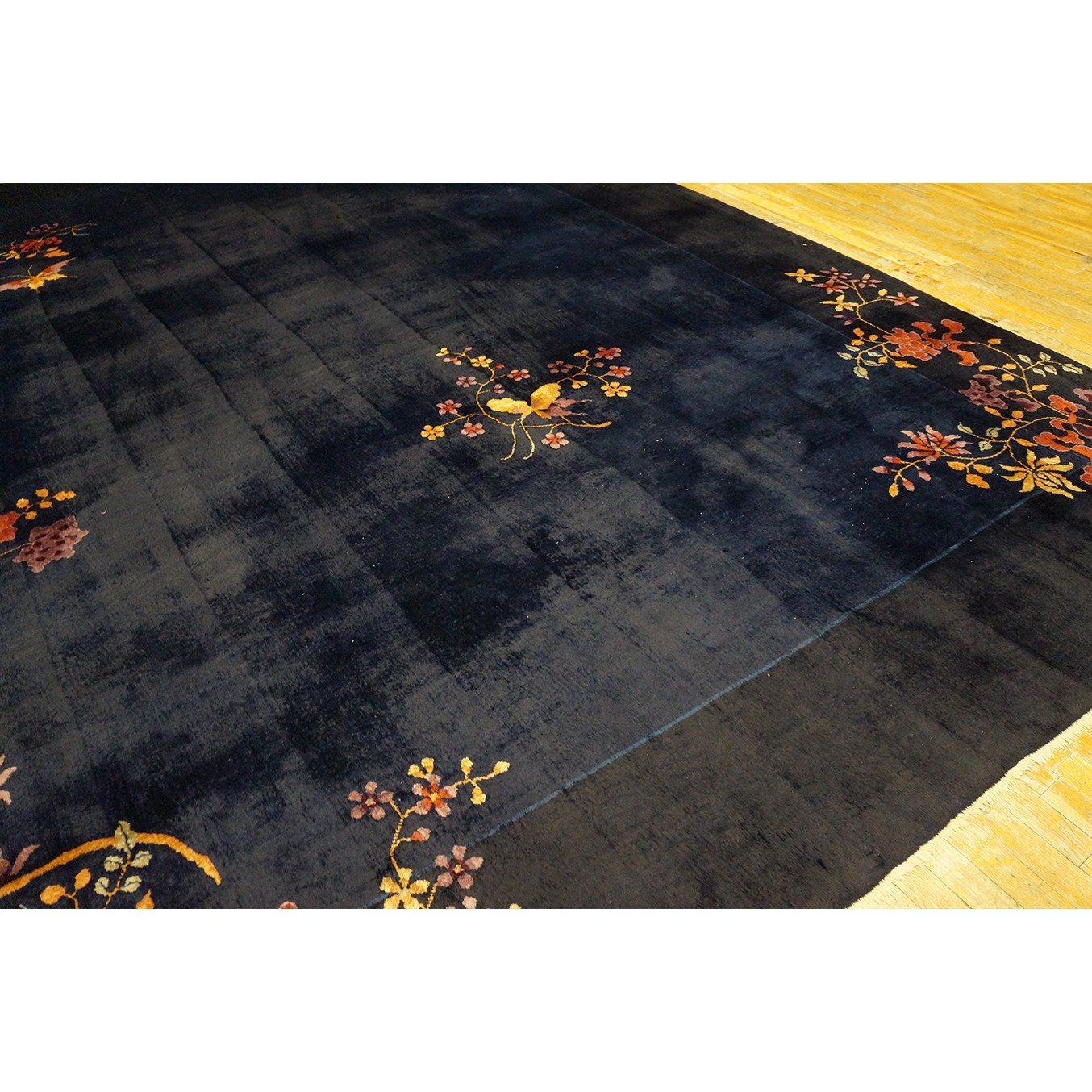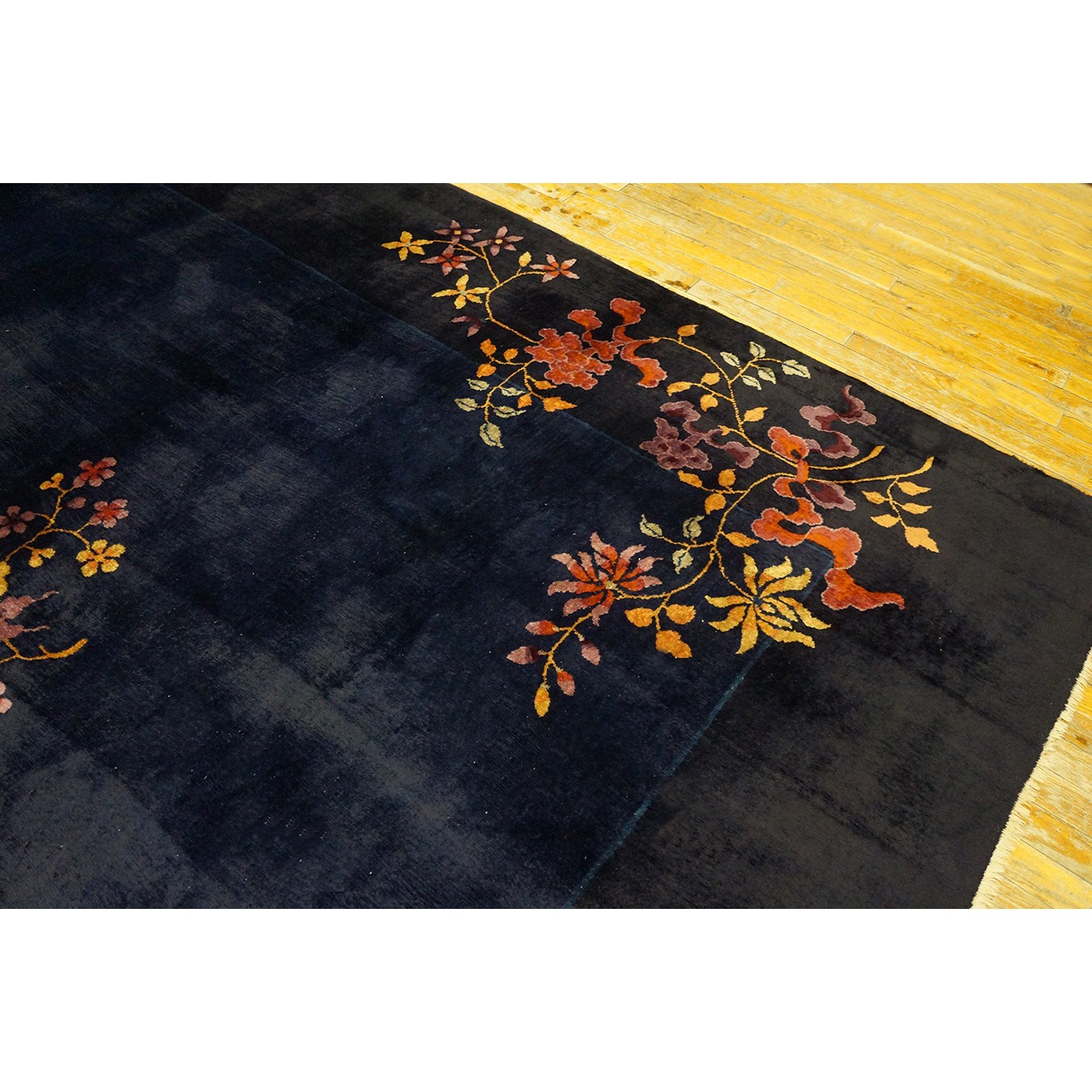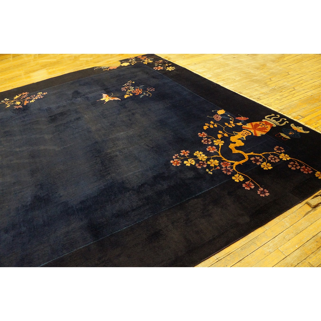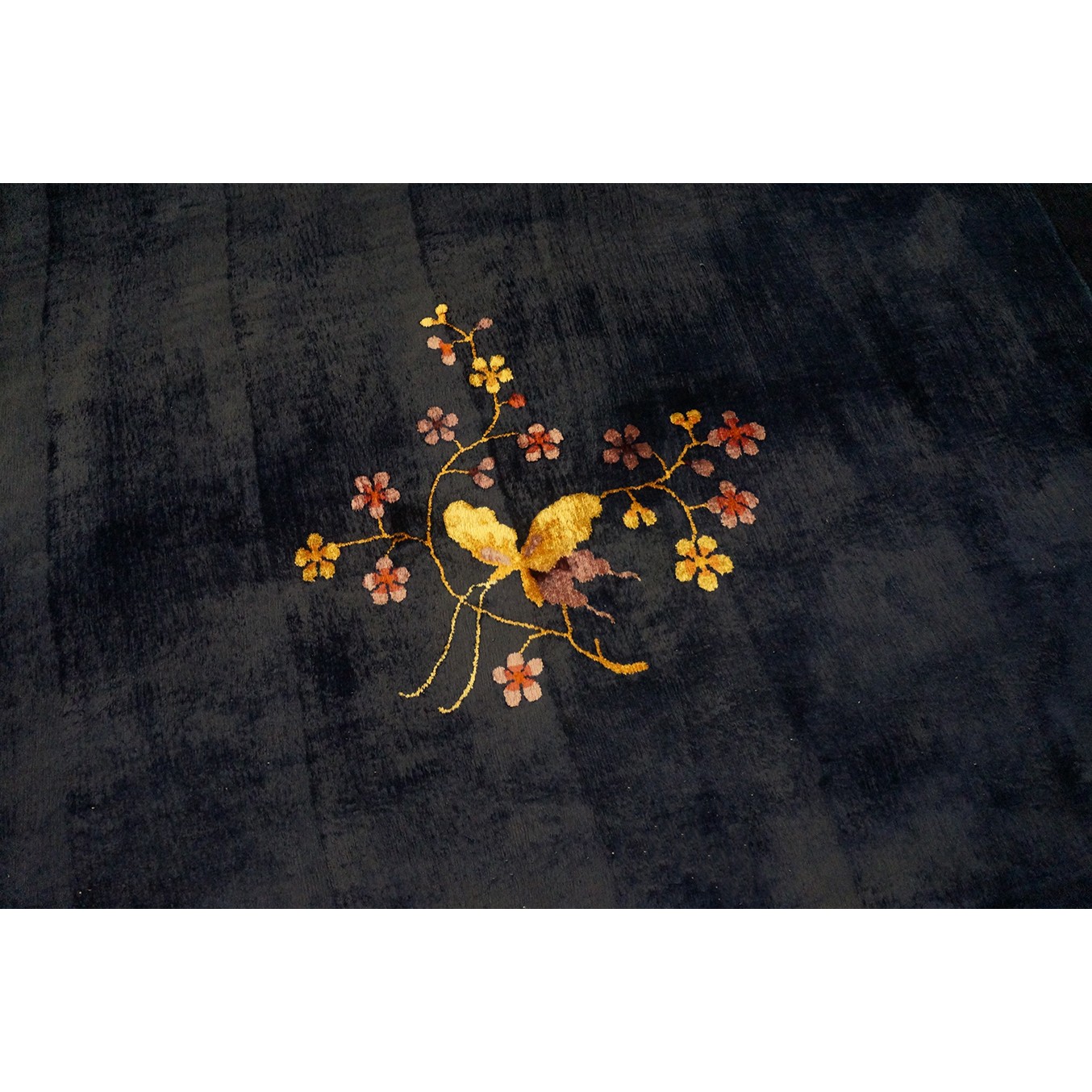 DescriptionChineseCarpets made in China proper. See entries Ningshia, Peking, Art Deco. Chinese - Art DecoAs the name implies, pieces woven between the wars for the Western market by mostly American owned firms especially Nichols and Fette, in thick heavy weaves using strong colors, asymmetric patterns and downplaying the Chinese-ness of the carpet. Nichols rugs are more strong toned than the pastel Fette. Most were woven in the coastal port city of Tientsin. Other lesser known workshops were also active. Some pieces are ultra-geometric and haute-Deco moderne in character: these are very rare. More frequent are pieces with bits of Chinese ornament: vases or other precious objects, paeonies, vines, fences, etc. Most common is the 9 x 12 size, in colors never found in mainstream Chinese rugs: backgrounds in black, mauve, purple, hot pink, orange, olive, employing the best synthetic chrome dyes of the period. Prices are still reasonable and carpets in top condition are available. | |