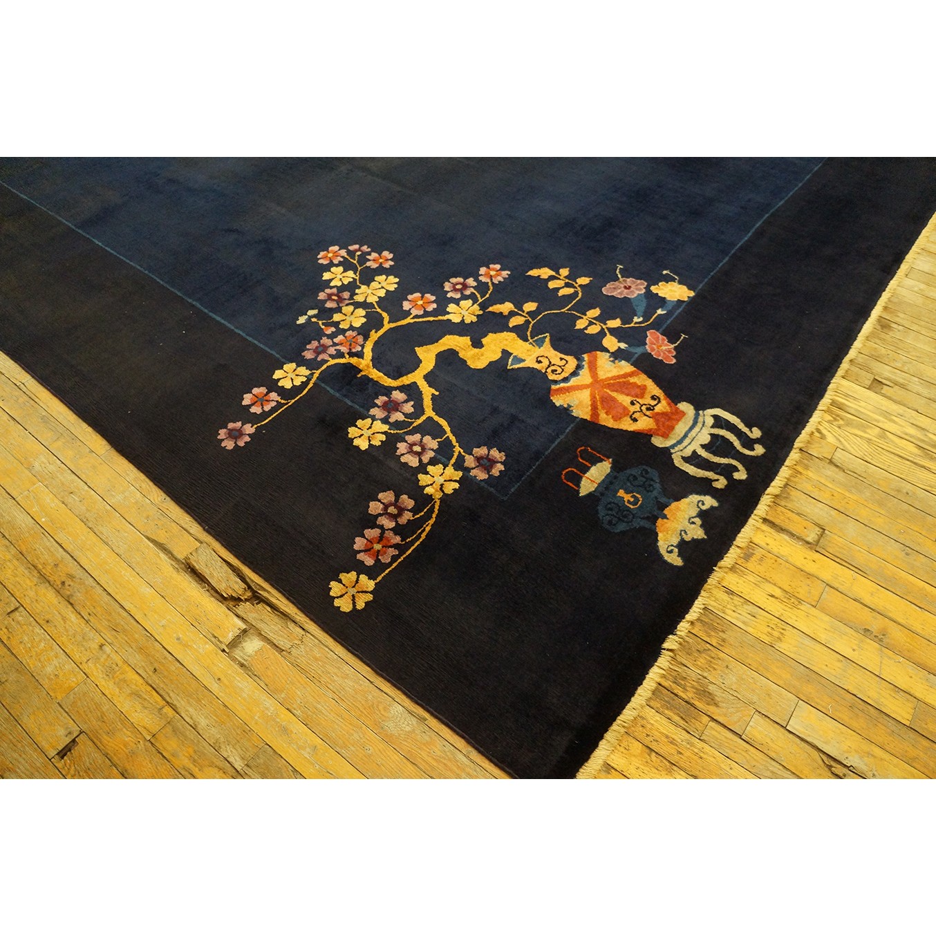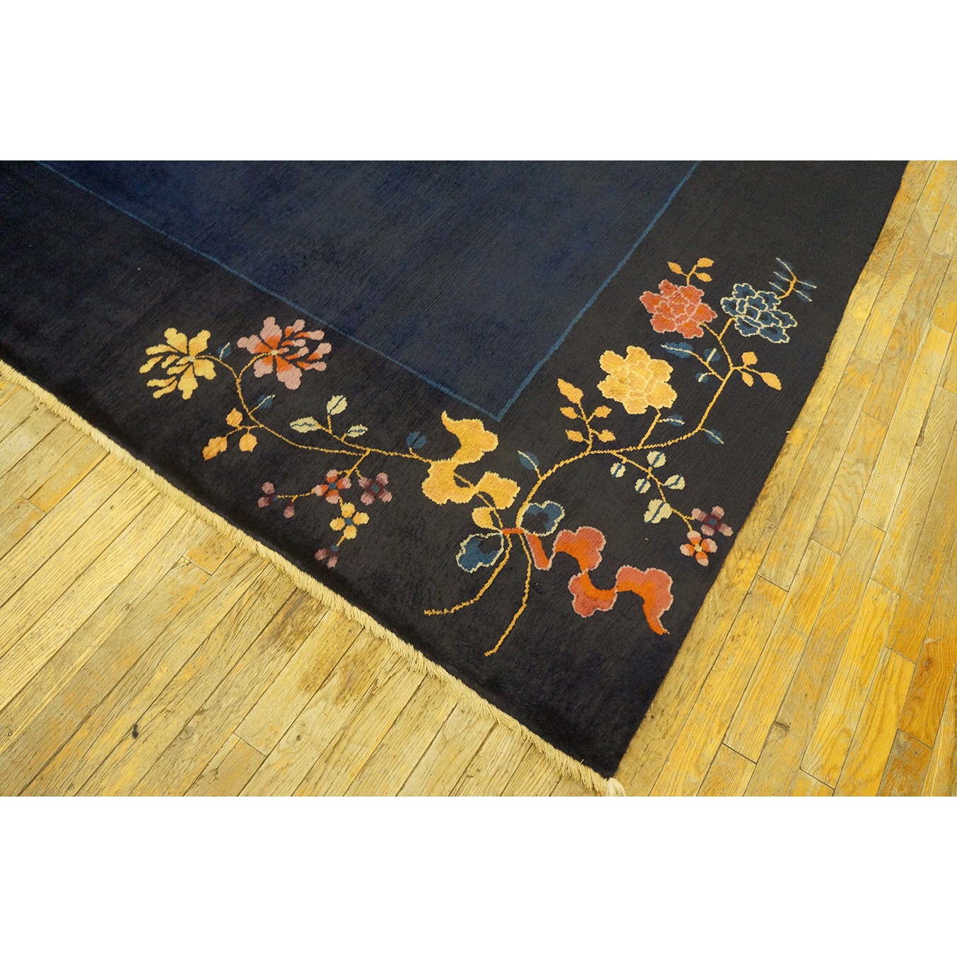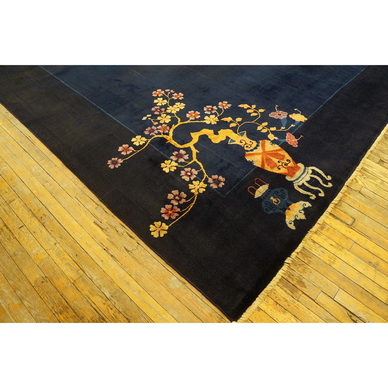 DescriptionChineseCarpets made in China proper. See entries Ningshia, Peking, Art Deco. Chinese - Art DecoAs the name implies, pieces woven between the wars for the Western market by mostly American owned firms especially Nichols and Fette, in thick heavy weaves using strong colors, asymmetric patterns and downplaying the Chinese-ness of the carpet. Nichols rugs are more strong toned than the pastel Fette. Most were woven in the coastal port city of Tientsin. Other lesser known workshops were also active. Some pieces are ultra-geometric and haute-Deco moderne in character: these are very rare. More frequent are pieces with bits of Chinese ornament: vases or other precious objects, paeonies, vines, fences, etc. Most common is the 9 x 12 size, in colors never found in mainstream Chinese rugs: backgrounds in black, mauve, purple, hot pink, orange, olive, employing the best synthetic chrome dyes of the period. Prices are still reasonable and carpets in top condition are available. | |