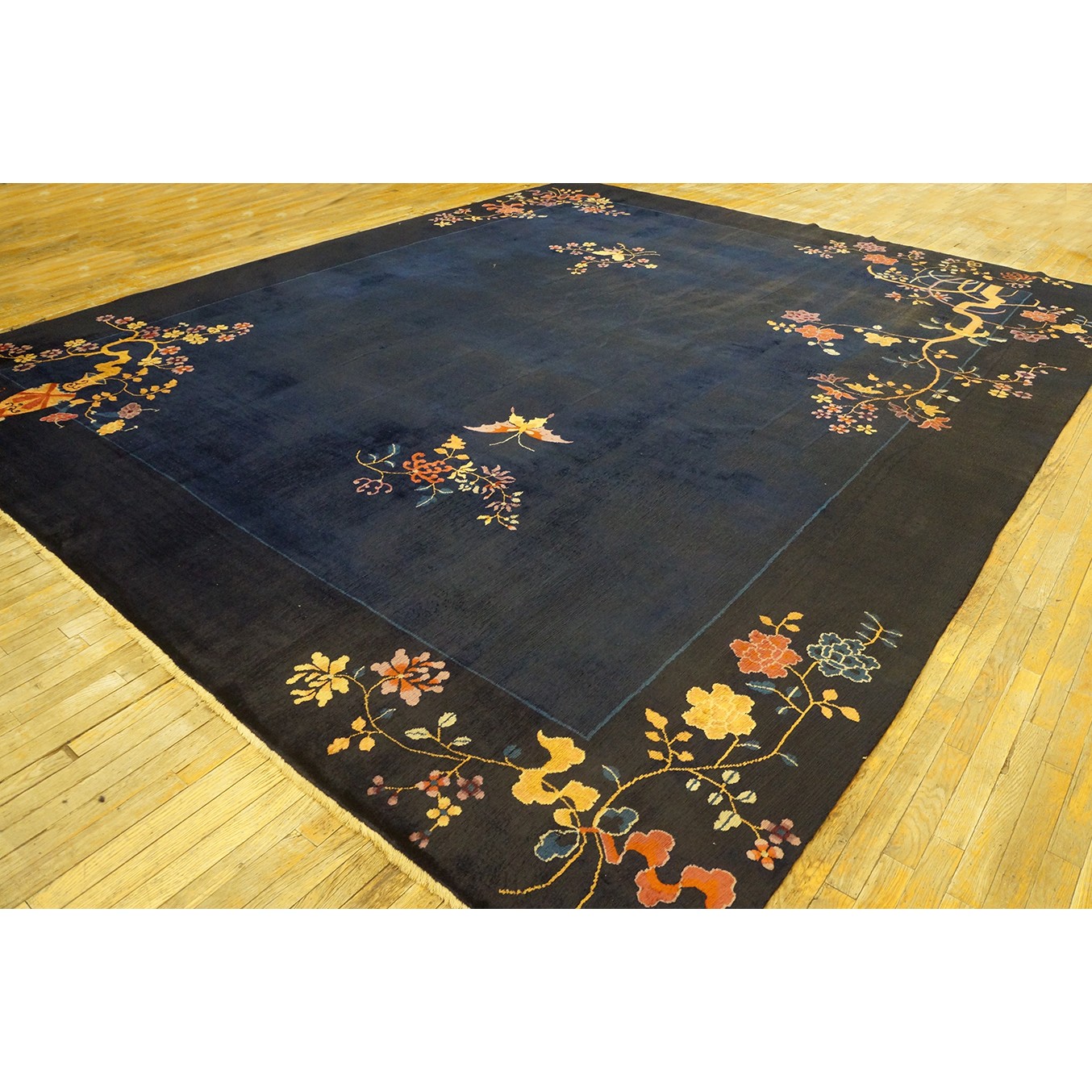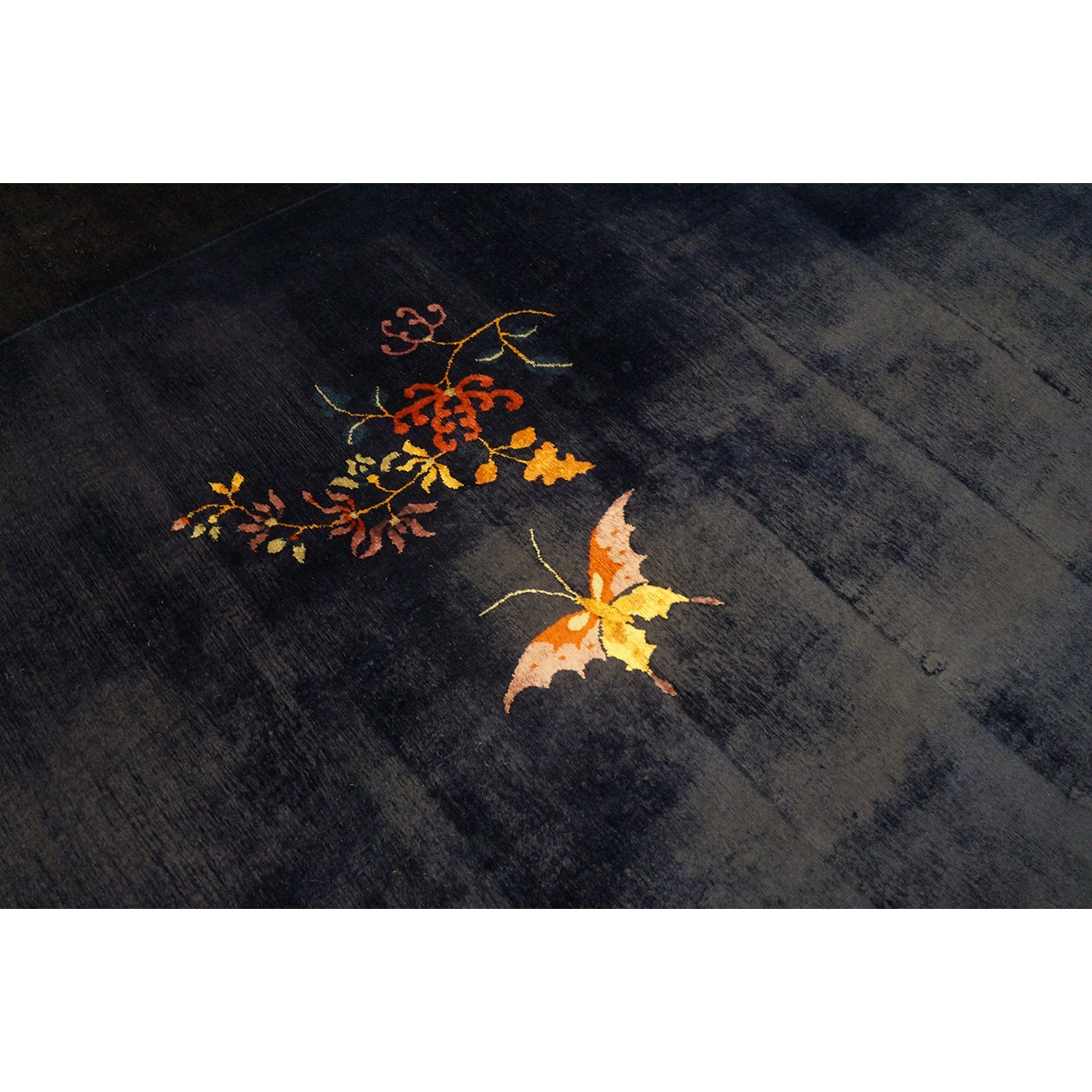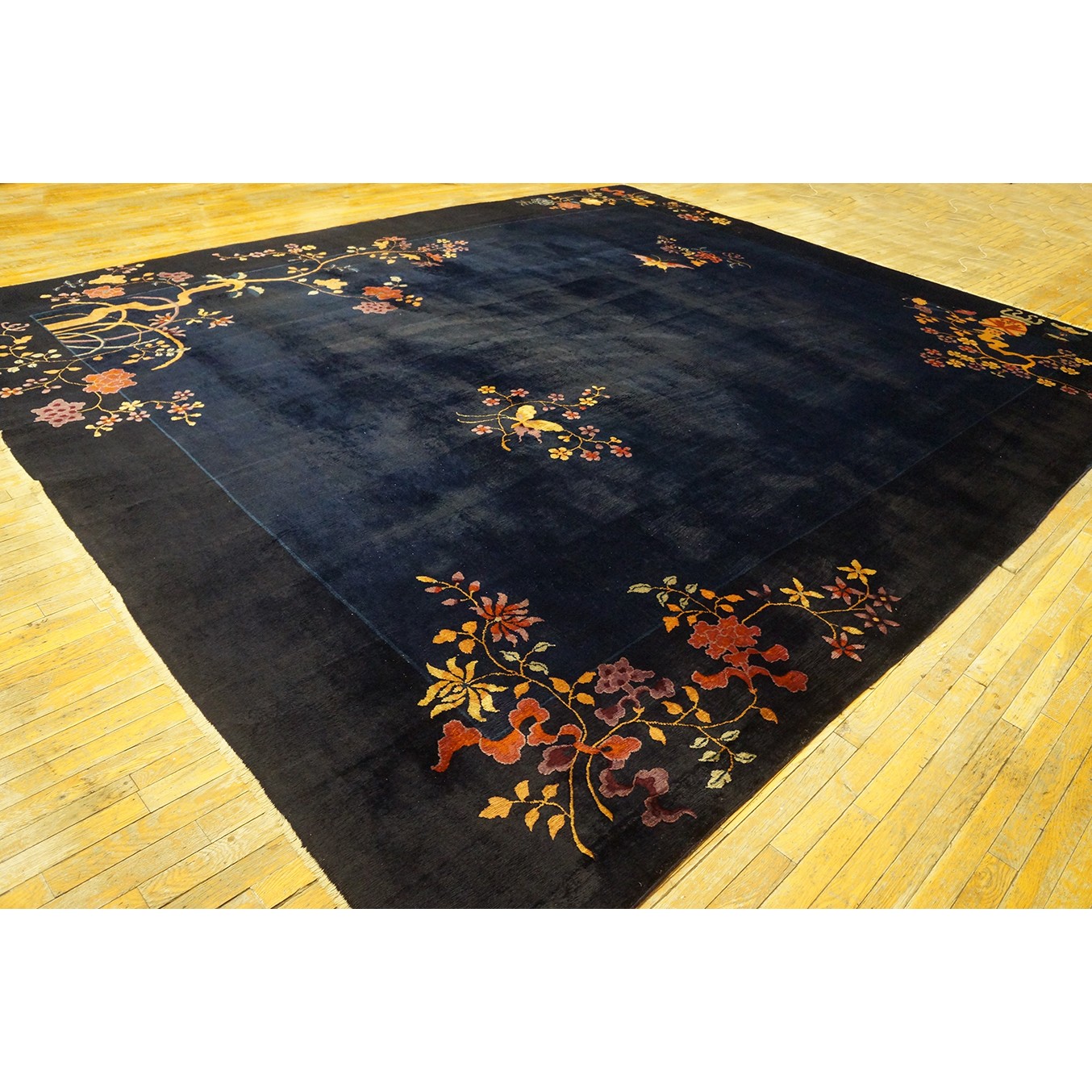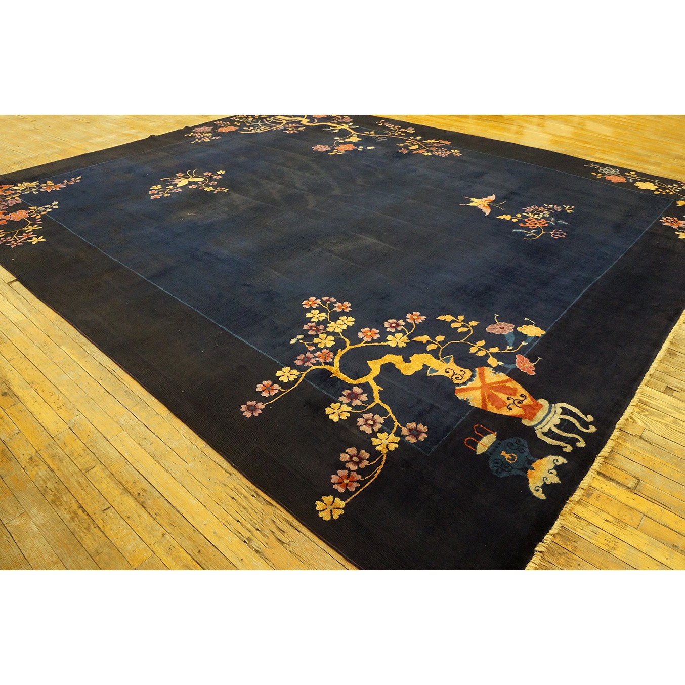 DescriptionChineseCarpets made in China proper. See entries Ningshia, Peking, Art Deco. Chinese - Art DecoAs the name implies, pieces woven between the wars for the Western market by mostly American owned firms especially Nichols and Fette, in thick heavy weaves using strong colors, asymmetric patterns and downplaying the Chinese-ness of the carpet. Nichols rugs are more strong toned than the pastel Fette. Most were woven in the coastal port city of Tientsin. Other lesser known workshops were also active. Some pieces are ultra-geometric and haute-Deco moderne in character: these are very rare. More frequent are pieces with bits of Chinese ornament: vases or other precious objects, paeonies, vines, fences, etc. Most common is the 9 x 12 size, in colors never found in mainstream Chinese rugs: backgrounds in black, mauve, purple, hot pink, orange, olive, employing the best synthetic chrome dyes of the period. Prices are still reasonable and carpets in top condition are available. | |