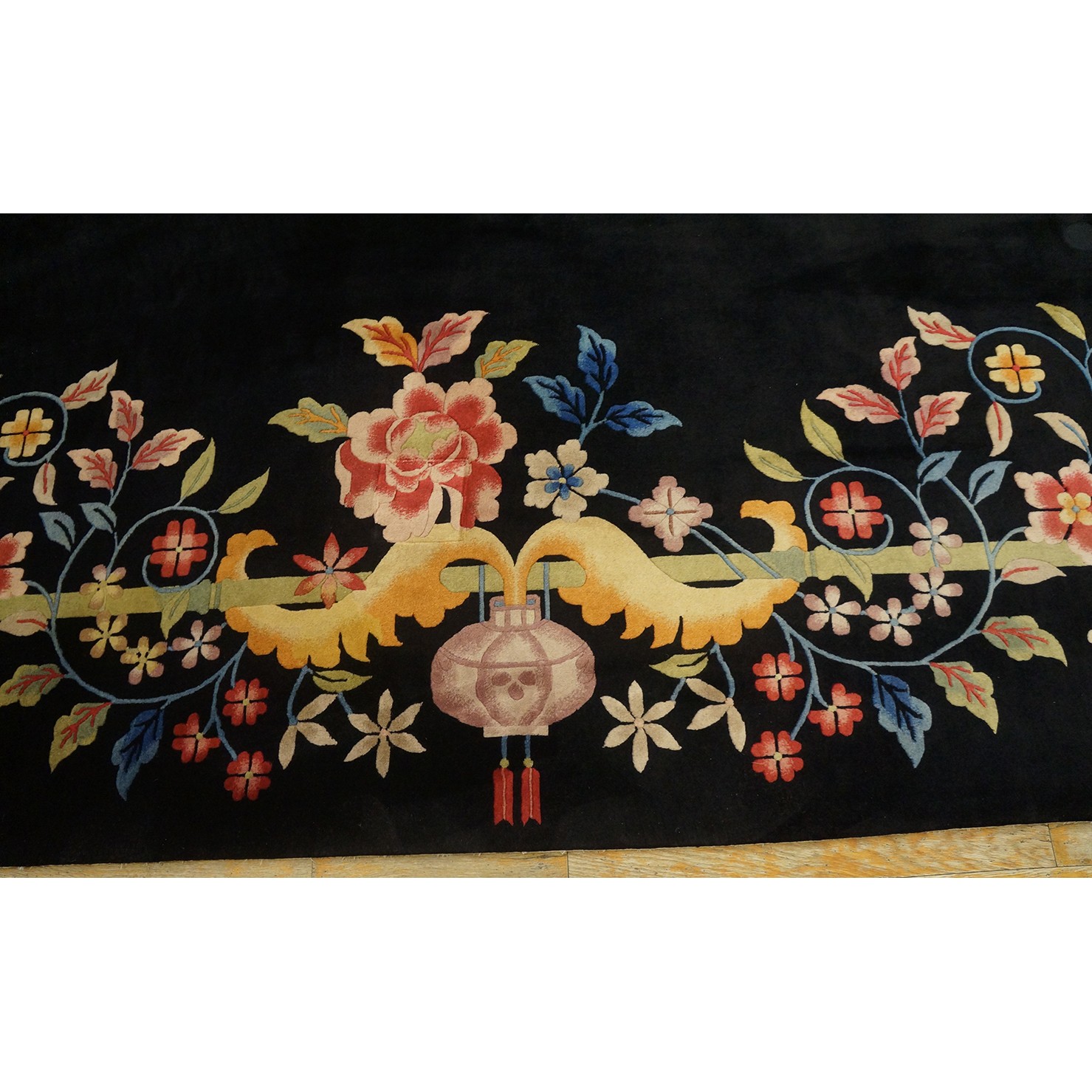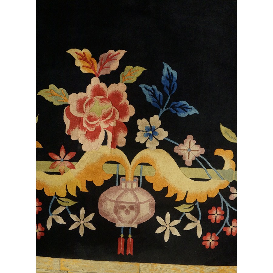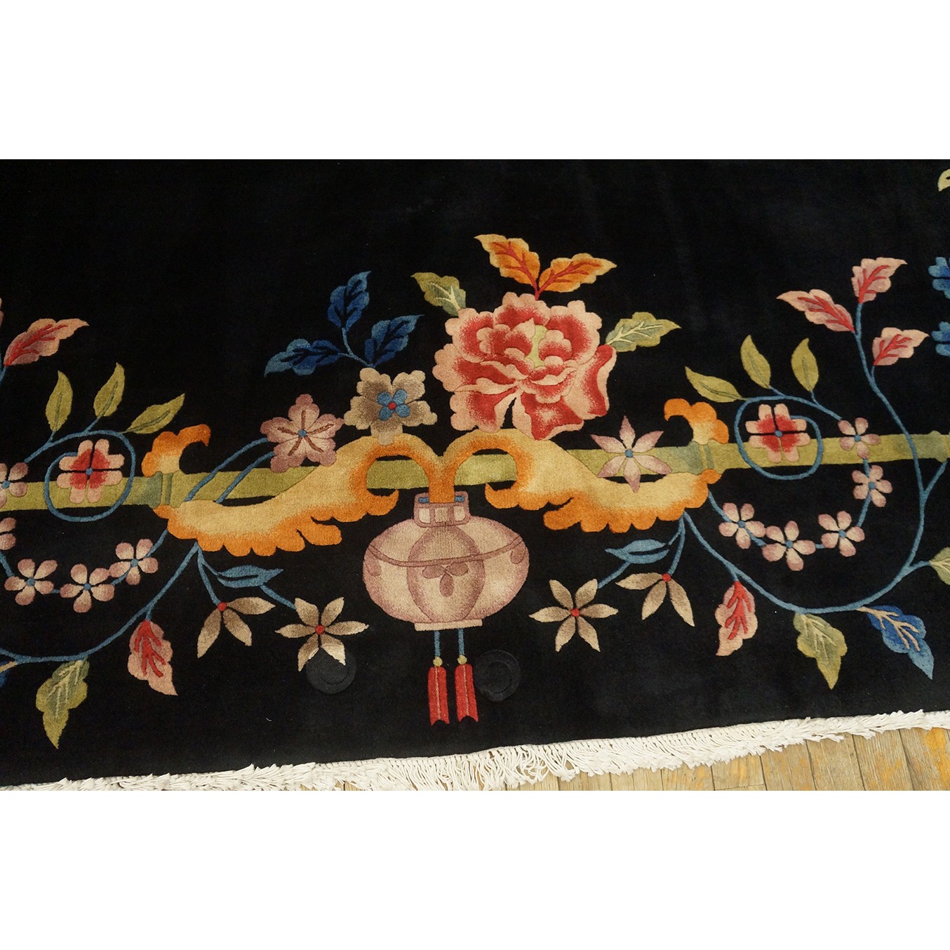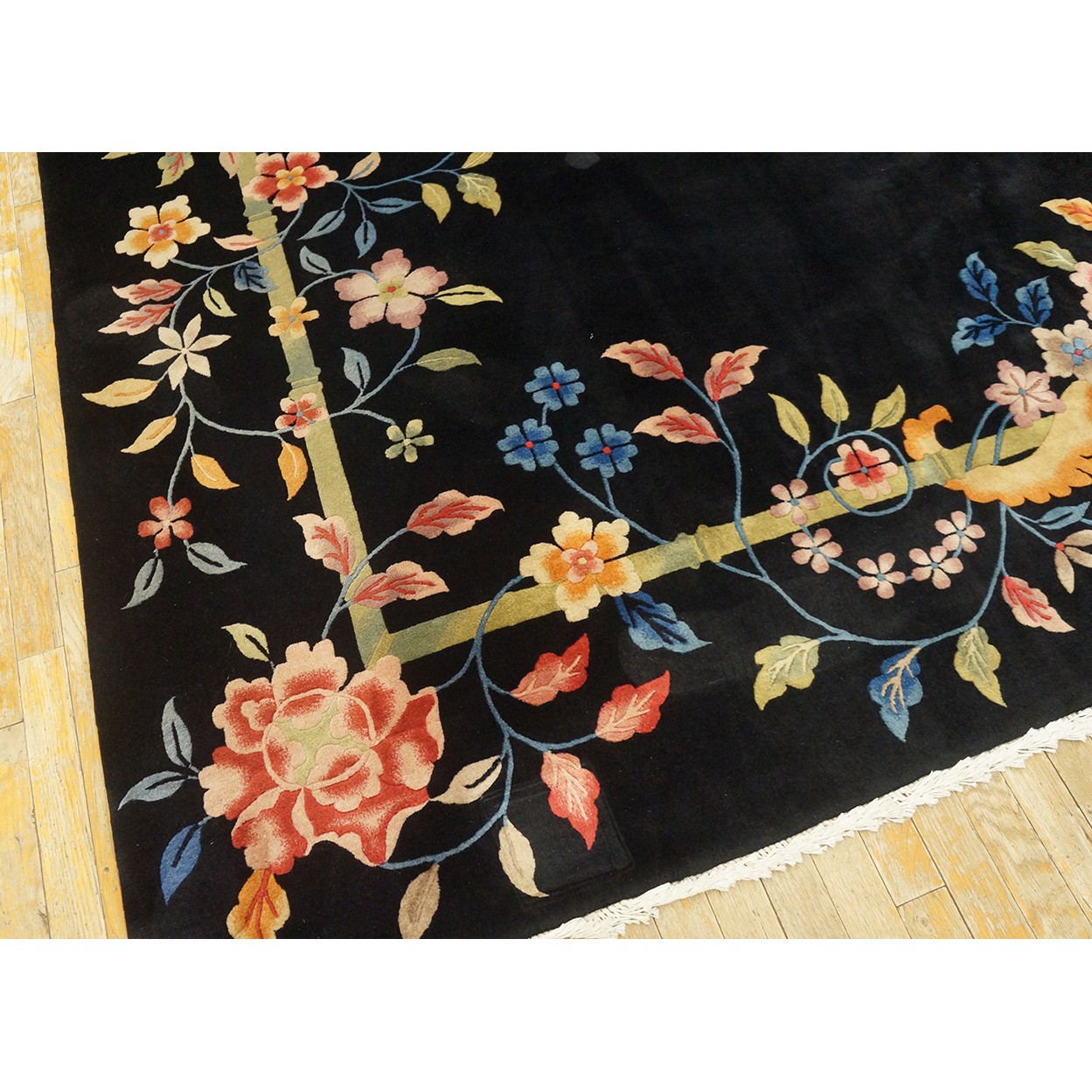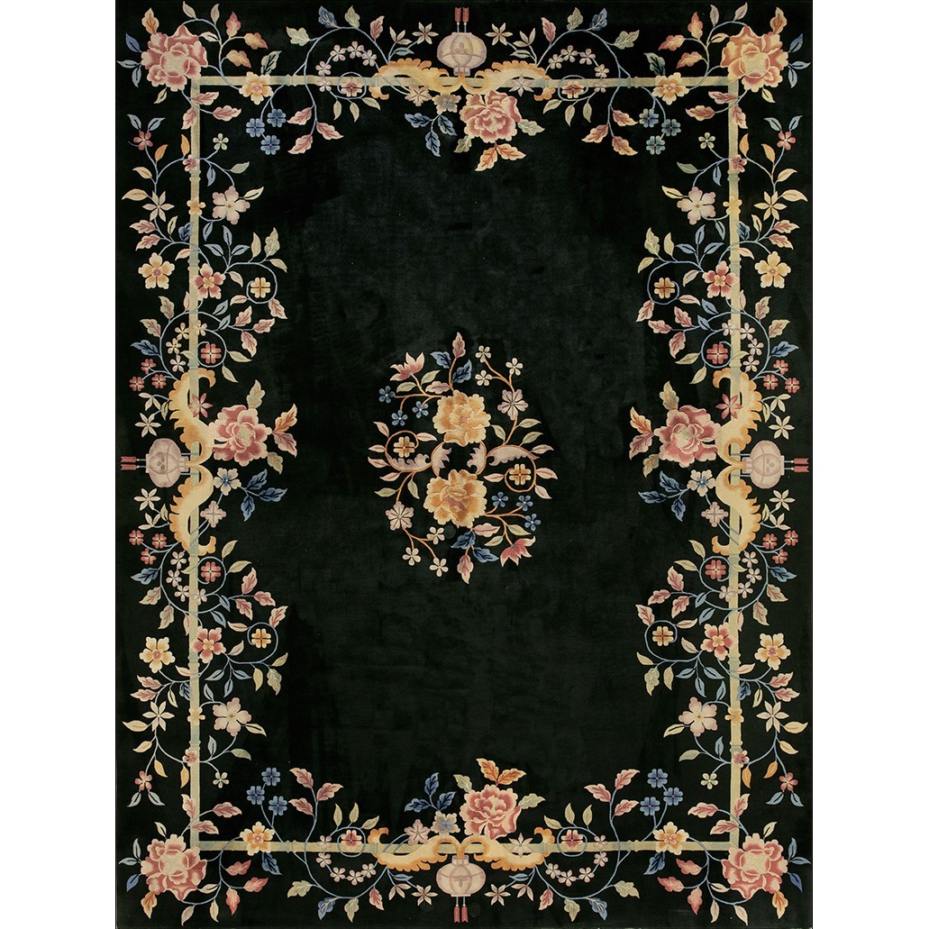 DescriptionChineseCarpets made in China proper. See entries Ningshia, Peking, Art Deco. Chinese - Art DecoAs the name implies, pieces woven between the wars for the Western market by mostly American owned firms especially Nichols and Fette, in thick heavy weaves using strong colors, asymmetric patterns and downplaying the Chinese-ness of the carpet. Nichols rugs are more strong toned than the pastel Fette. Most were woven in the coastal port city of Tientsin. Other lesser known workshops were also active. Some pieces are ultra-geometric and haute-Deco moderne in character: these are very rare. More frequent are pieces with bits of Chinese ornament: vases or other precious objects, paeonies, vines, fences, etc. Most common is the 9 x 12 size, in colors never found in mainstream Chinese rugs: backgrounds in black, mauve, purple, hot pink, orange, olive, employing the best synthetic chrome dyes of the period. Prices are still reasonable and carpets in top condition are available. | |
