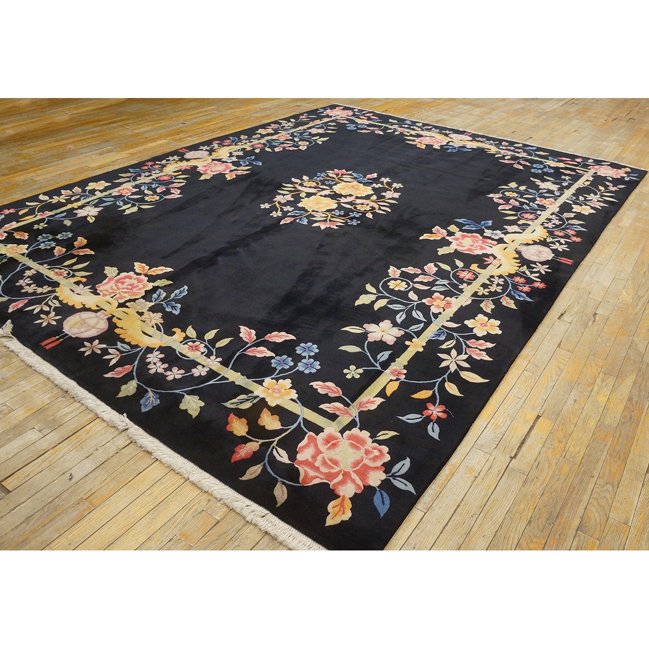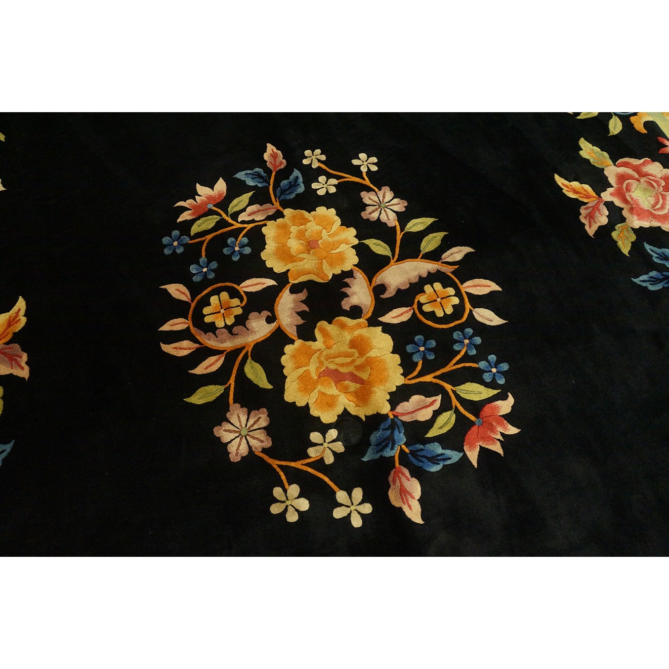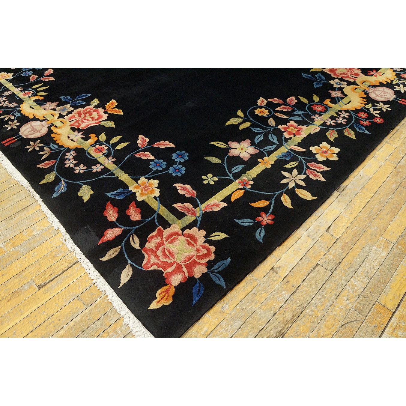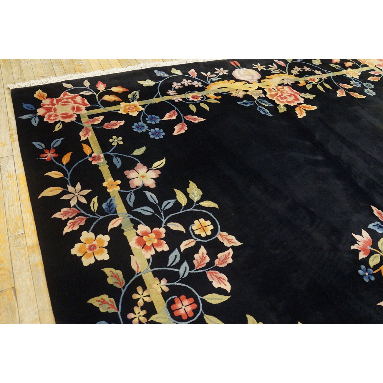 DescriptionChineseCarpets made in China proper. See entries Ningshia, Peking, Art Deco. Chinese - Art DecoAs the name implies, pieces woven between the wars for the Western market by mostly American owned firms especially Nichols and Fette, in thick heavy weaves using strong colors, asymmetric patterns and downplaying the Chinese-ness of the carpet. Nichols rugs are more strong toned than the pastel Fette. Most were woven in the coastal port city of Tientsin. Other lesser known workshops were also active. Some pieces are ultra-geometric and haute-Deco moderne in character: these are very rare. More frequent are pieces with bits of Chinese ornament: vases or other precious objects, paeonies, vines, fences, etc. Most common is the 9 x 12 size, in colors never found in mainstream Chinese rugs: backgrounds in black, mauve, purple, hot pink, orange, olive, employing the best synthetic chrome dyes of the period. Prices are still reasonable and carpets in top condition are available. | |