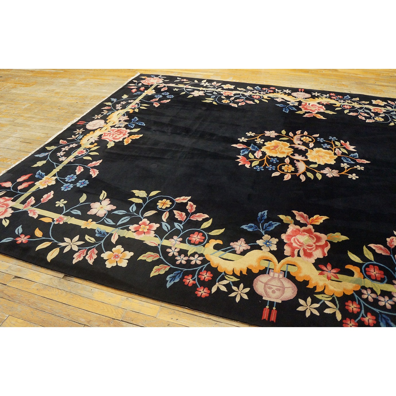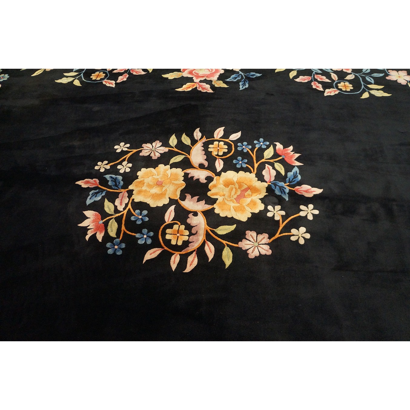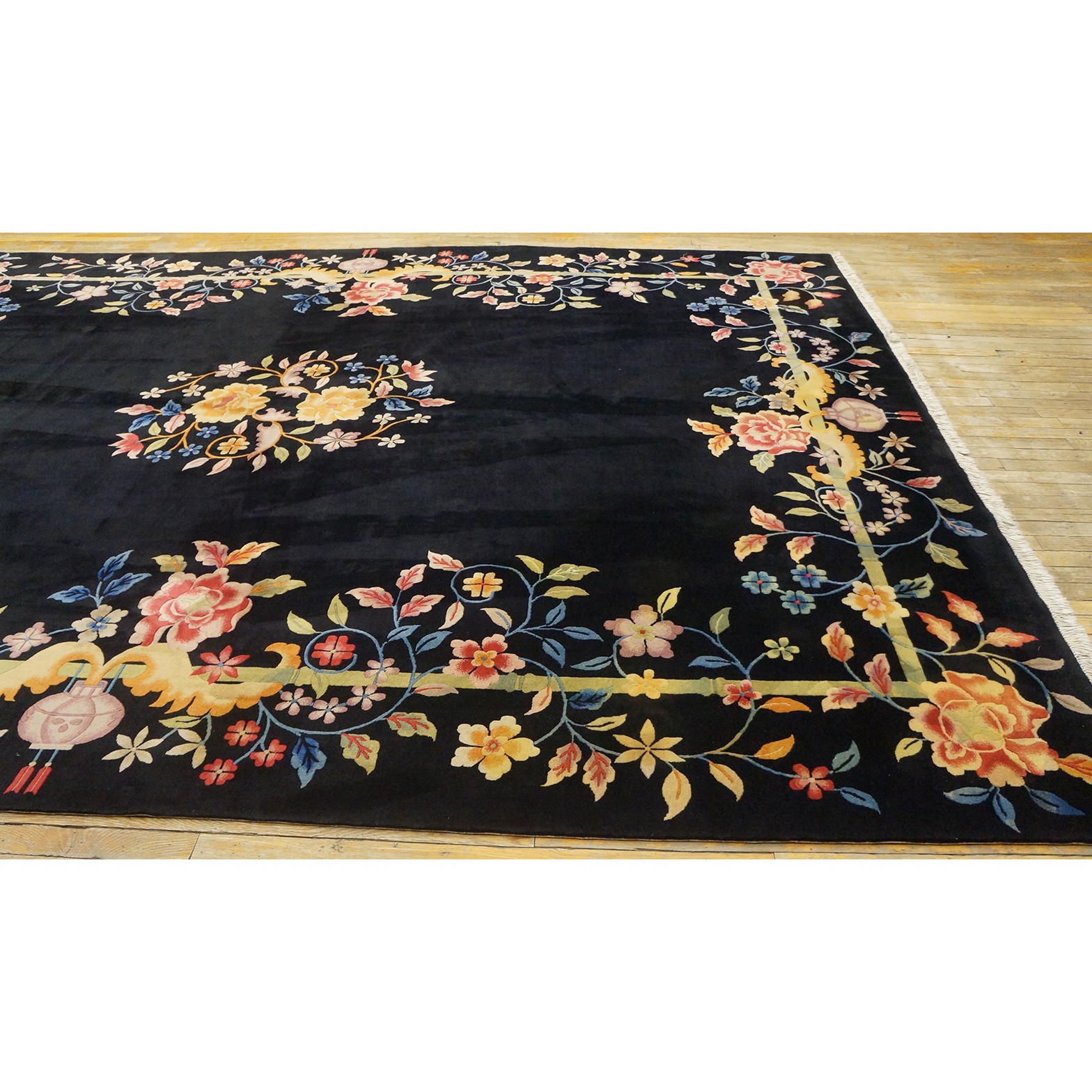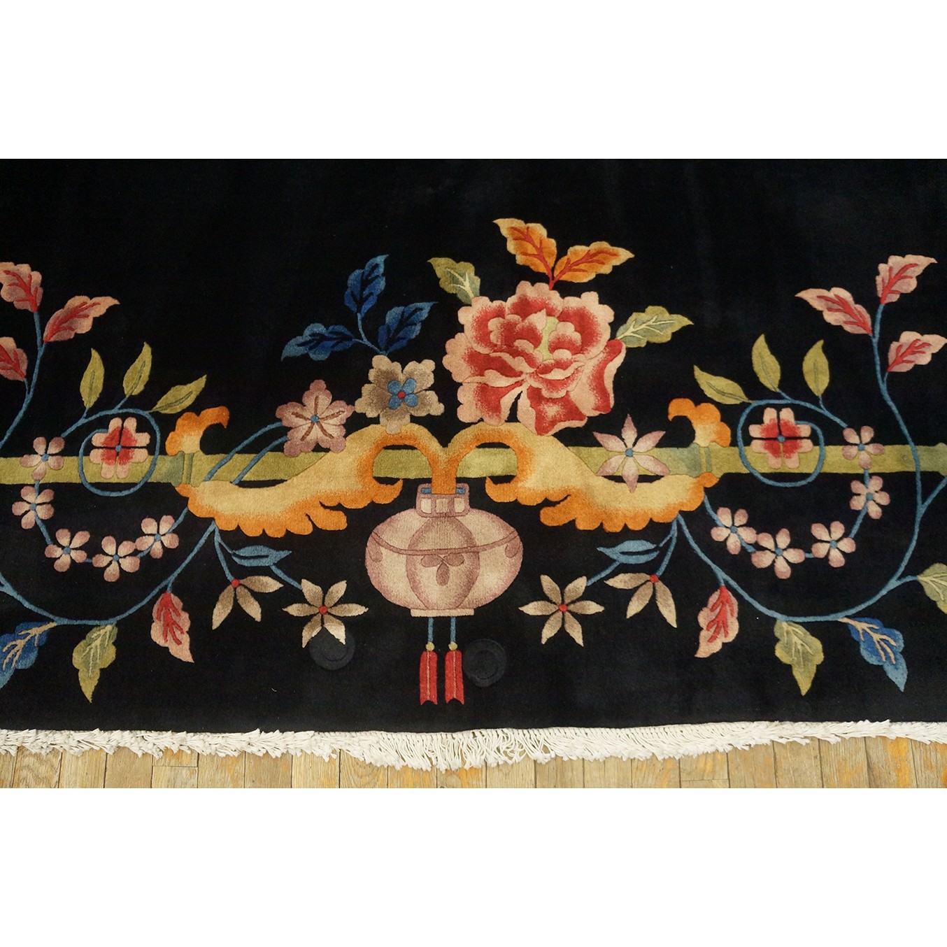 DescriptionChineseCarpets made in China proper. See entries Ningshia, Peking, Art Deco. Chinese - Art DecoAs the name implies, pieces woven between the wars for the Western market by mostly American owned firms especially Nichols and Fette, in thick heavy weaves using strong colors, asymmetric patterns and downplaying the Chinese-ness of the carpet. Nichols rugs are more strong toned than the pastel Fette. Most were woven in the coastal port city of Tientsin. Other lesser known workshops were also active. Some pieces are ultra-geometric and haute-Deco moderne in character: these are very rare. More frequent are pieces with bits of Chinese ornament: vases or other precious objects, paeonies, vines, fences, etc. Most common is the 9 x 12 size, in colors never found in mainstream Chinese rugs: backgrounds in black, mauve, purple, hot pink, orange, olive, employing the best synthetic chrome dyes of the period. Prices are still reasonable and carpets in top condition are available. | |