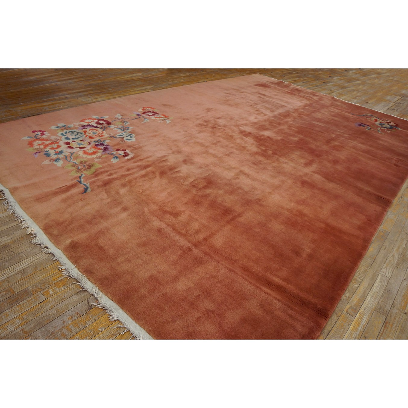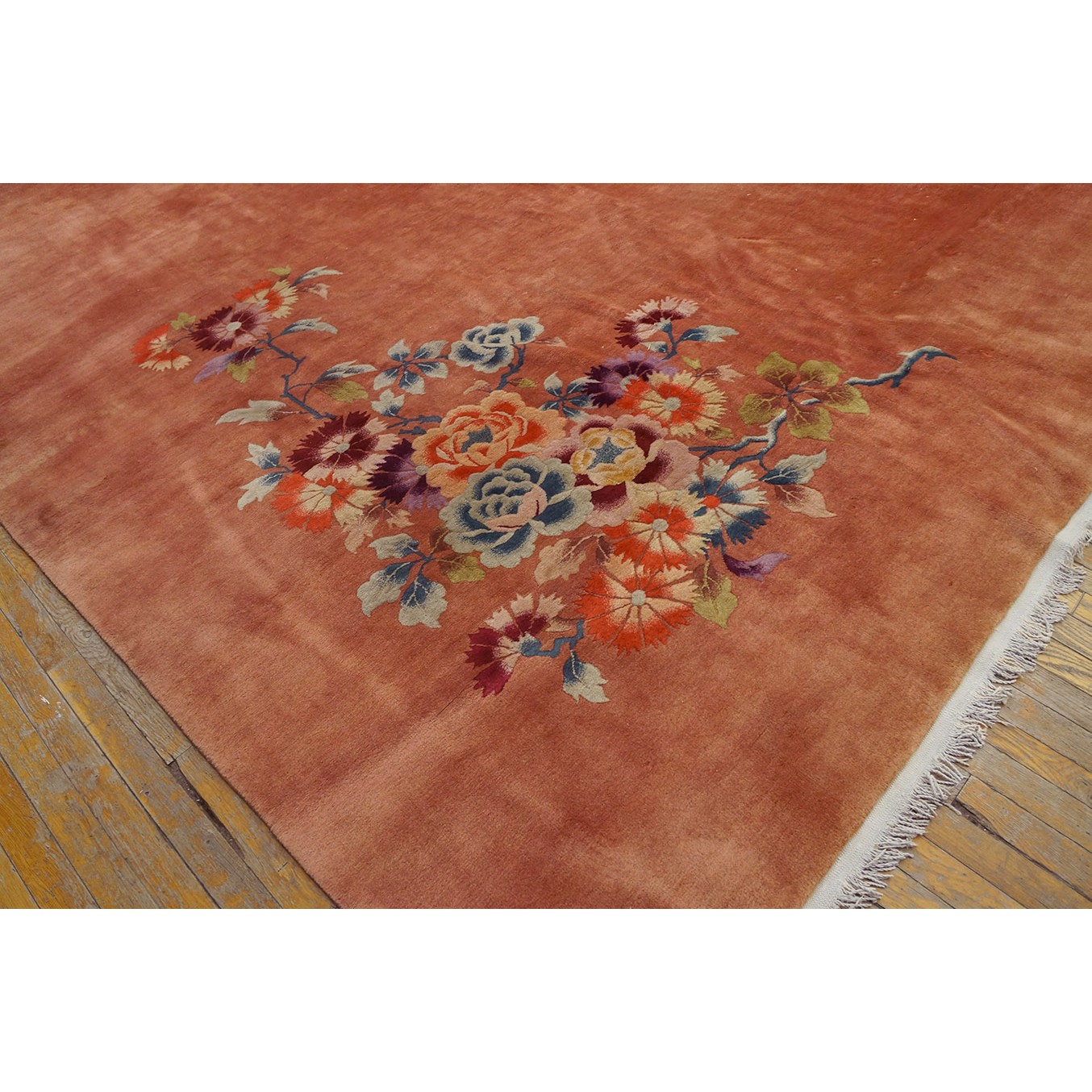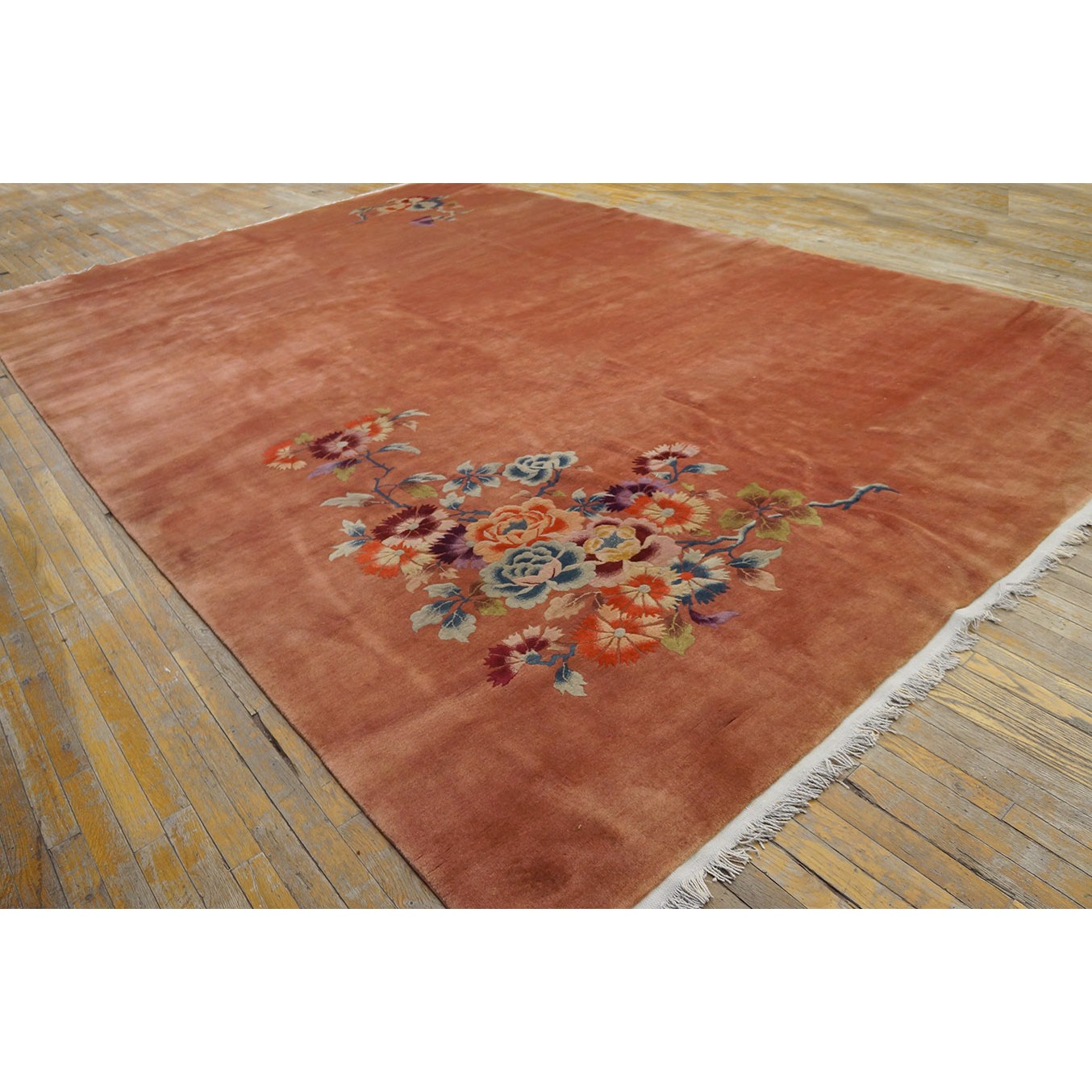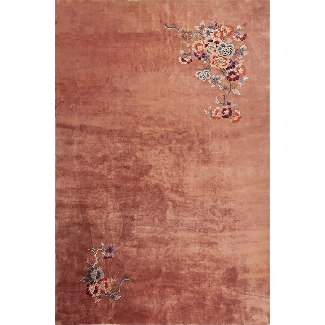 DescriptionChineseCarpets made in China proper. See entries Ningshia, Peking, Art Deco. Chinese - Art DecoAs the name implies, pieces woven between the wars for the Western market by mostly American owned firms especially Nichols and Fette, in thick heavy weaves using strong colors, asymmetric patterns and downplaying the Chinese-ness of the carpet. Nichols rugs are more strong toned than the pastel Fette. Most were woven in the coastal port city of Tientsin. Other lesser known workshops were also active. Some pieces are ultra-geometric and haute-Deco moderne in character: these are very rare. More frequent are pieces with bits of Chinese ornament: vases or other precious objects, paeonies, vines, fences, etc. Most common is the 9 x 12 size, in colors never found in mainstream Chinese rugs: backgrounds in black, mauve, purple, hot pink, orange, olive, employing the best synthetic chrome dyes of the period. Prices are still reasonable and carpets in top condition are available. | |