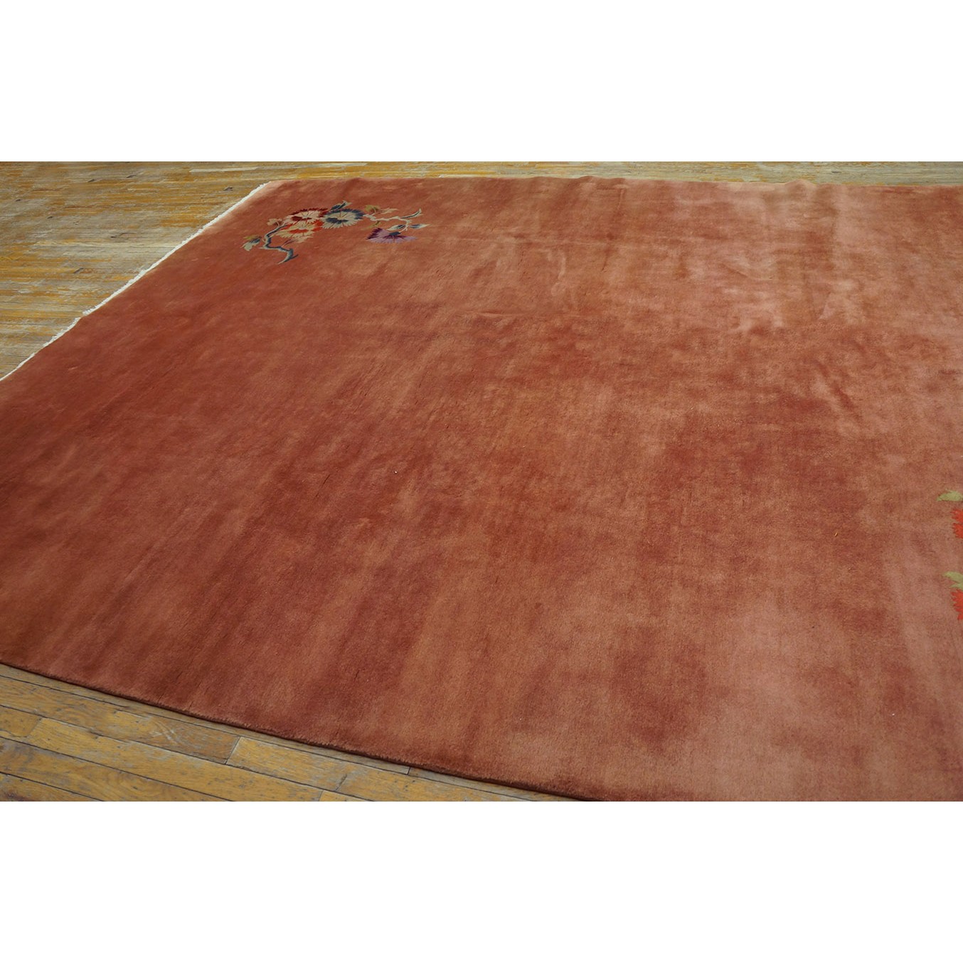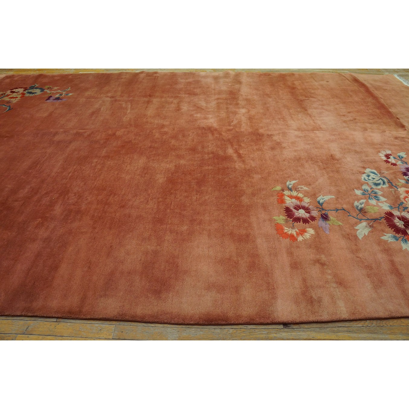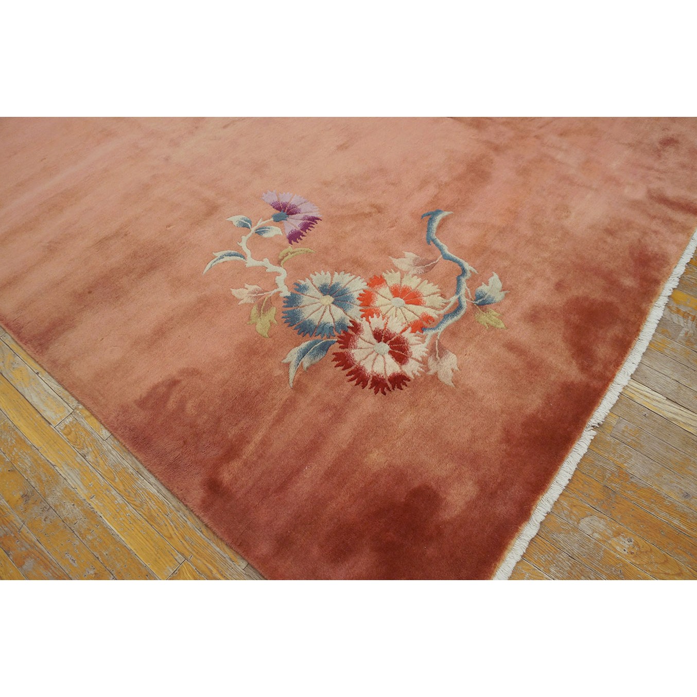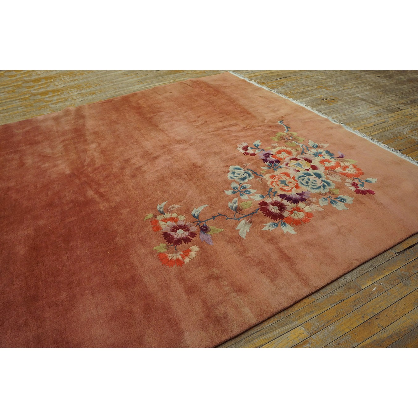 DescriptionChineseCarpets made in China proper. See entries Ningshia, Peking, Art Deco. Chinese - Art DecoAs the name implies, pieces woven between the wars for the Western market by mostly American owned firms especially Nichols and Fette, in thick heavy weaves using strong colors, asymmetric patterns and downplaying the Chinese-ness of the carpet. Nichols rugs are more strong toned than the pastel Fette. Most were woven in the coastal port city of Tientsin. Other lesser known workshops were also active. Some pieces are ultra-geometric and haute-Deco moderne in character: these are very rare. More frequent are pieces with bits of Chinese ornament: vases or other precious objects, paeonies, vines, fences, etc. Most common is the 9 x 12 size, in colors never found in mainstream Chinese rugs: backgrounds in black, mauve, purple, hot pink, orange, olive, employing the best synthetic chrome dyes of the period. Prices are still reasonable and carpets in top condition are available. | |