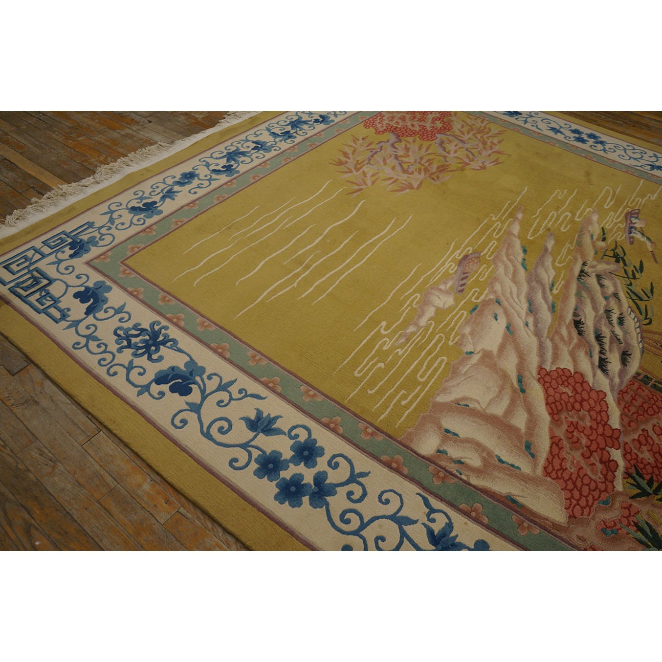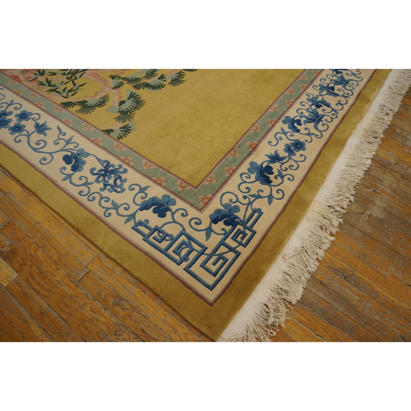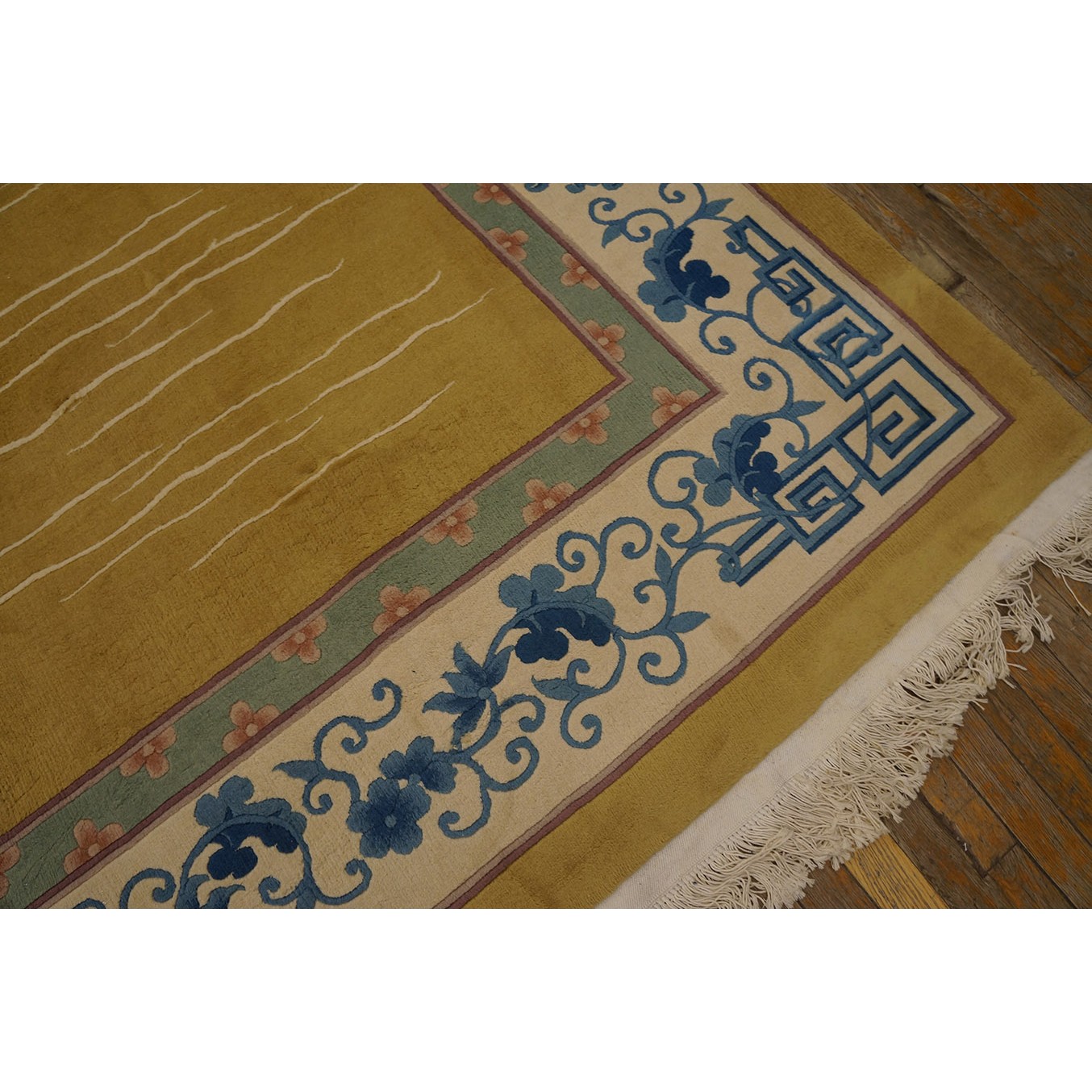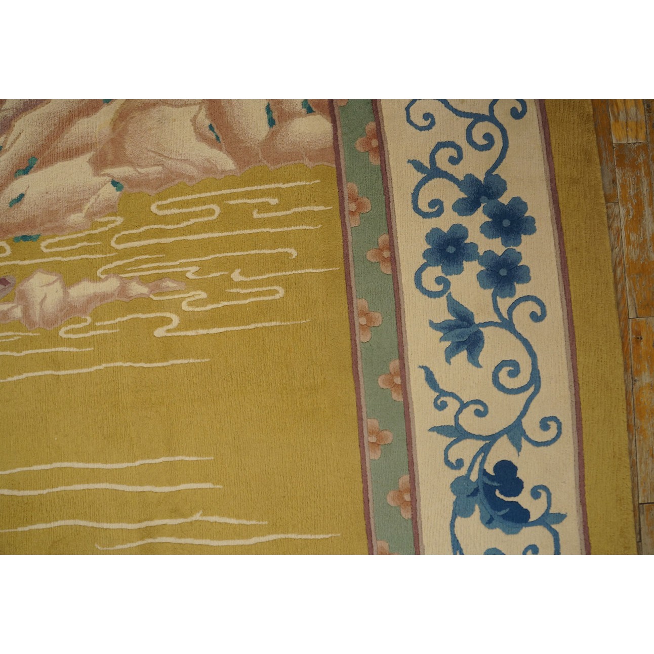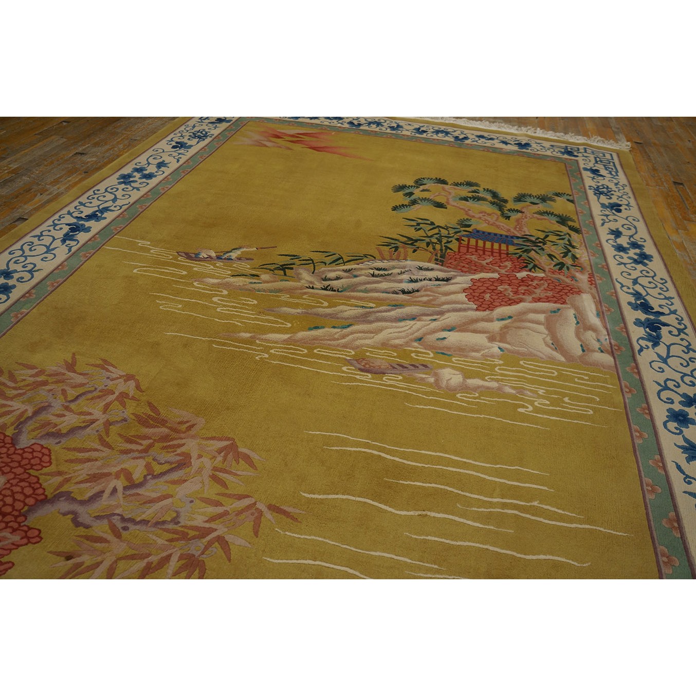 DescriptionChineseCarpets made in China proper. See entries Ningshia, Peking, Art Deco. Chinese - Art DecoAs the name implies, pieces woven between the wars for the Western market by mostly American owned firms especially Nichols and Fette, in thick heavy weaves using strong colors, asymmetric patterns and downplaying the Chinese-ness of the carpet. Nichols rugs are more strong toned than the pastel Fette. Most were woven in the coastal port city of Tientsin. Other lesser known workshops were also active. Some pieces are ultra-geometric and haute-Deco moderne in character: these are very rare. More frequent are pieces with bits of Chinese ornament: vases or other precious objects, paeonies, vines, fences, etc. Most common is the 9 x 12 size, in colors never found in mainstream Chinese rugs: backgrounds in black, mauve, purple, hot pink, orange, olive, employing the best synthetic chrome dyes of the period. Prices are still reasonable and carpets in top condition are available. | |