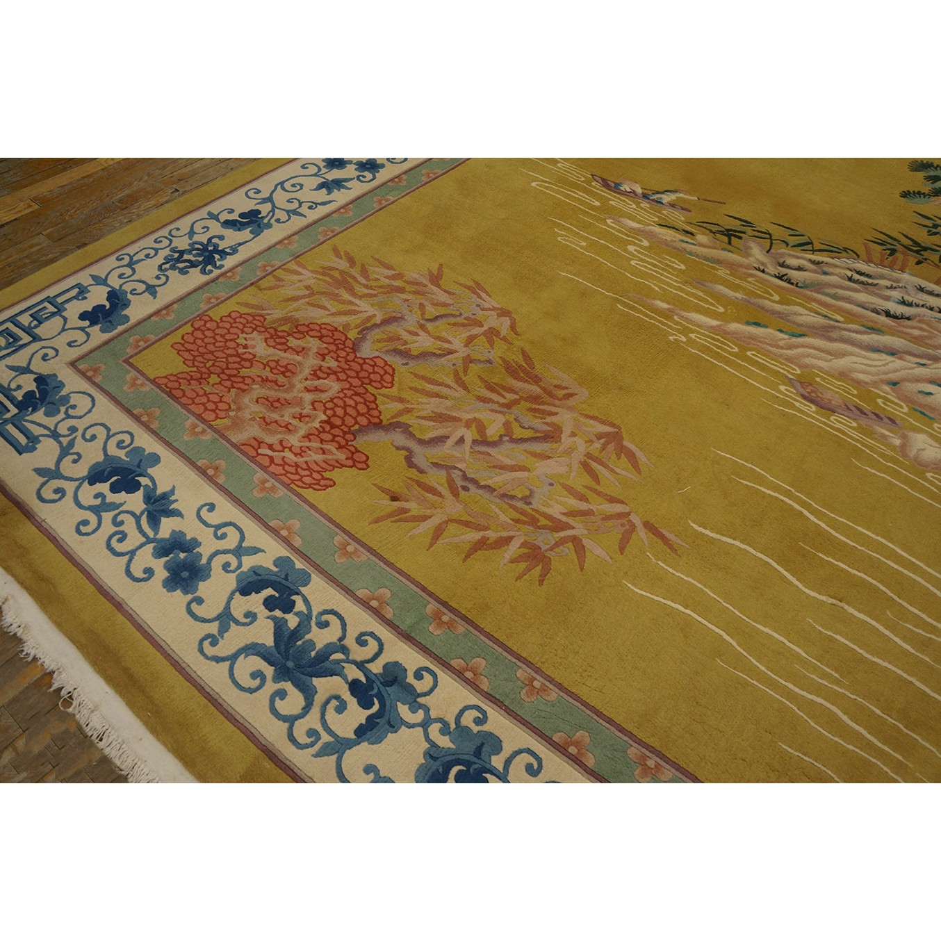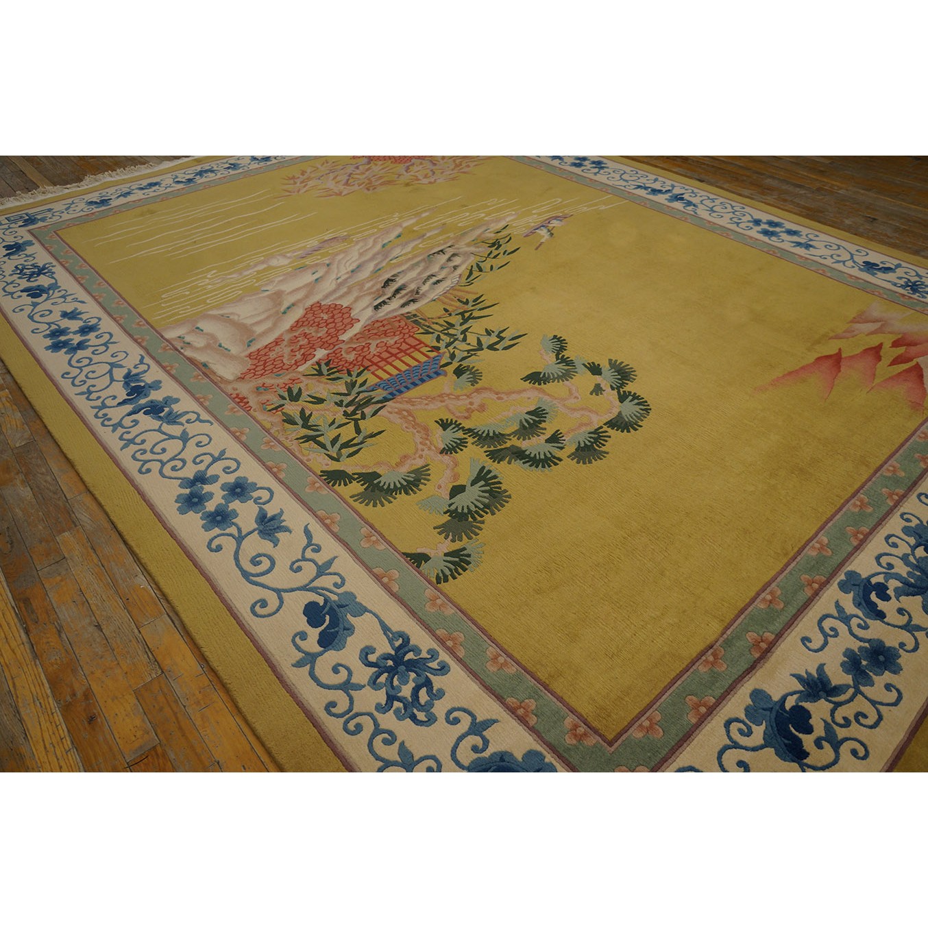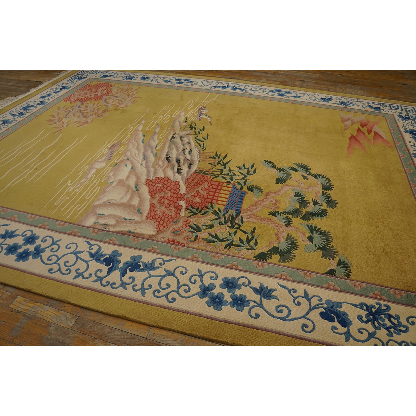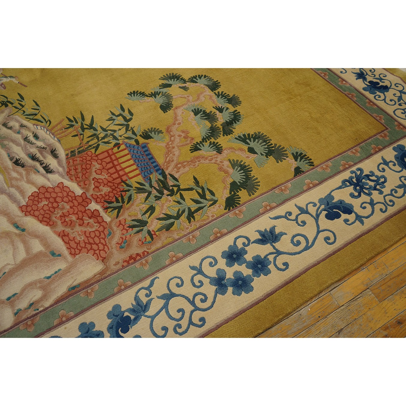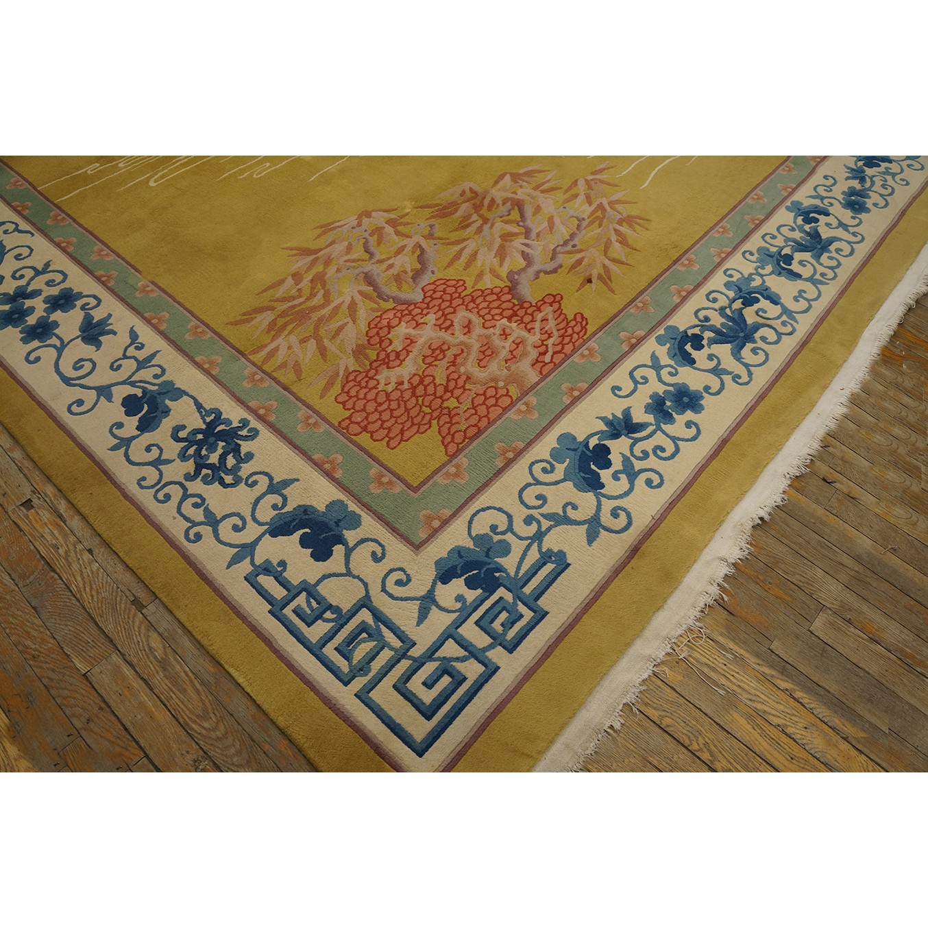 DescriptionChineseCarpets made in China proper. See entries Ningshia, Peking, Art Deco. Chinese - Art DecoAs the name implies, pieces woven between the wars for the Western market by mostly American owned firms especially Nichols and Fette, in thick heavy weaves using strong colors, asymmetric patterns and downplaying the Chinese-ness of the carpet. Nichols rugs are more strong toned than the pastel Fette. Most were woven in the coastal port city of Tientsin. Other lesser known workshops were also active. Some pieces are ultra-geometric and haute-Deco moderne in character: these are very rare. More frequent are pieces with bits of Chinese ornament: vases or other precious objects, paeonies, vines, fences, etc. Most common is the 9 x 12 size, in colors never found in mainstream Chinese rugs: backgrounds in black, mauve, purple, hot pink, orange, olive, employing the best synthetic chrome dyes of the period. Prices are still reasonable and carpets in top condition are available. | |
