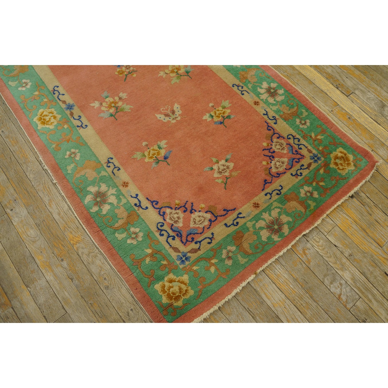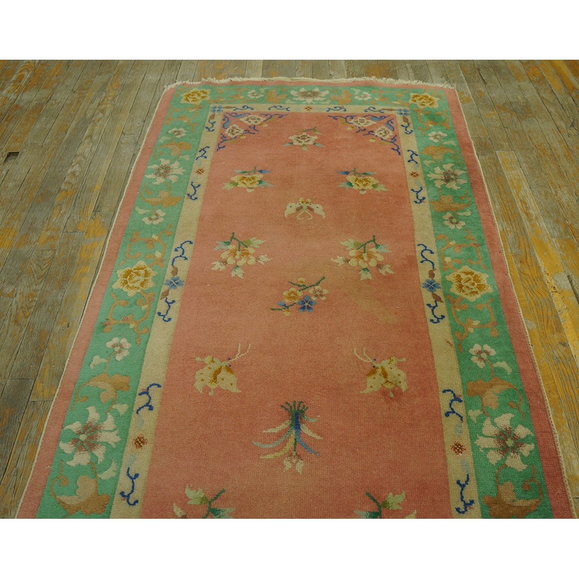 DescriptionChineseCarpets made in China proper. See entries Ningshia, Peking, Art Deco. Chinese - Art DecoAs the name implies, pieces woven between the wars for the Western market by mostly American owned firms especially Nichols and Fette, in thick heavy weaves using strong colors, asymmetric patterns and downplaying the Chinese-ness of the carpet. Nichols rugs are more strong toned than the pastel Fette. Most were woven in the coastal port city of Tientsin. Other lesser known workshops were also active. Some pieces are ultra-geometric and haute-Deco moderne in character: these are very rare. More frequent are pieces with bits of Chinese ornament: vases or other precious objects, paeonies, vines, fences, etc. Most common is the 9 x 12 size, in colors never found in mainstream Chinese rugs: backgrounds in black, mauve, purple, hot pink, orange, olive, employing the best synthetic chrome dyes of the period. Prices are still reasonable and carpets in top condition are available. | |