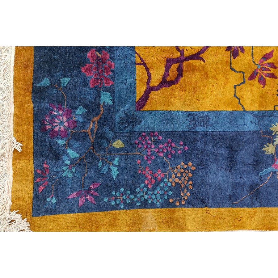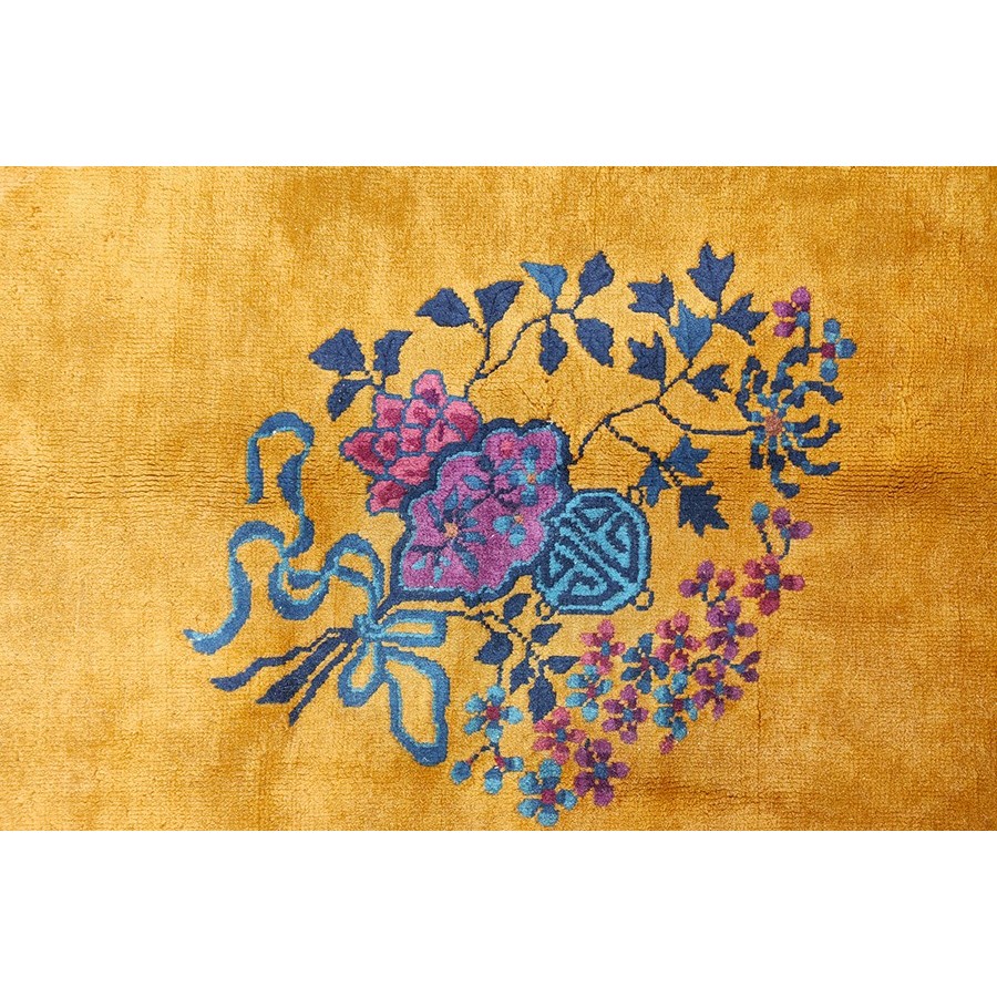 DescriptionChineseCarpets made in China proper. See entries Ningshia, Peking, Art Deco. Chinese - Art DecoAs the name implies, pieces woven between the wars for the Western market by mostly American owned firms especially Nichols and Fette, in thick heavy weaves using strong colors, asymmetric patterns and downplaying the Chinese-ness of the carpet. Nichols rugs are more strong toned than the pastel Fette. Most were woven in the coastal port city of Tientsin. Other lesser known workshops were also active. Some pieces are ultra-geometric and haute-Deco moderne in character: these are very rare. More frequent are pieces with bits of Chinese ornament: vases or other precious objects, paeonies, vines, fences, etc. Most common is the 9 x 12 size, in colors never found in mainstream Chinese rugs: backgrounds in black, mauve, purple, hot pink, orange, olive, employing the best synthetic chrome dyes of the period. Prices are still reasonable and carpets in top condition are available. | |