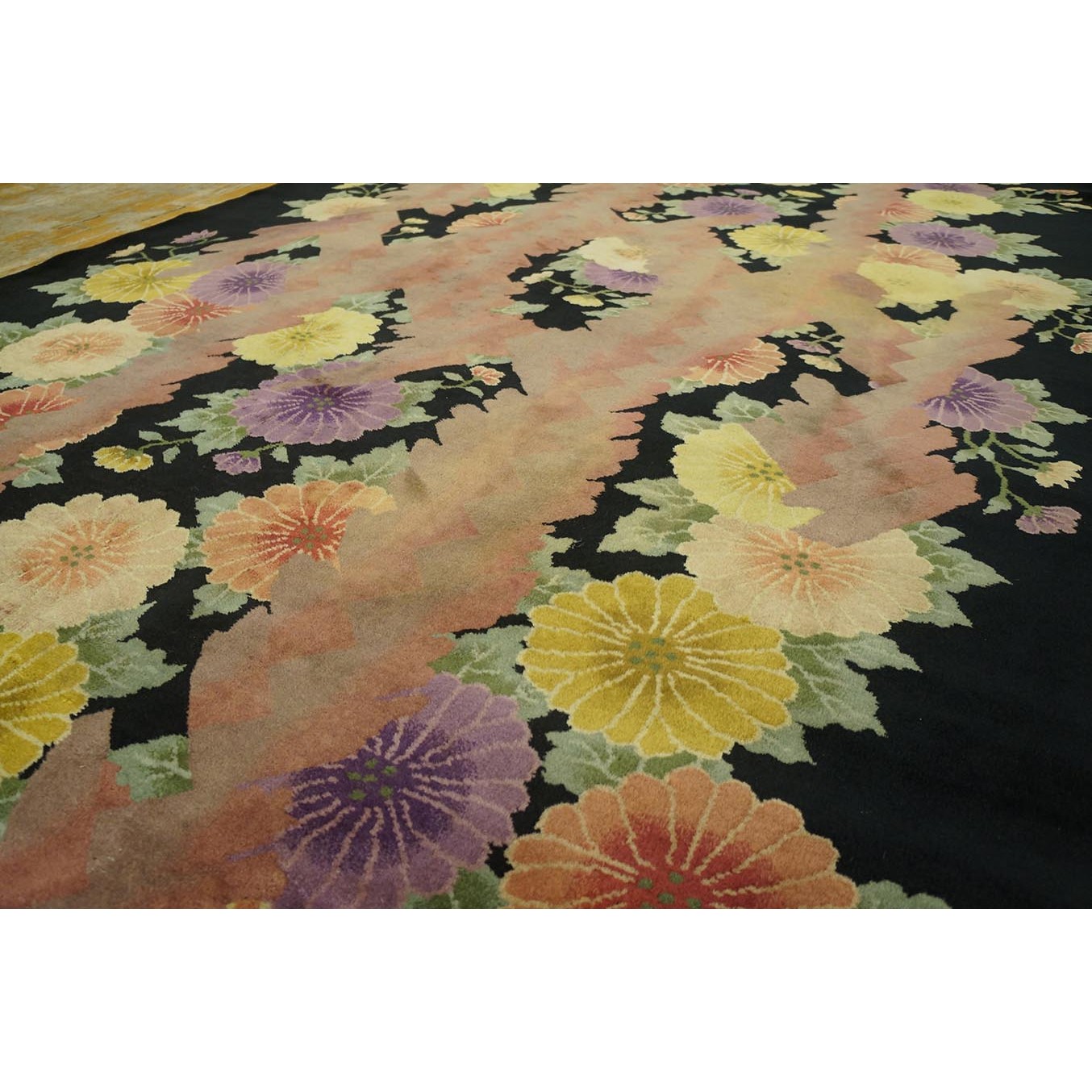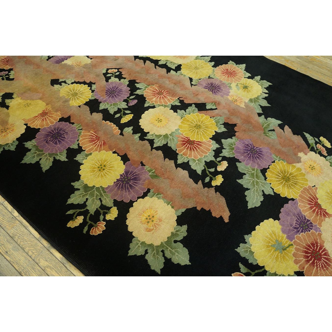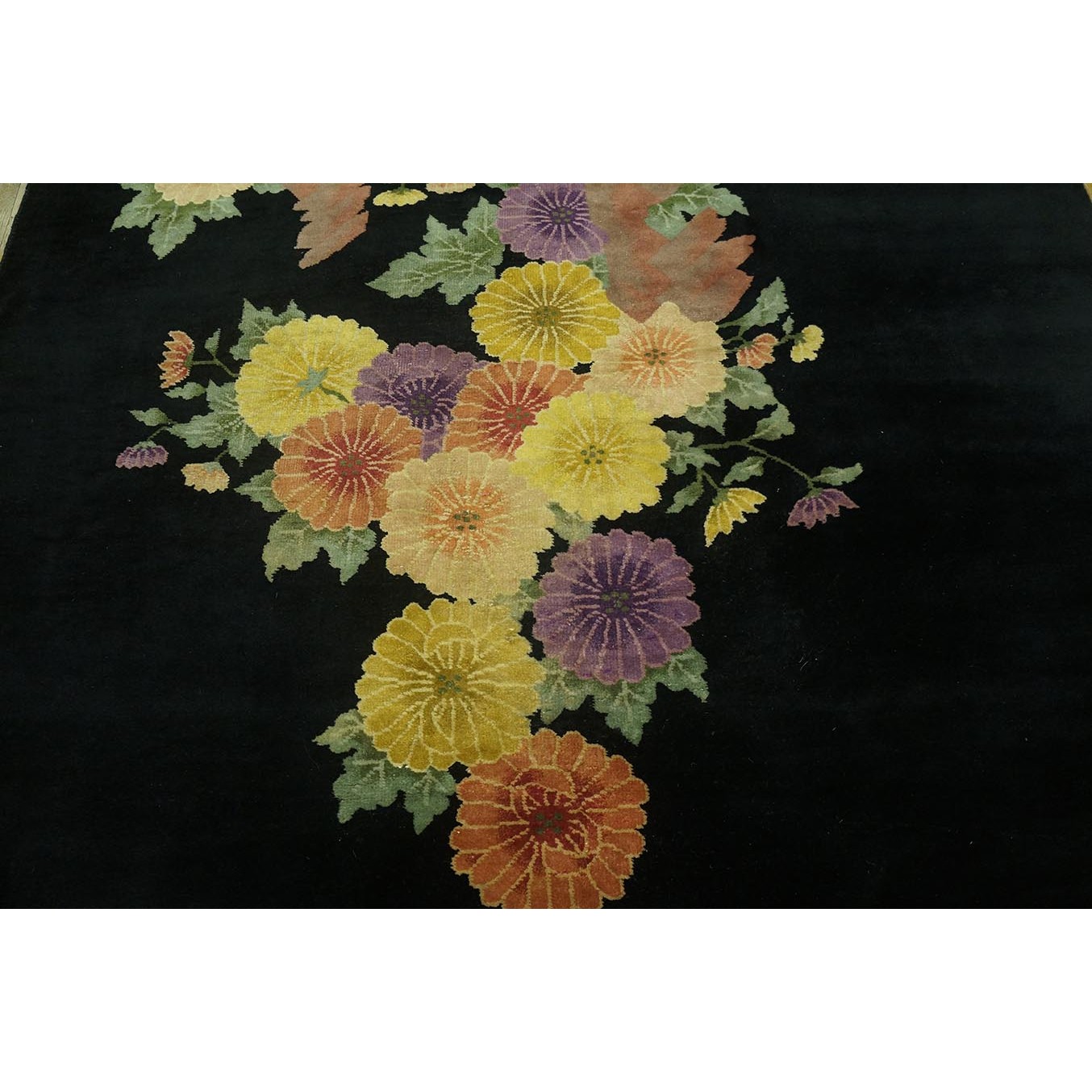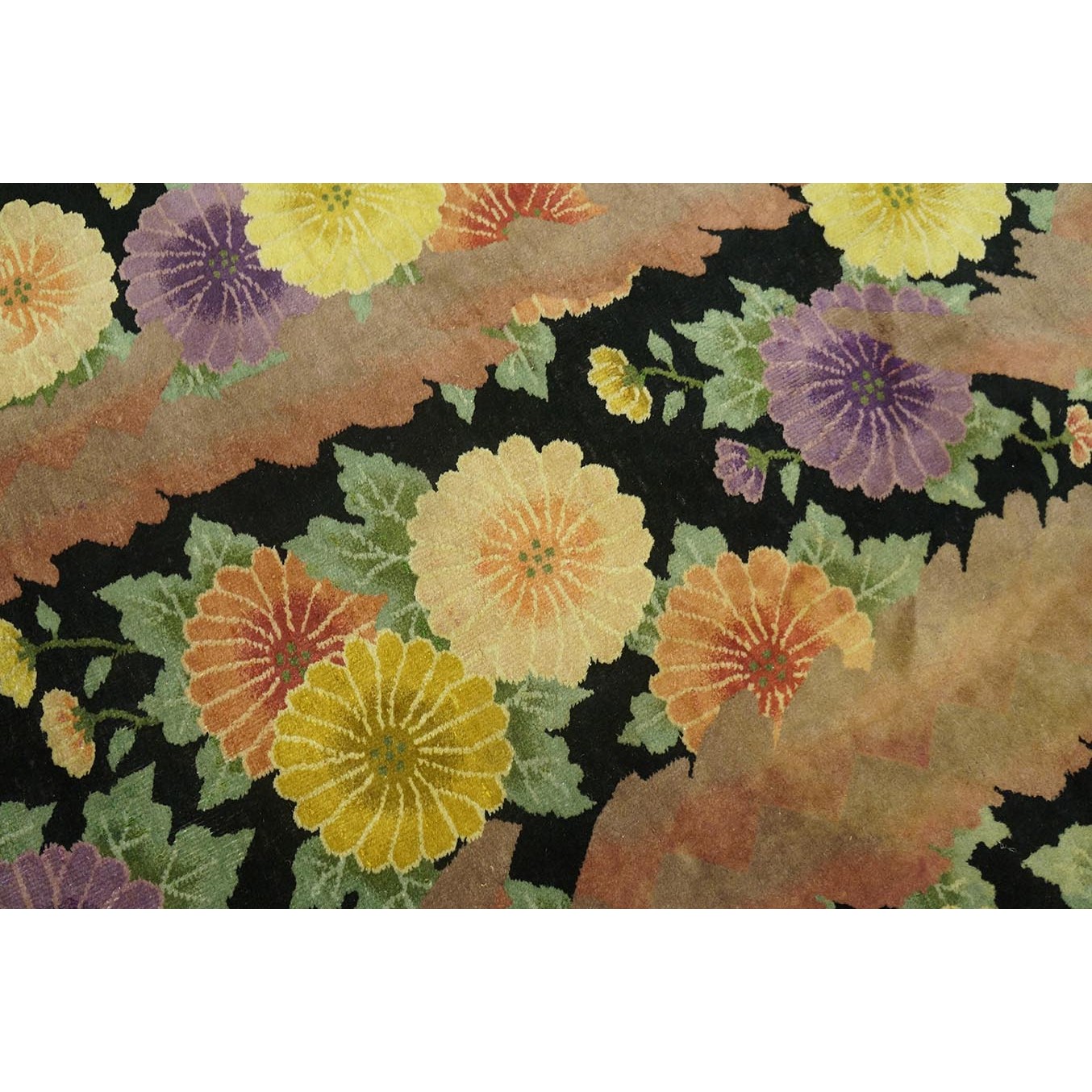 DescriptionChineseCarpets made in China proper. See entries Ningshia, Peking, Art Deco. Chinese - Art DecoAs the name implies, pieces woven between the wars for the Western market by mostly American owned firms especially Nichols and Fette, in thick heavy weaves using strong colors, asymmetric patterns and downplaying the Chinese-ness of the carpet. Nichols rugs are more strong toned than the pastel Fette. Most were woven in the coastal port city of Tientsin. Other lesser known workshops were also active. Some pieces are ultra-geometric and haute-Deco moderne in character: these are very rare. More frequent are pieces with bits of Chinese ornament: vases or other precious objects, paeonies, vines, fences, etc. Most common is the 9 x 12 size, in colors never found in mainstream Chinese rugs: backgrounds in black, mauve, purple, hot pink, orange, olive, employing the best synthetic chrome dyes of the period. Prices are still reasonable and carpets in top condition are available. | |