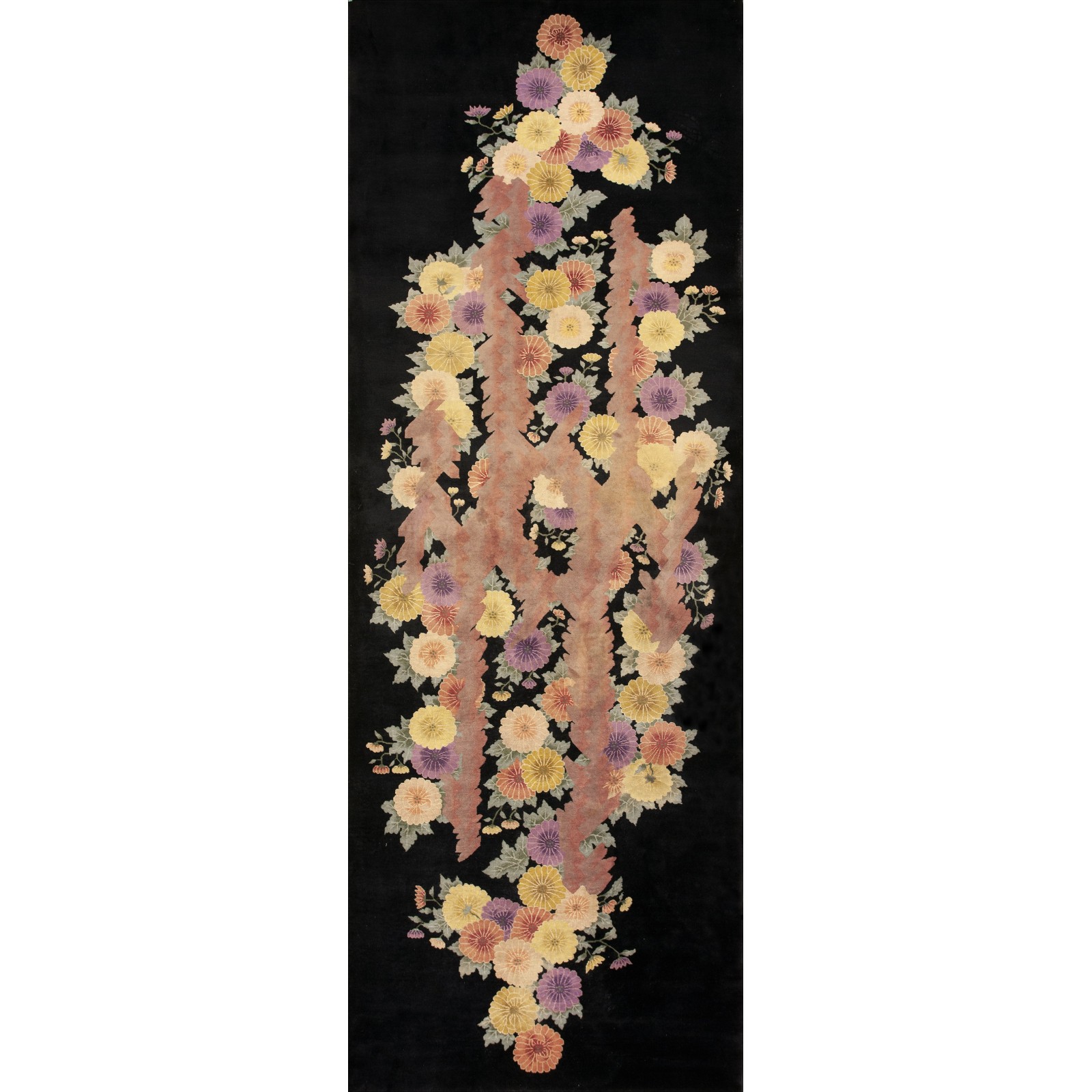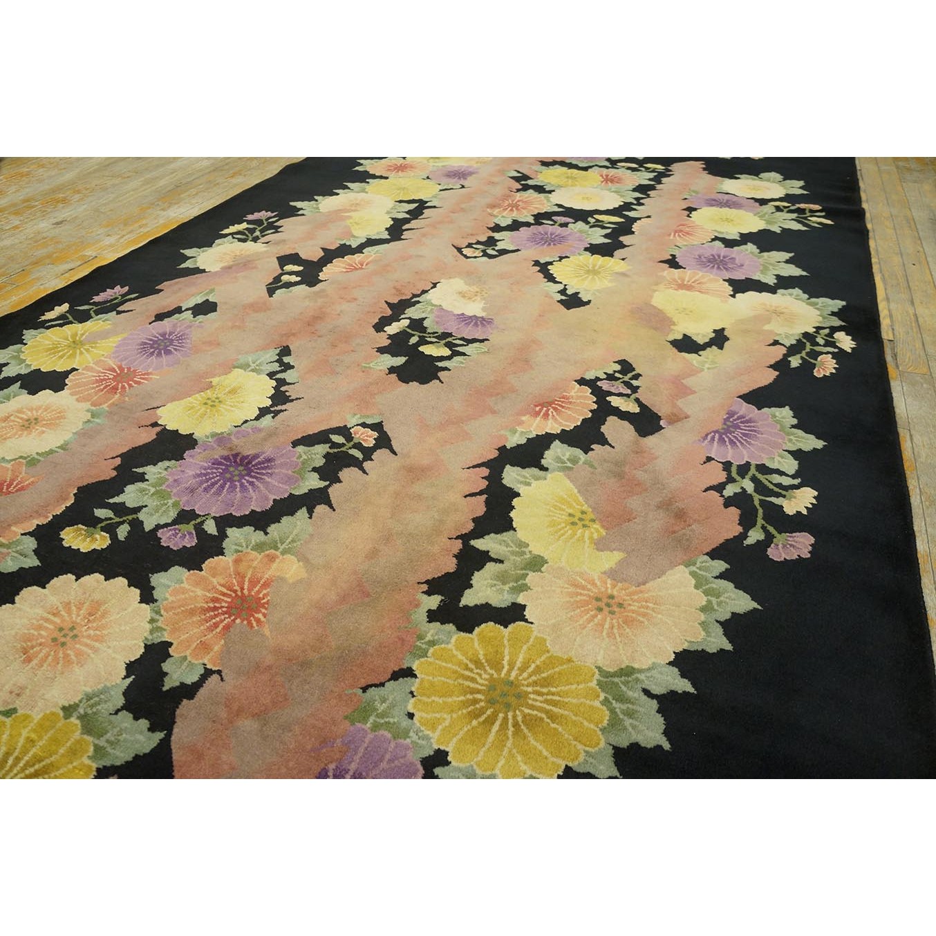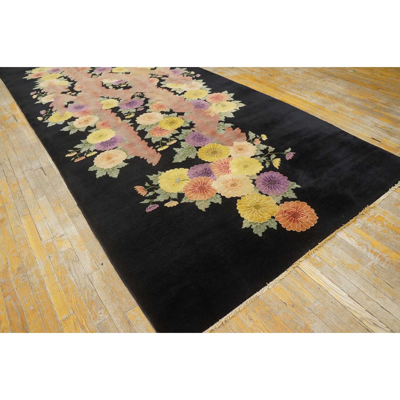 DescriptionChineseCarpets made in China proper. See entries Ningshia, Peking, Art Deco. Chinese - Art DecoAs the name implies, pieces woven between the wars for the Western market by mostly American owned firms especially Nichols and Fette, in thick heavy weaves using strong colors, asymmetric patterns and downplaying the Chinese-ness of the carpet. Nichols rugs are more strong toned than the pastel Fette. Most were woven in the coastal port city of Tientsin. Other lesser known workshops were also active. Some pieces are ultra-geometric and haute-Deco moderne in character: these are very rare. More frequent are pieces with bits of Chinese ornament: vases or other precious objects, paeonies, vines, fences, etc. Most common is the 9 x 12 size, in colors never found in mainstream Chinese rugs: backgrounds in black, mauve, purple, hot pink, orange, olive, employing the best synthetic chrome dyes of the period. Prices are still reasonable and carpets in top condition are available. | |