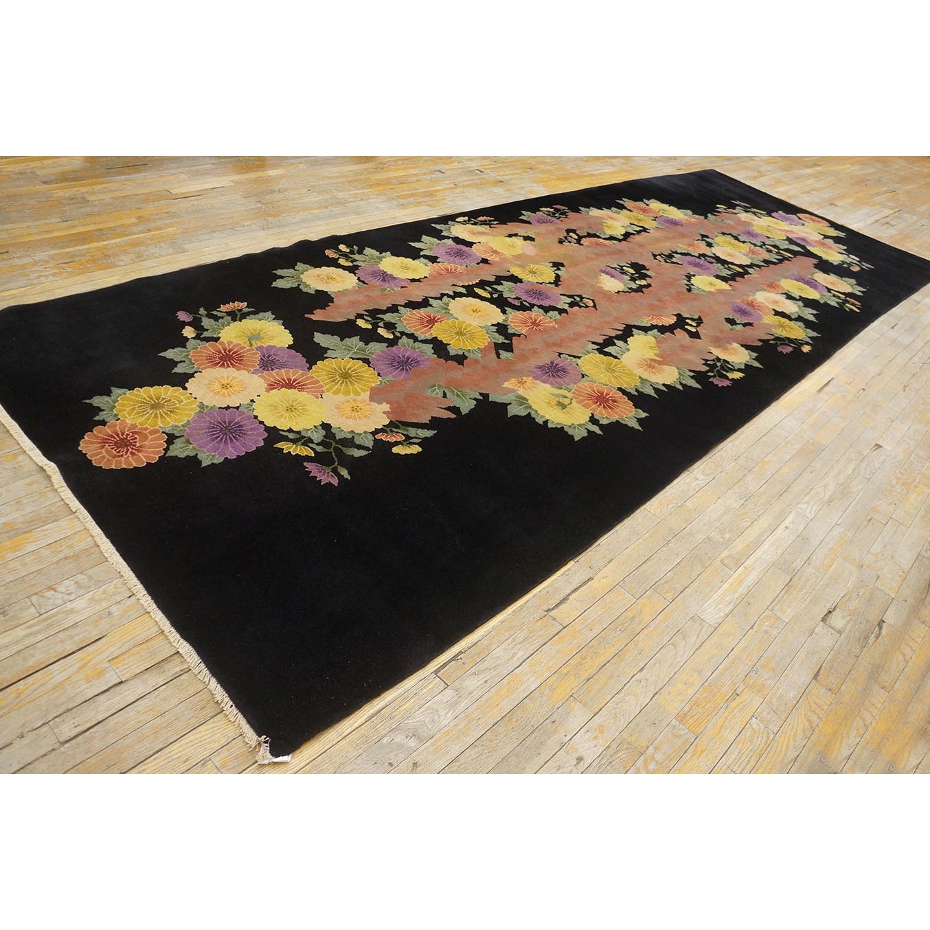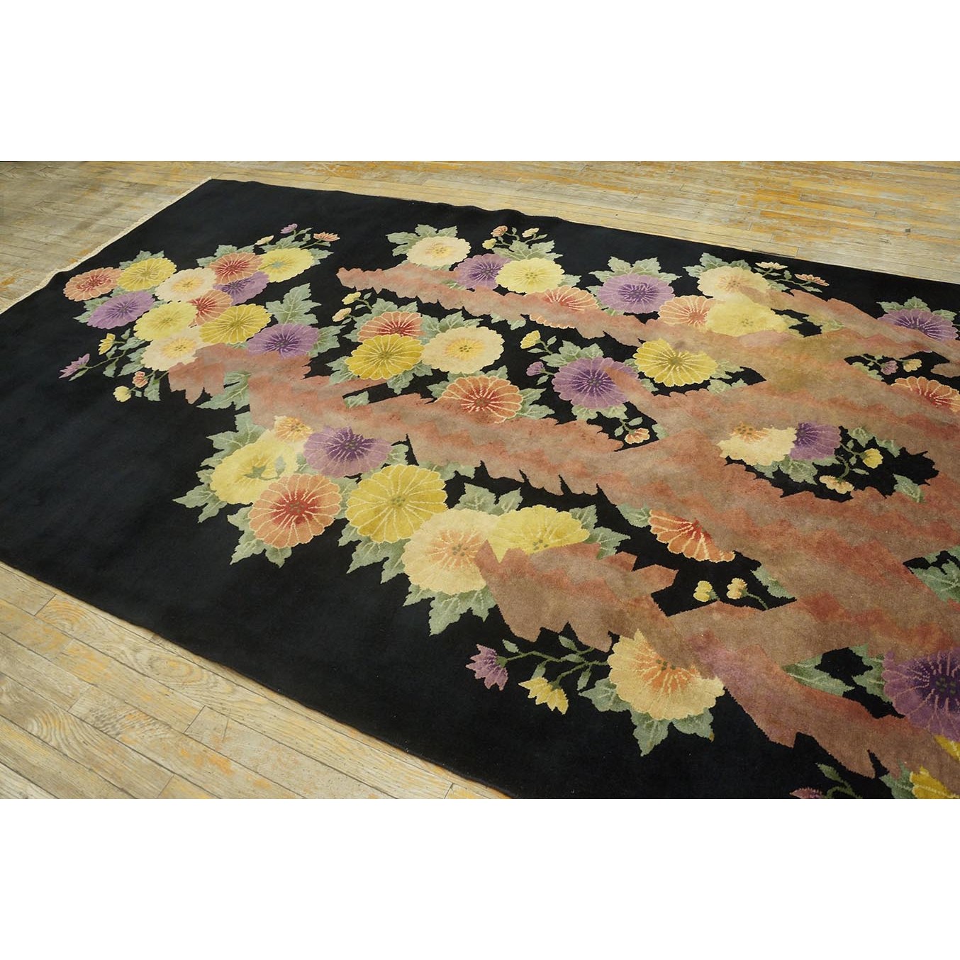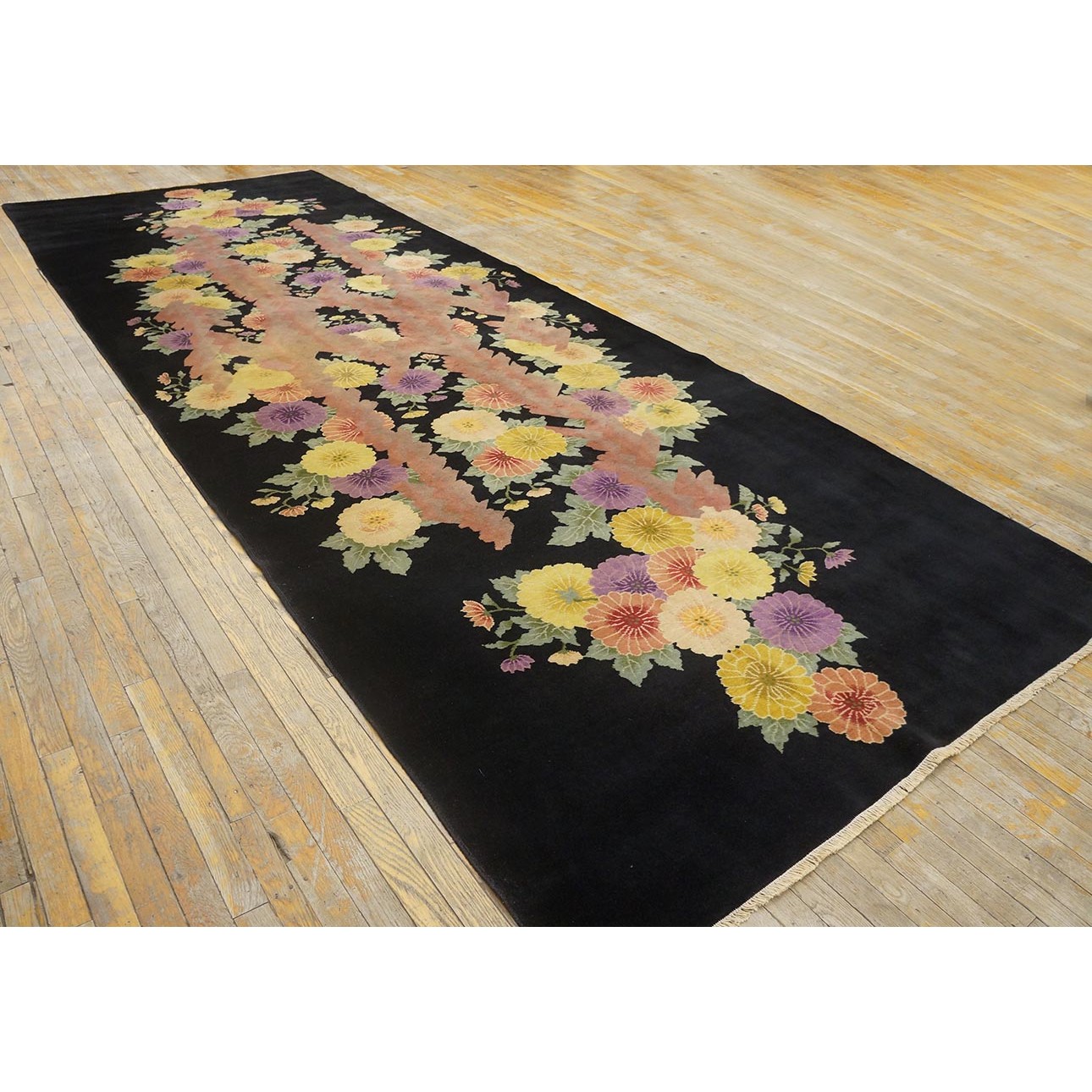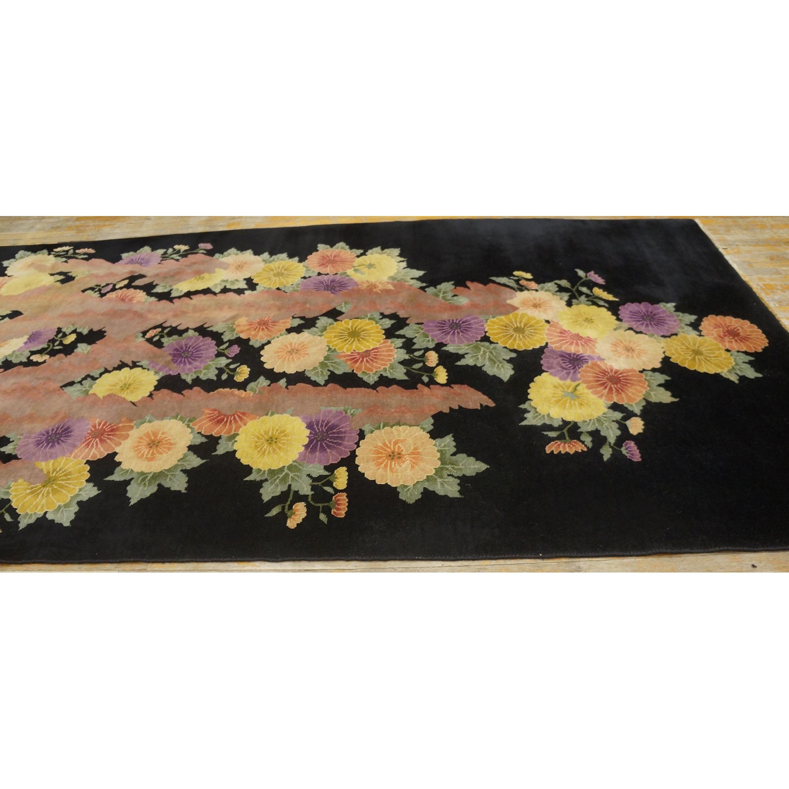 DescriptionChineseCarpets made in China proper. See entries Ningshia, Peking, Art Deco. Chinese - Art DecoAs the name implies, pieces woven between the wars for the Western market by mostly American owned firms especially Nichols and Fette, in thick heavy weaves using strong colors, asymmetric patterns and downplaying the Chinese-ness of the carpet. Nichols rugs are more strong toned than the pastel Fette. Most were woven in the coastal port city of Tientsin. Other lesser known workshops were also active. Some pieces are ultra-geometric and haute-Deco moderne in character: these are very rare. More frequent are pieces with bits of Chinese ornament: vases or other precious objects, paeonies, vines, fences, etc. Most common is the 9 x 12 size, in colors never found in mainstream Chinese rugs: backgrounds in black, mauve, purple, hot pink, orange, olive, employing the best synthetic chrome dyes of the period. Prices are still reasonable and carpets in top condition are available. | |