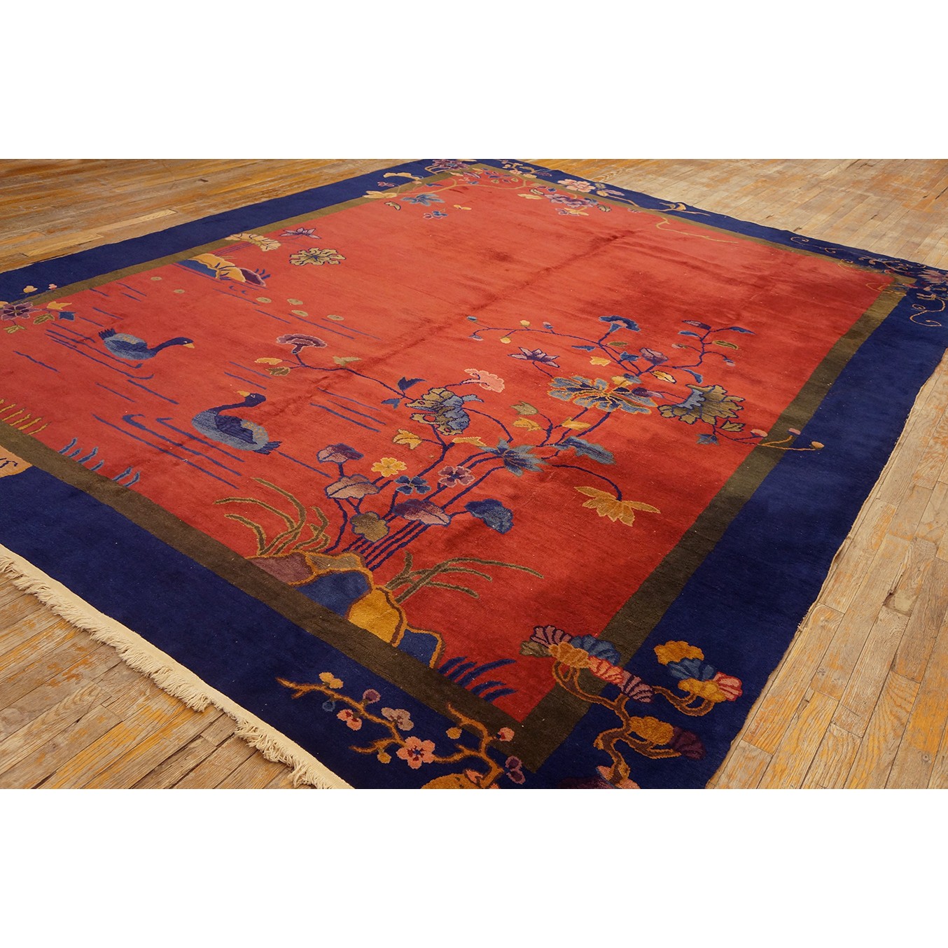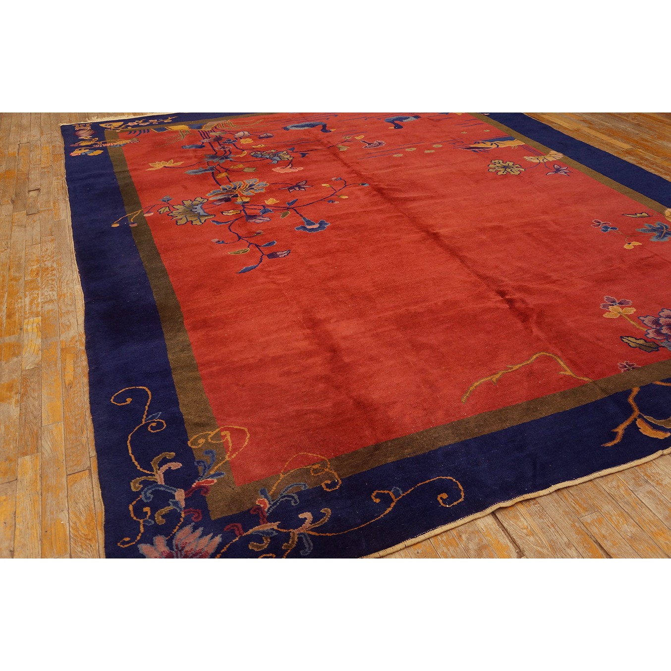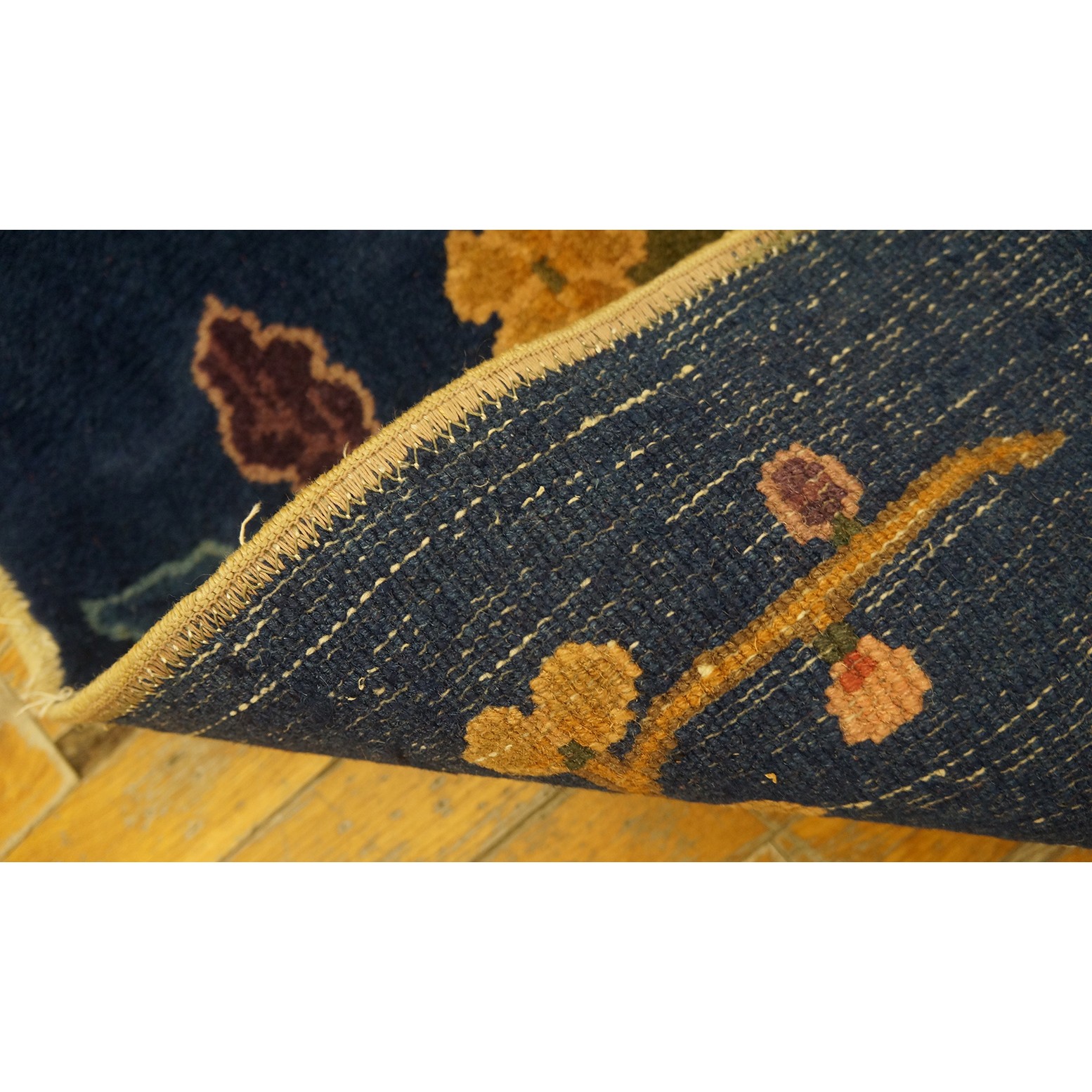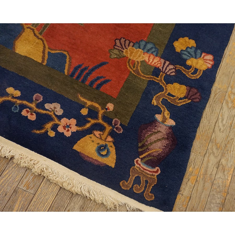 DescriptionChineseCarpets made in China proper. See entries Ningshia, Peking, Art Deco. Chinese - Art DecoAs the name implies, pieces woven between the wars for the Western market by mostly American owned firms especially Nichols and Fette, in thick heavy weaves using strong colors, asymmetric patterns and downplaying the Chinese-ness of the carpet. Nichols rugs are more strong toned than the pastel Fette. Most were woven in the coastal port city of Tientsin. Other lesser known workshops were also active. Some pieces are ultra-geometric and haute-Deco moderne in character: these are very rare. More frequent are pieces with bits of Chinese ornament: vases or other precious objects, paeonies, vines, fences, etc. Most common is the 9 x 12 size, in colors never found in mainstream Chinese rugs: backgrounds in black, mauve, purple, hot pink, orange, olive, employing the best synthetic chrome dyes of the period. Prices are still reasonable and carpets in top condition are available. | |