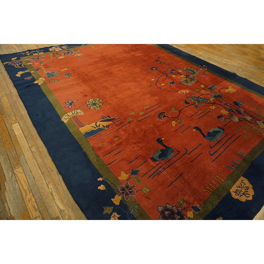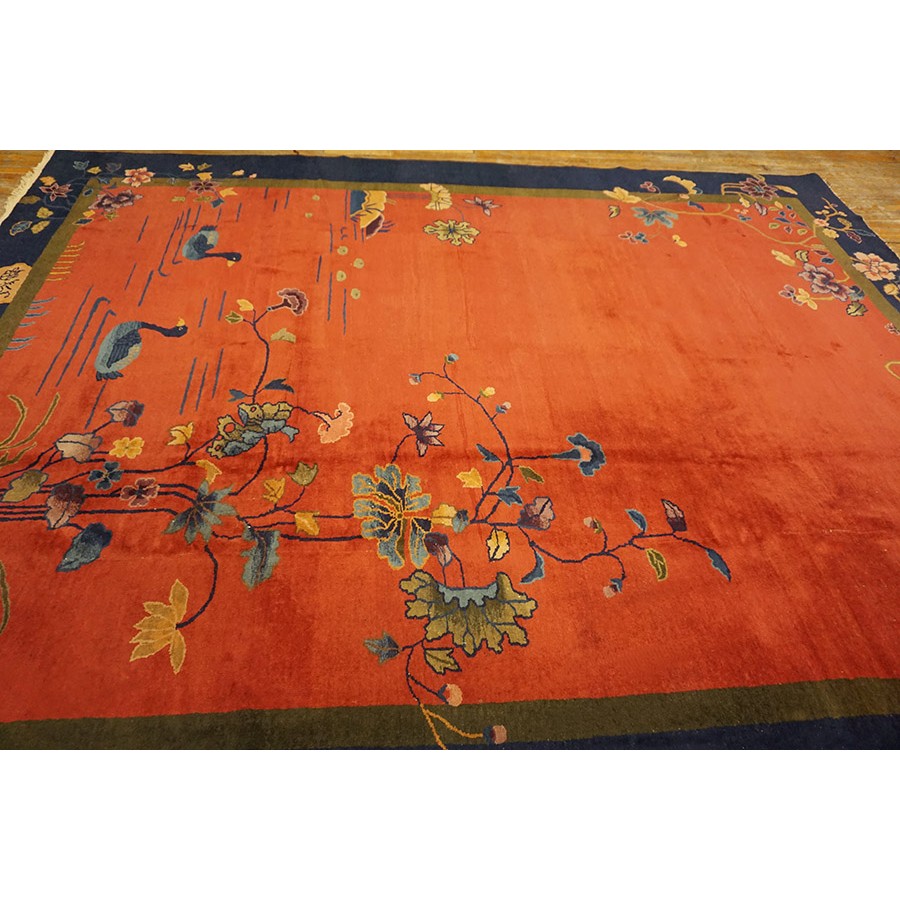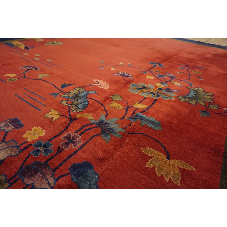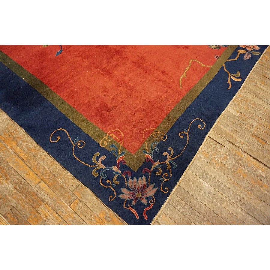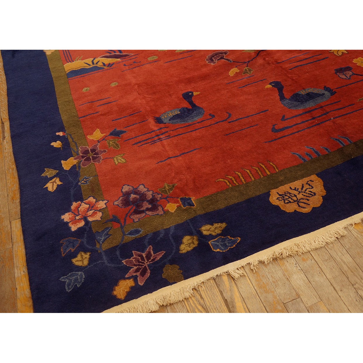 DescriptionChineseCarpets made in China proper. See entries Ningshia, Peking, Art Deco. Chinese - Art DecoAs the name implies, pieces woven between the wars for the Western market by mostly American owned firms especially Nichols and Fette, in thick heavy weaves using strong colors, asymmetric patterns and downplaying the Chinese-ness of the carpet. Nichols rugs are more strong toned than the pastel Fette. Most were woven in the coastal port city of Tientsin. Other lesser known workshops were also active. Some pieces are ultra-geometric and haute-Deco moderne in character: these are very rare. More frequent are pieces with bits of Chinese ornament: vases or other precious objects, paeonies, vines, fences, etc. Most common is the 9 x 12 size, in colors never found in mainstream Chinese rugs: backgrounds in black, mauve, purple, hot pink, orange, olive, employing the best synthetic chrome dyes of the period. Prices are still reasonable and carpets in top condition are available. | |