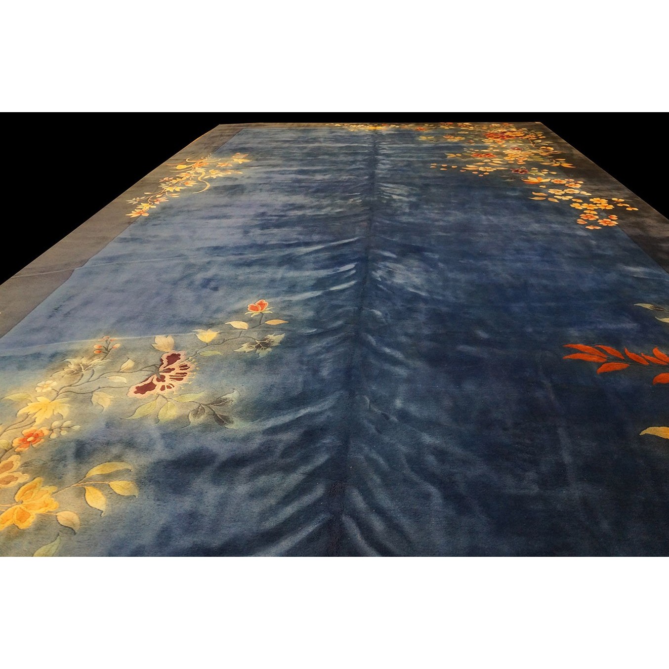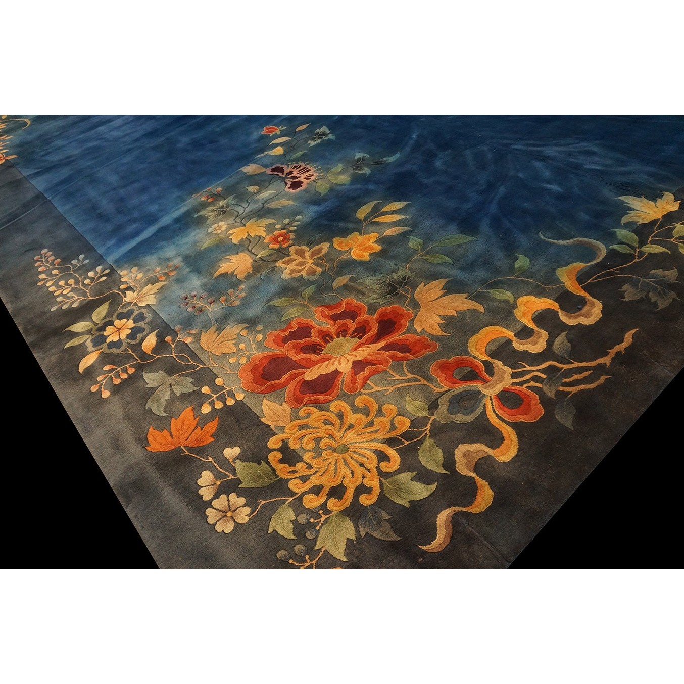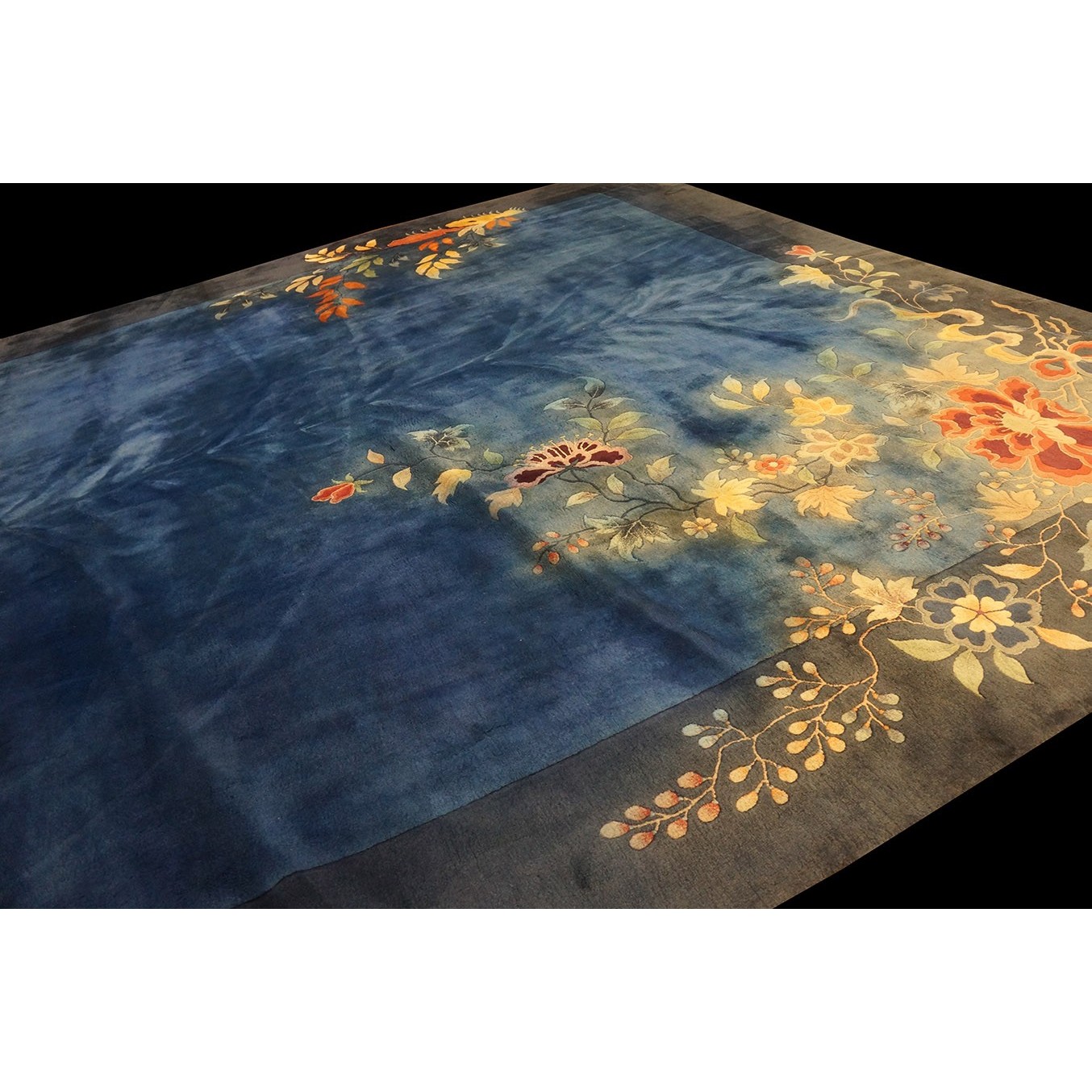 As the name implies, pieces woven between the wars for the Western market by mostly American owned firms especially Nichols and Fette, in thick heavy weaves using strong colors, asymmetric patterns and downplaying the Chinese-ness of the carpet. Nichols rugs are more strong toned than the pastel Fette. Most were woven in the coastal port city of Tientsin. Other lesser known workshops were also active. Some pieces are ultra-geometric and haute-Deco moderne in character: these are very rare. More frequent are pieces with bits of Chinese ornament: vases or other precious objects, paeonies, vines, fences, etc. Most common is the 9’ x 12’ size, in colors never found in mainstream Chinese rugs: backgrounds in black, mauve, purple, hot pink, orange, olive, employing the best synthetic chrome dyes of the period. Prices are still reasonable and carpets in top condition are available.