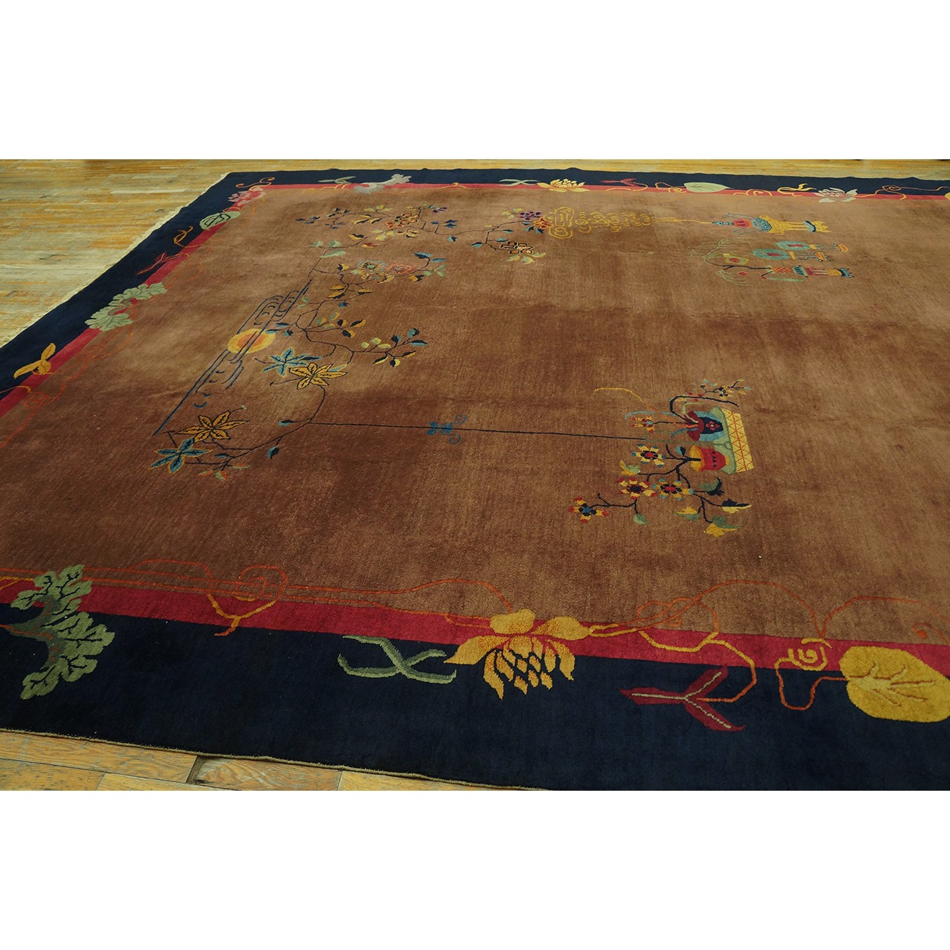 DescriptionChineseCarpets made in China proper. See entries Ningshia, Peking, Art Deco. Chinese - Art DecoAs the name implies, pieces woven between the wars for the Western market by mostly American owned firms especially Nichols and Fette, in thick heavy weaves using strong colors, asymmetric patterns and downplaying the Chinese-ness of the carpet. Nichols rugs are more strong toned than the pastel Fette. Most were woven in the coastal port city of Tientsin. Other lesser known workshops were also active. Some pieces are ultra-geometric and haute-Deco moderne in character: these are very rare. More frequent are pieces with bits of Chinese ornament: vases or other precious objects, paeonies, vines, fences, etc. Most common is the 9 x 12 size, in colors never found in mainstream Chinese rugs: backgrounds in black, mauve, purple, hot pink, orange, olive, employing the best synthetic chrome dyes of the period. Prices are still reasonable and carpets in top condition are available. | |