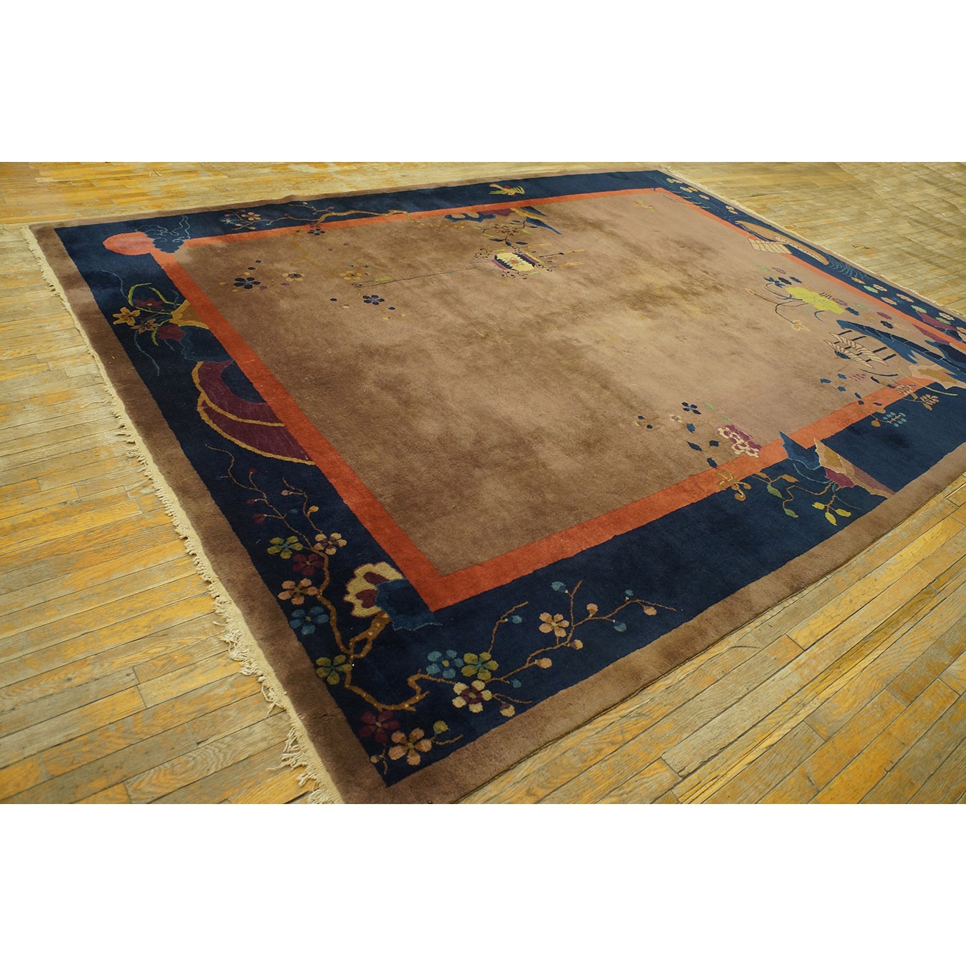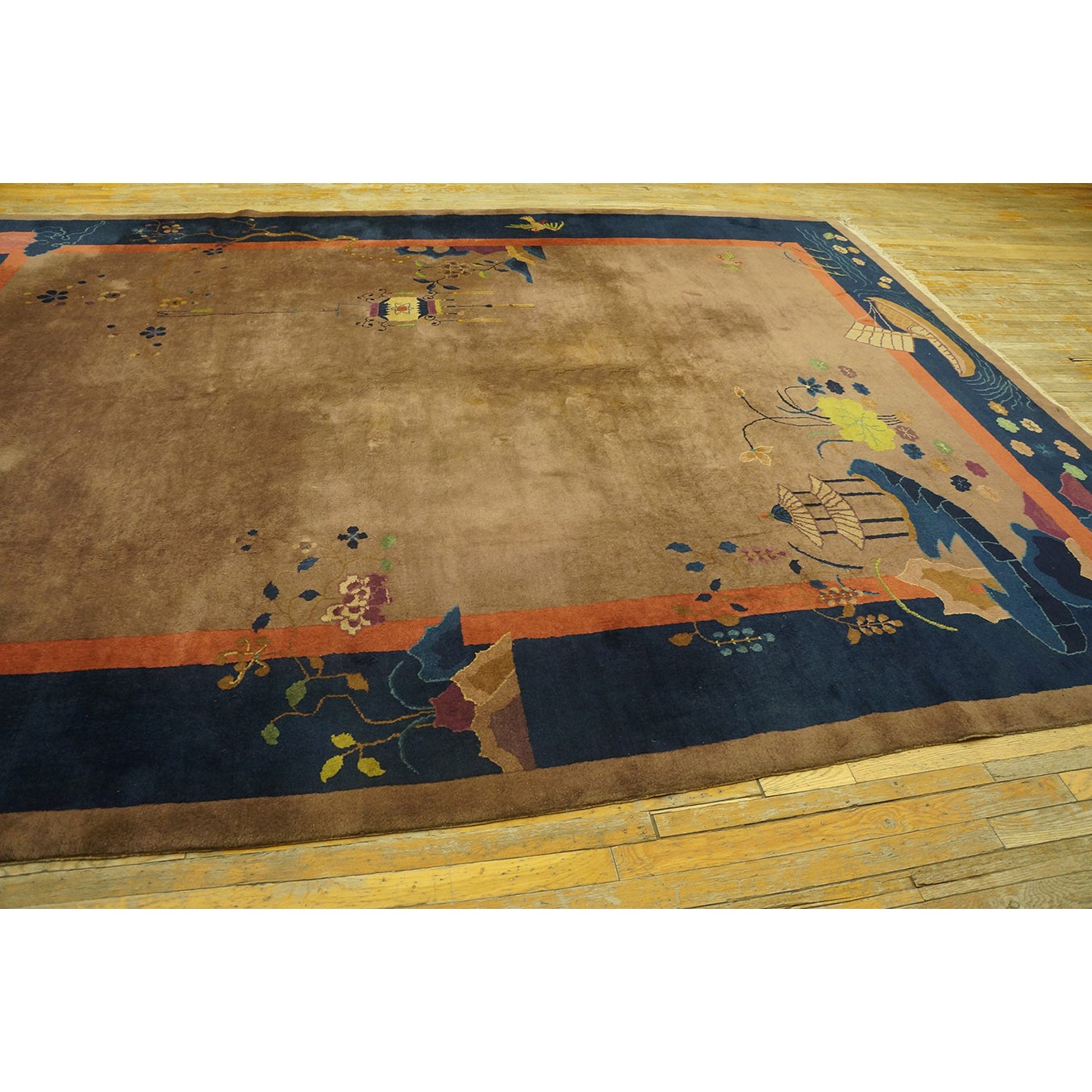 DescriptionChineseCarpets made in China proper. See entries Ningshia, Peking, Art Deco. Chinese - Art DecoAs the name implies, pieces woven between the wars for the Western market by mostly American owned firms especially Nichols and Fette, in thick heavy weaves using strong colors, asymmetric patterns and downplaying the Chinese-ness of the carpet. Nichols rugs are more strong toned than the pastel Fette. Most were woven in the coastal port city of Tientsin. Other lesser known workshops were also active. Some pieces are ultra-geometric and haute-Deco moderne in character: these are very rare. More frequent are pieces with bits of Chinese ornament: vases or other precious objects, paeonies, vines, fences, etc. Most common is the 9 x 12 size, in colors never found in mainstream Chinese rugs: backgrounds in black, mauve, purple, hot pink, orange, olive, employing the best synthetic chrome dyes of the period. Prices are still reasonable and carpets in top condition are available. | |