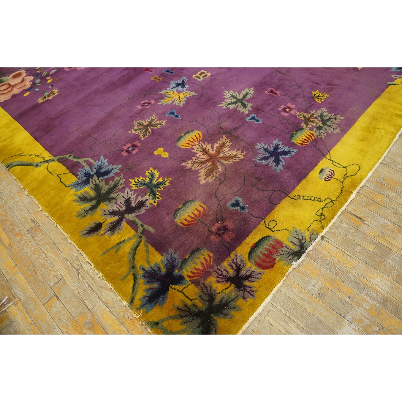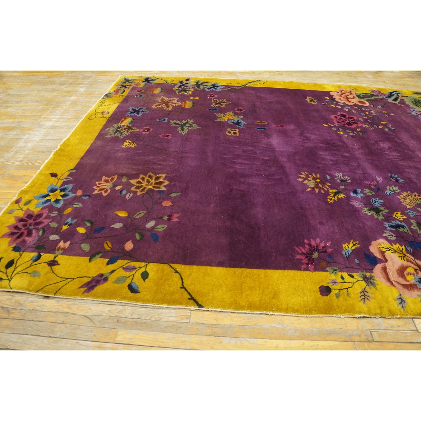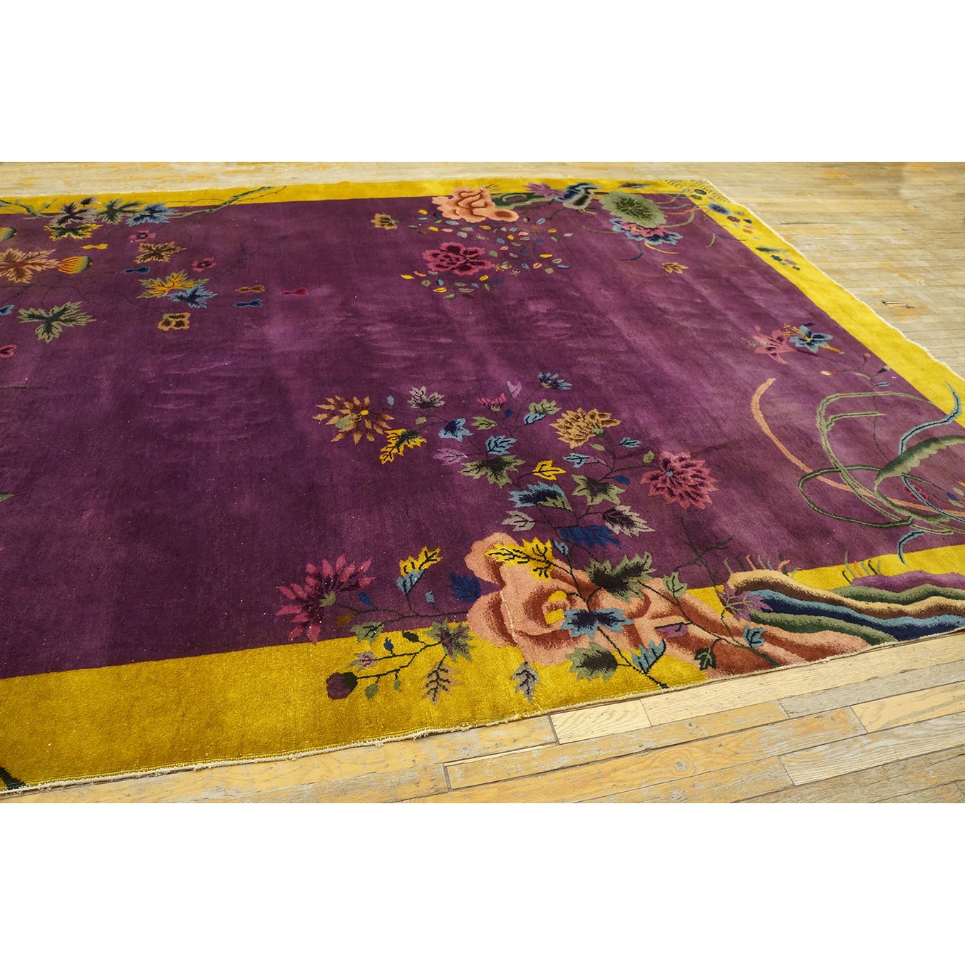 DescriptionChineseCarpets made in China proper. See entries Ningshia, Peking, Art Deco. Chinese - Art DecoAs the name implies, pieces woven between the wars for the Western market by mostly American owned firms especially Nichols and Fette, in thick heavy weaves using strong colors, asymmetric patterns and downplaying the Chinese-ness of the carpet. Nichols rugs are more strong toned than the pastel Fette. Most were woven in the coastal port city of Tientsin. Other lesser known workshops were also active. Some pieces are ultra-geometric and haute-Deco moderne in character: these are very rare. More frequent are pieces with bits of Chinese ornament: vases or other precious objects, paeonies, vines, fences, etc. Most common is the 9 x 12 size, in colors never found in mainstream Chinese rugs: backgrounds in black, mauve, purple, hot pink, orange, olive, employing the best synthetic chrome dyes of the period. Prices are still reasonable and carpets in top condition are available. | |