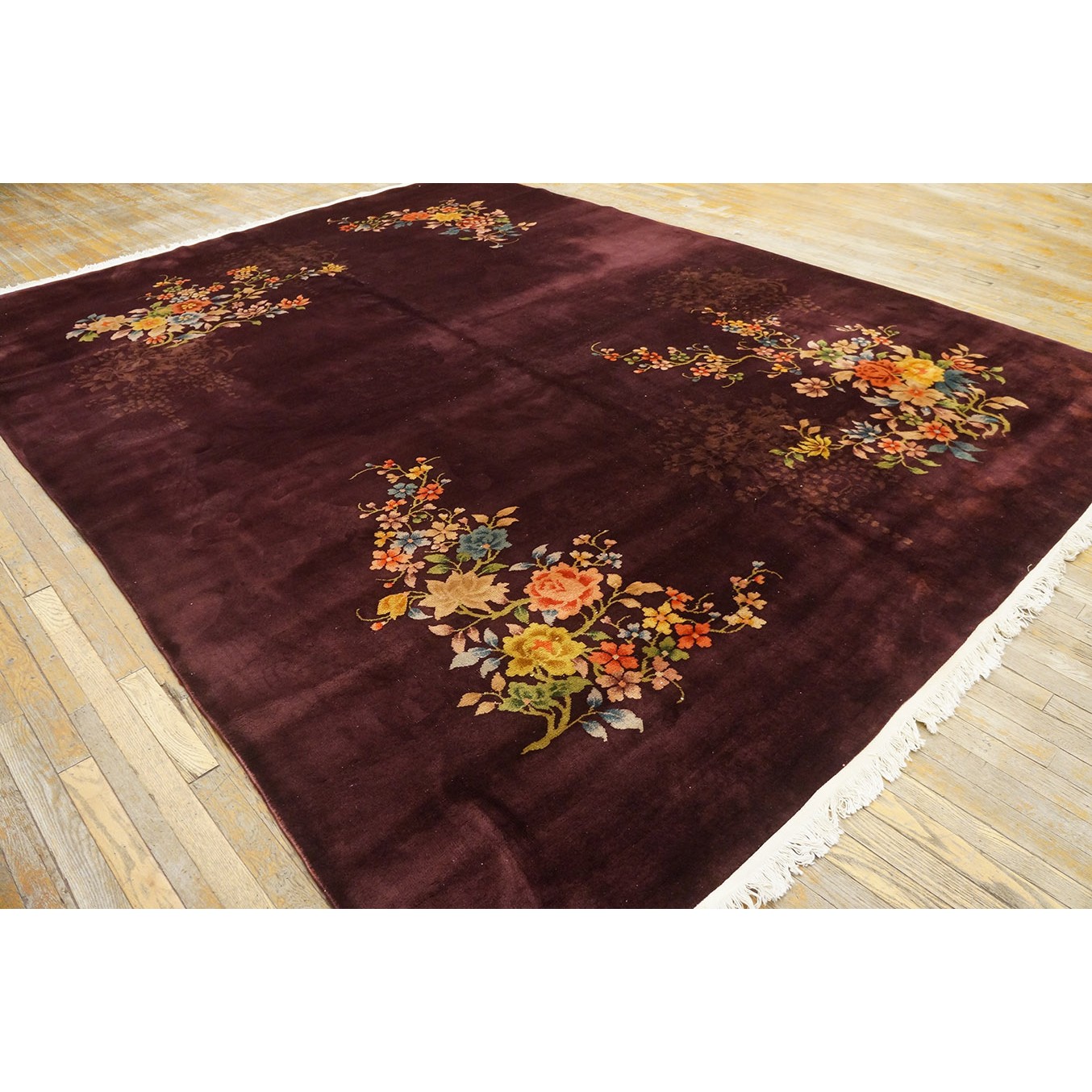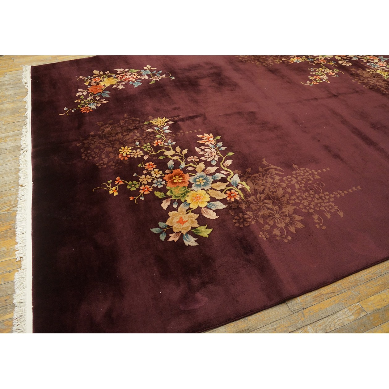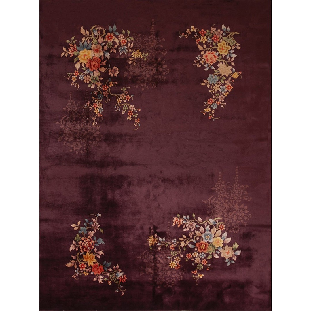 DescriptionChineseCarpets made in China proper. See entries Ningshia, Peking, Art Deco. Chinese - Art DecoAs the name implies, pieces woven between the wars for the Western market by mostly American owned firms especially Nichols and Fette, in thick heavy weaves using strong colors, asymmetric patterns and downplaying the Chinese-ness of the carpet. Nichols rugs are more strong toned than the pastel Fette. Most were woven in the coastal port city of Tientsin. Other lesser known workshops were also active. Some pieces are ultra-geometric and haute-Deco moderne in character: these are very rare. More frequent are pieces with bits of Chinese ornament: vases or other precious objects, paeonies, vines, fences, etc. Most common is the 9 x 12 size, in colors never found in mainstream Chinese rugs: backgrounds in black, mauve, purple, hot pink, orange, olive, employing the best synthetic chrome dyes of the period. Prices are still reasonable and carpets in top condition are available. | |