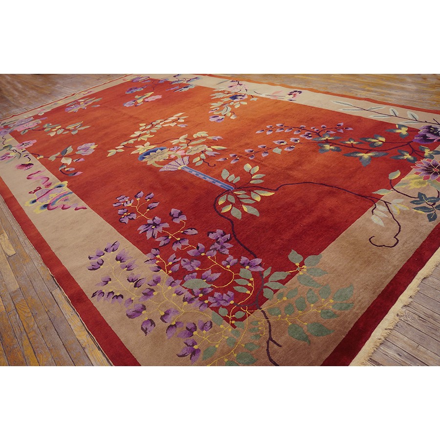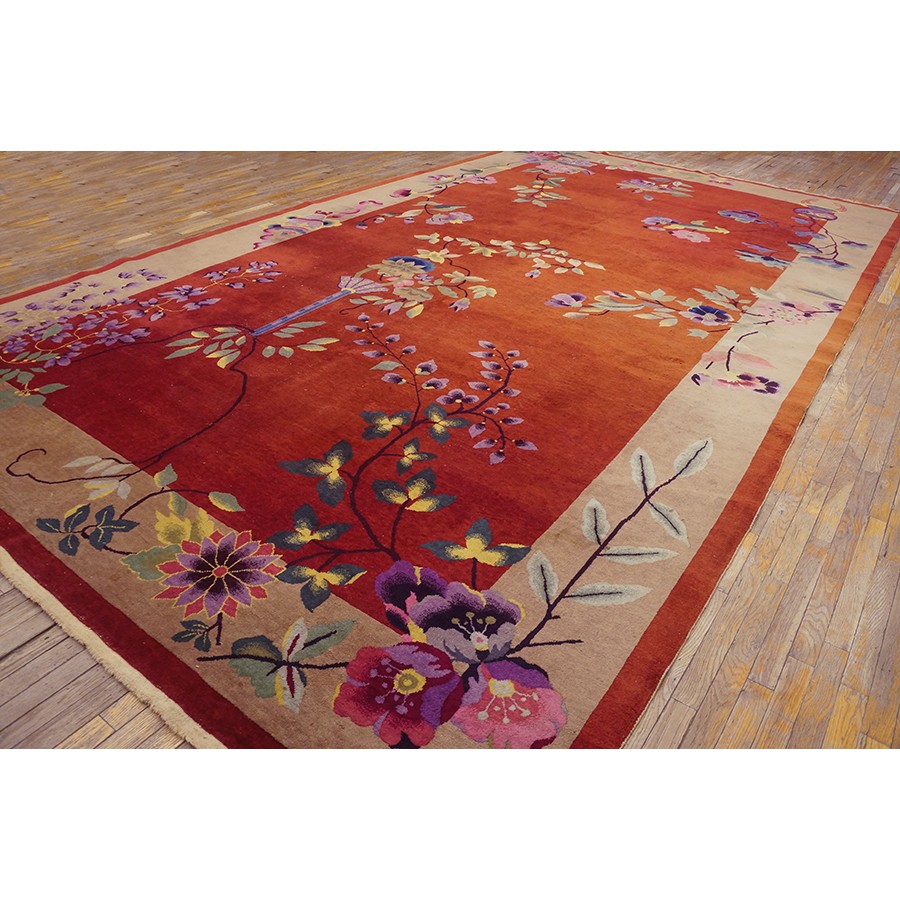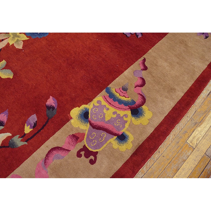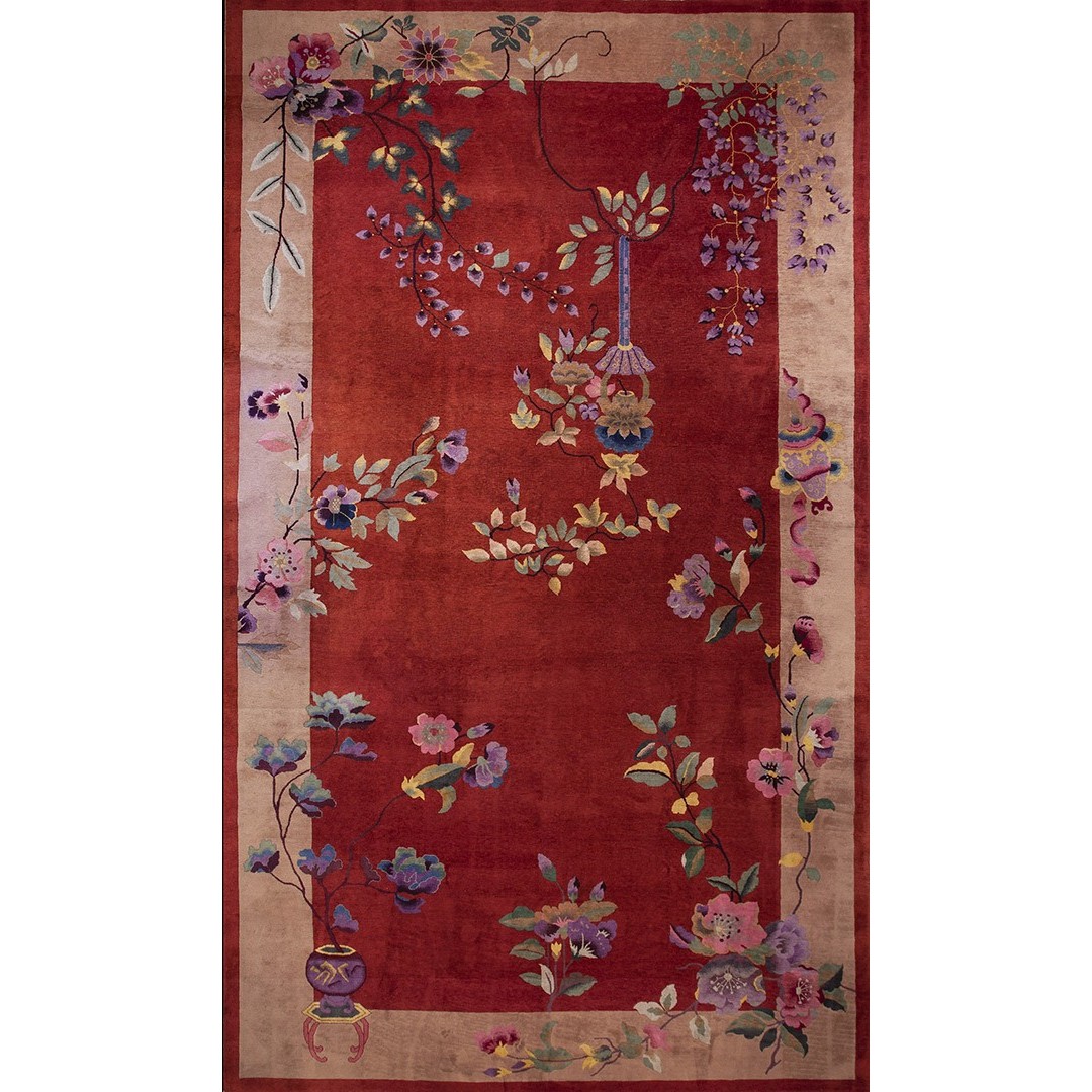 DescriptionChineseCarpets made in China proper. See entries Ningshia, Peking, Art Deco. Chinese - Art DecoAs the name implies, pieces woven between the wars for the Western market by mostly American owned firms especially Nichols and Fette, in thick heavy weaves using strong colors, asymmetric patterns and downplaying the Chinese-ness of the carpet. Nichols rugs are more strong toned than the pastel Fette. Most were woven in the coastal port city of Tientsin. Other lesser known workshops were also active. Some pieces are ultra-geometric and haute-Deco moderne in character: these are very rare. More frequent are pieces with bits of Chinese ornament: vases or other precious objects, paeonies, vines, fences, etc. Most common is the 9 x 12 size, in colors never found in mainstream Chinese rugs: backgrounds in black, mauve, purple, hot pink, orange, olive, employing the best synthetic chrome dyes of the period. Prices are still reasonable and carpets in top condition are available. | |