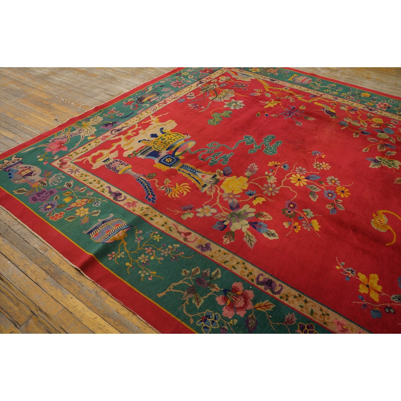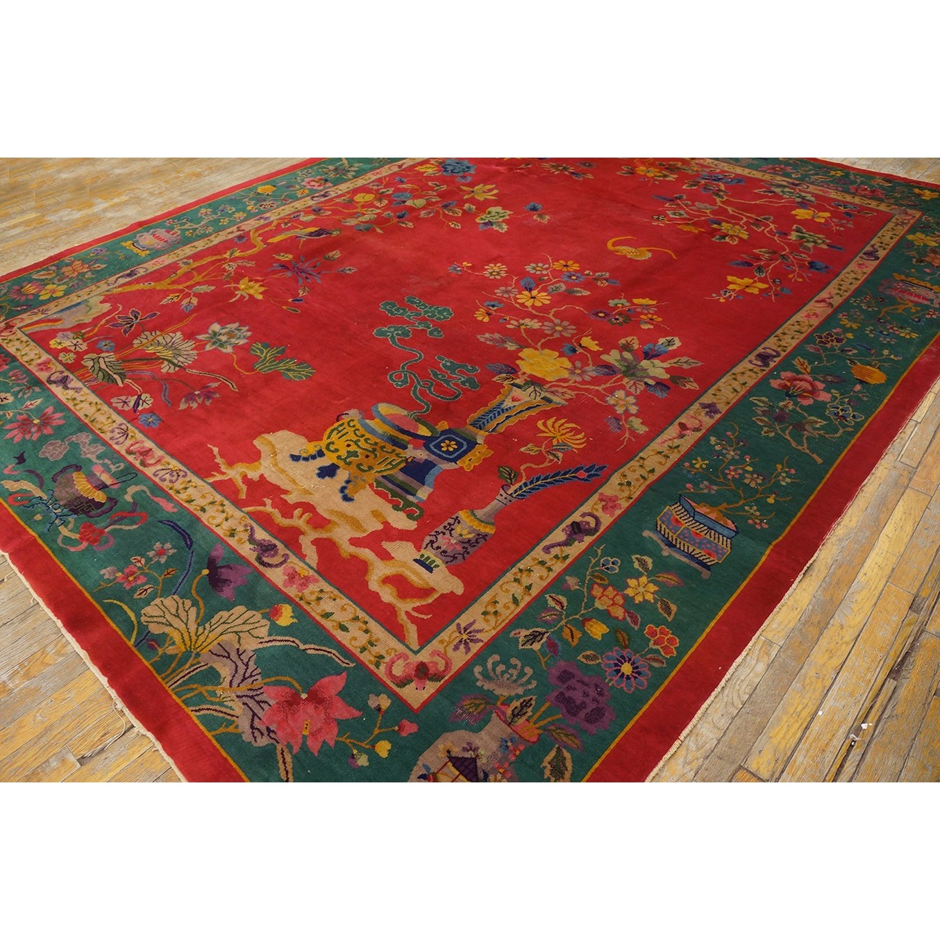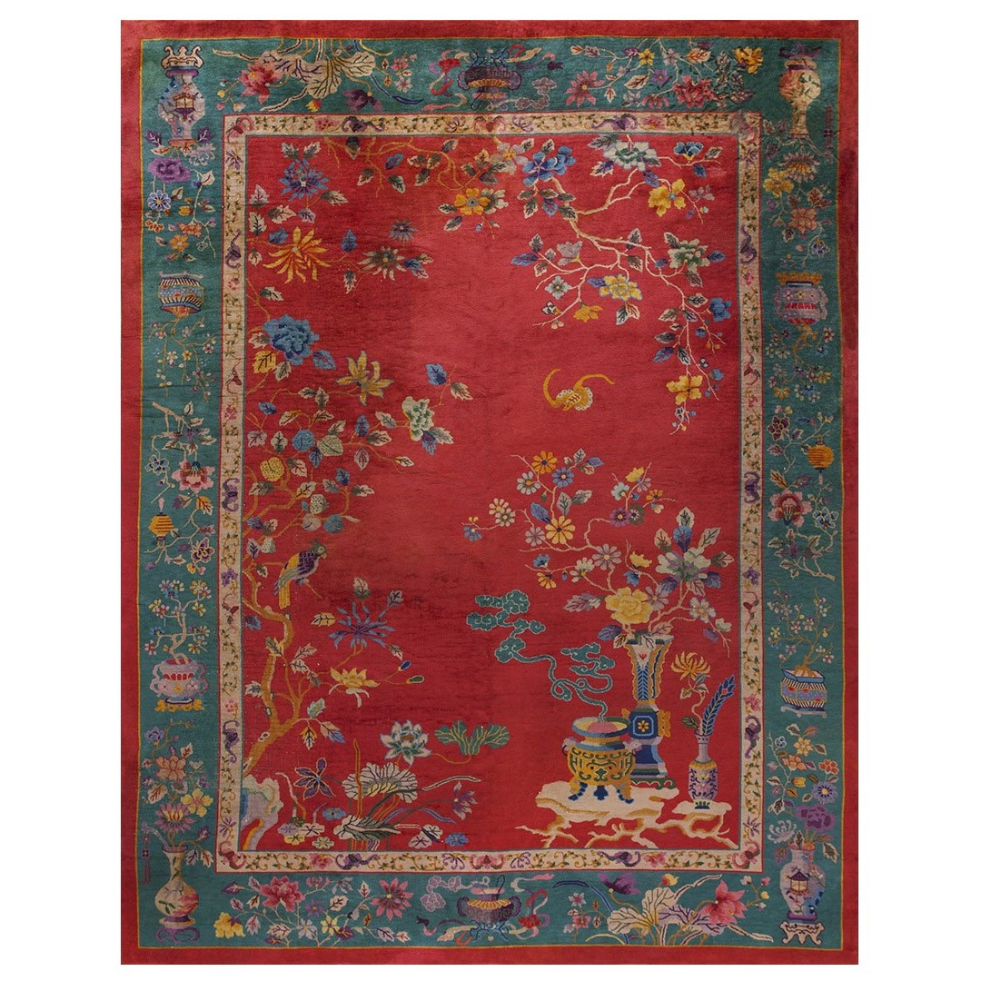 DescriptionChineseCarpets made in China proper. See entries Ningshia, Peking, Art Deco. Chinese - Art DecoAs the name implies, pieces woven between the wars for the Western market by mostly American owned firms especially Nichols and Fette, in thick heavy weaves using strong colors, asymmetric patterns and downplaying the Chinese-ness of the carpet. Nichols rugs are more strong toned than the pastel Fette. Most were woven in the coastal port city of Tientsin. Other lesser known workshops were also active. Some pieces are ultra-geometric and haute-Deco moderne in character: these are very rare. More frequent are pieces with bits of Chinese ornament: vases or other precious objects, paeonies, vines, fences, etc. Most common is the 9 x 12 size, in colors never found in mainstream Chinese rugs: backgrounds in black, mauve, purple, hot pink, orange, olive, employing the best synthetic chrome dyes of the period. Prices are still reasonable and carpets in top condition are available. | |