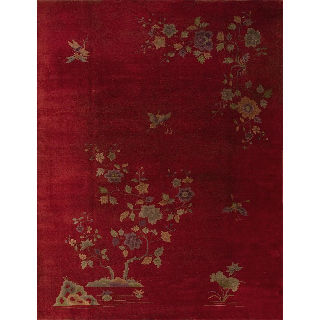 DescriptionChineseCarpets made in China proper. See entries Ningshia, Peking, Art Deco. Chinese - Art DecoAs the name implies, pieces woven between the wars for the Western market by mostly American owned firms especially Nichols and Fette, in thick heavy weaves using strong colors, asymmetric patterns and downplaying the Chinese-ness of the carpet. Nichols rugs are more strong toned than the pastel Fette. Most were woven in the coastal port city of Tientsin. Other lesser known workshops were also active. Some pieces are ultra-geometric and haute-Deco moderne in character: these are very rare. More frequent are pieces with bits of Chinese ornament: vases or other precious objects, paeonies, vines, fences, etc. Most common is the 9 x 12 size, in colors never found in mainstream Chinese rugs: backgrounds in black, mauve, purple, hot pink, orange, olive, employing the best synthetic chrome dyes of the period. Prices are still reasonable and carpets in top condition are available. | |