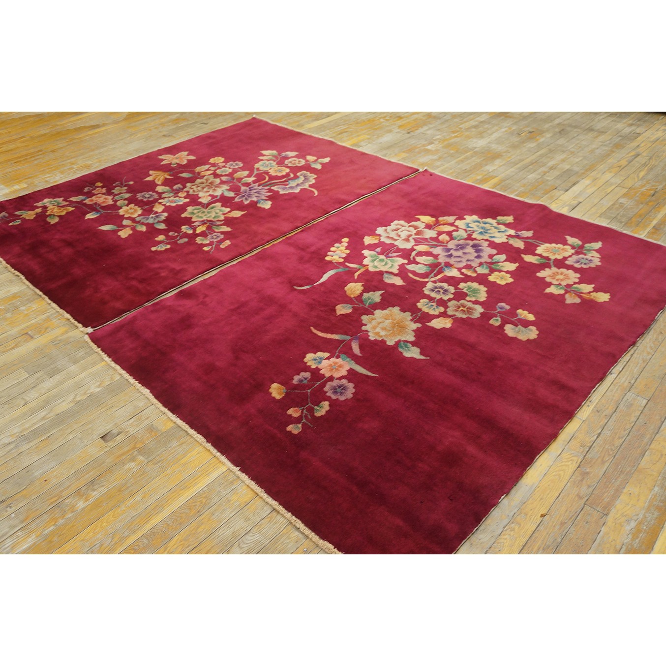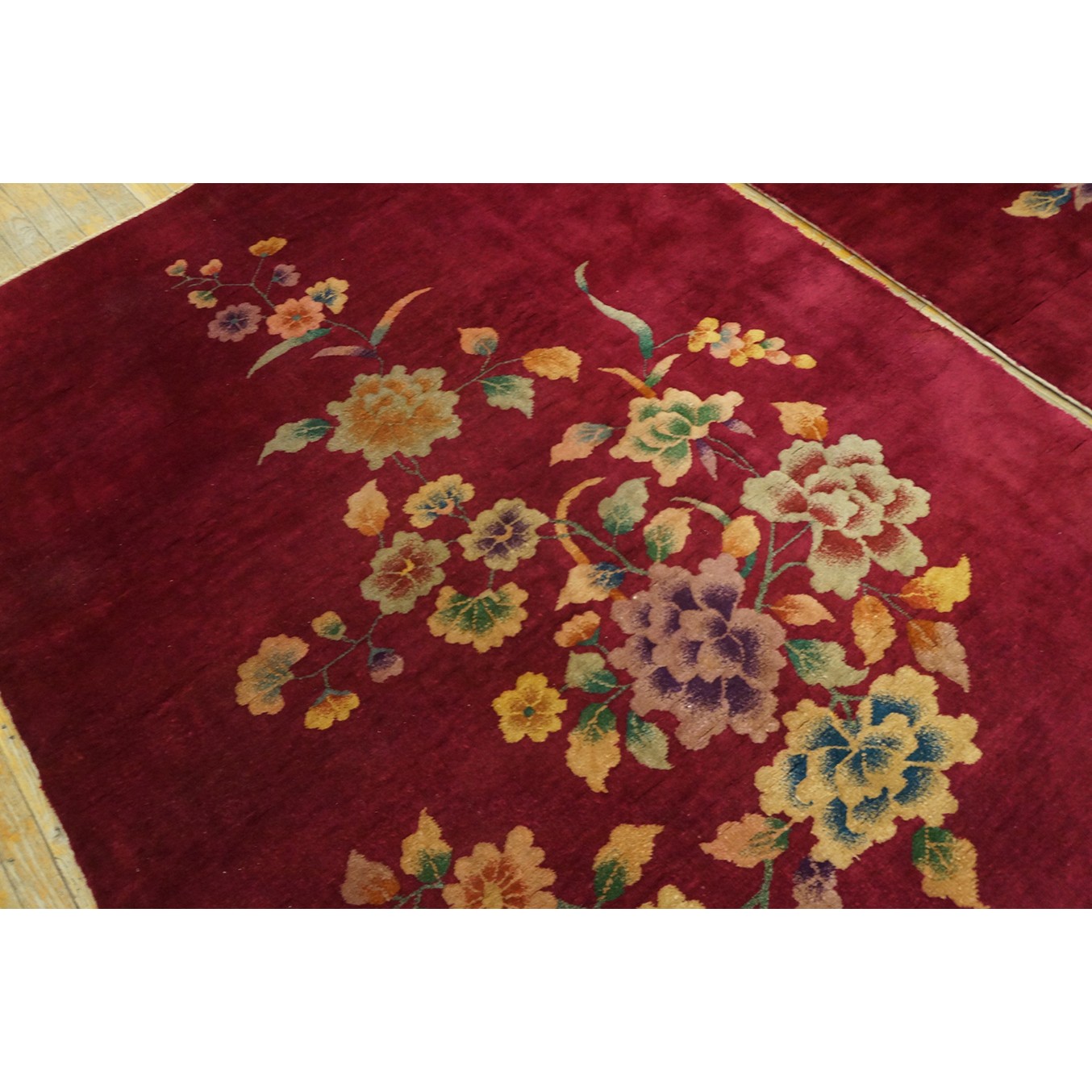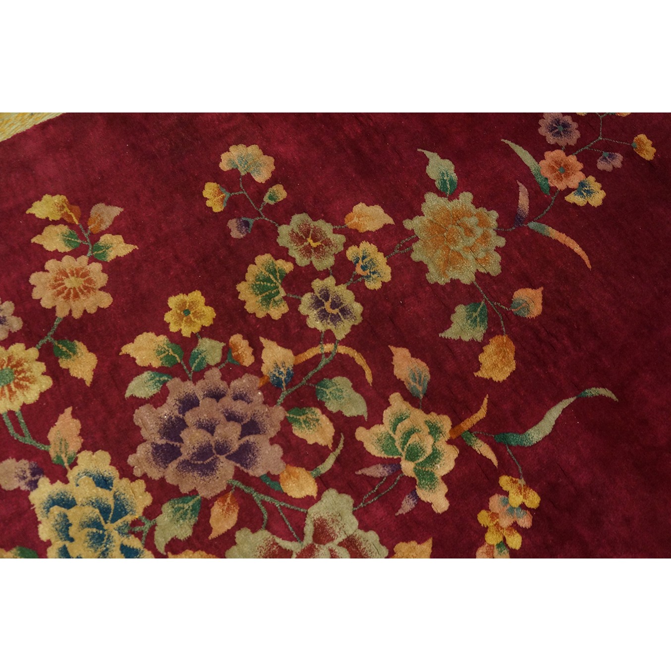 DescriptionChineseCarpets made in China proper. See entries Ningshia, Peking, Art Deco. Chinese - Art DecoAs the name implies, pieces woven between the wars for the Western market by mostly American owned firms especially Nichols and Fette, in thick heavy weaves using strong colors, asymmetric patterns and downplaying the Chinese-ness of the carpet. Nichols rugs are more strong toned than the pastel Fette. Most were woven in the coastal port city of Tientsin. Other lesser known workshops were also active. Some pieces are ultra-geometric and haute-Deco moderne in character: these are very rare. More frequent are pieces with bits of Chinese ornament: vases or other precious objects, paeonies, vines, fences, etc. Most common is the 9 x 12 size, in colors never found in mainstream Chinese rugs: backgrounds in black, mauve, purple, hot pink, orange, olive, employing the best synthetic chrome dyes of the period. Prices are still reasonable and carpets in top condition are available. | |