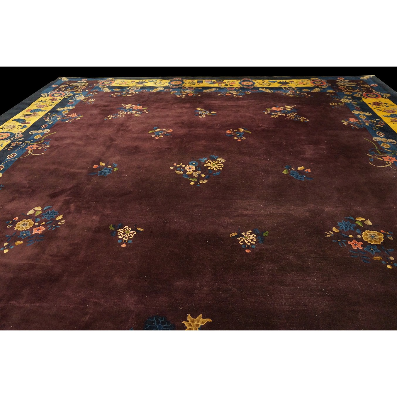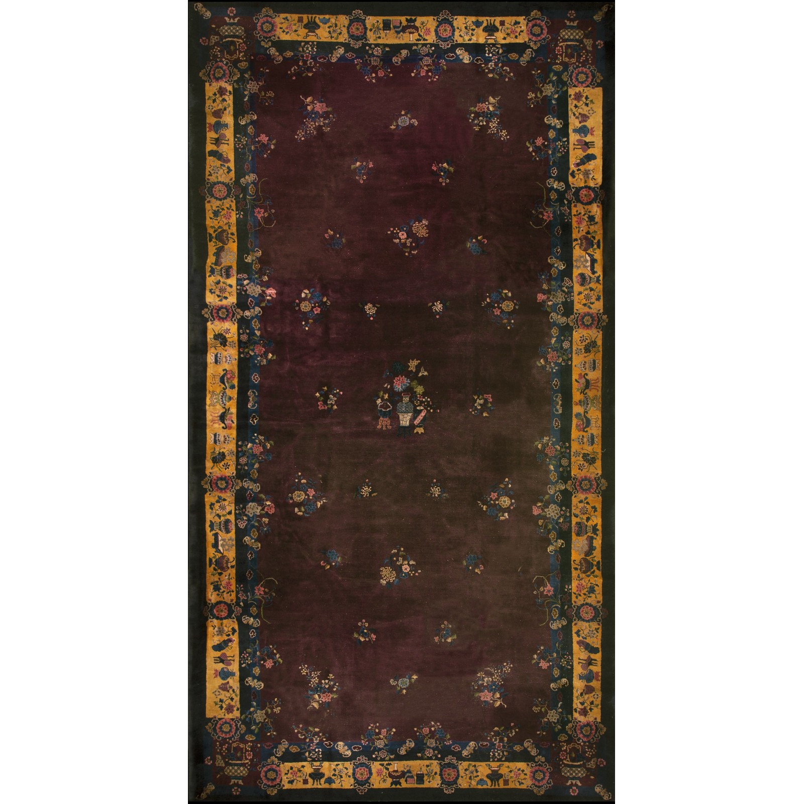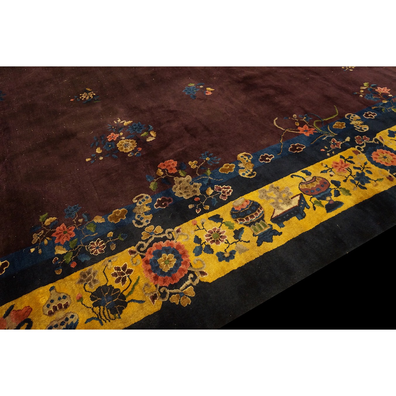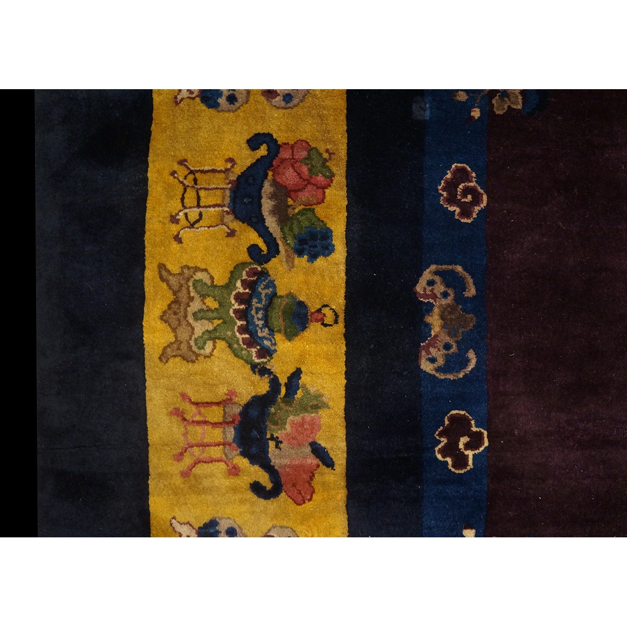 DescriptionChineseCarpets made in China proper. See entries Ningshia, Peking, Art Deco. Chinese - Art DecoAs the name implies, pieces woven between the wars for the Western market by mostly American owned firms especially Nichols and Fette, in thick heavy weaves using strong colors, asymmetric patterns and downplaying the Chinese-ness of the carpet. Nichols rugs are more strong toned than the pastel Fette. Most were woven in the coastal port city of Tientsin. Other lesser known workshops were also active. Some pieces are ultra-geometric and haute-Deco moderne in character: these are very rare. More frequent are pieces with bits of Chinese ornament: vases or other precious objects, paeonies, vines, fences, etc. Most common is the 9 x 12 size, in colors never found in mainstream Chinese rugs: backgrounds in black, mauve, purple, hot pink, orange, olive, employing the best synthetic chrome dyes of the period. Prices are still reasonable and carpets in top condition are available. | |