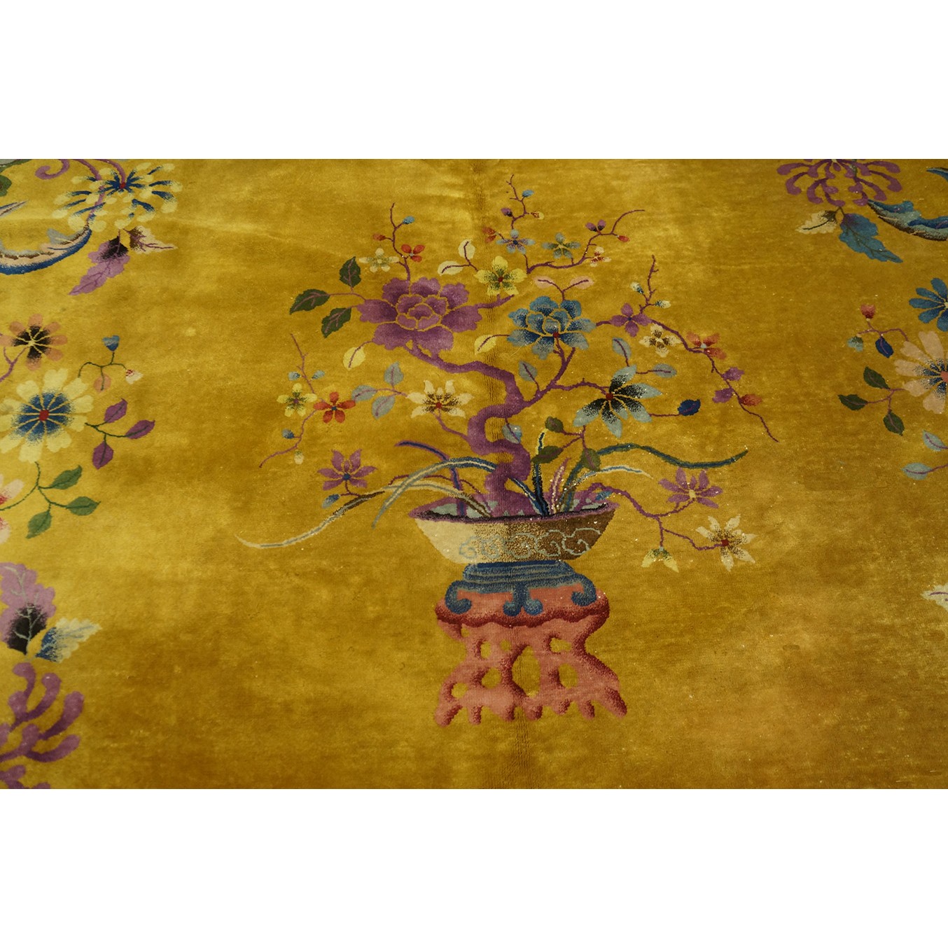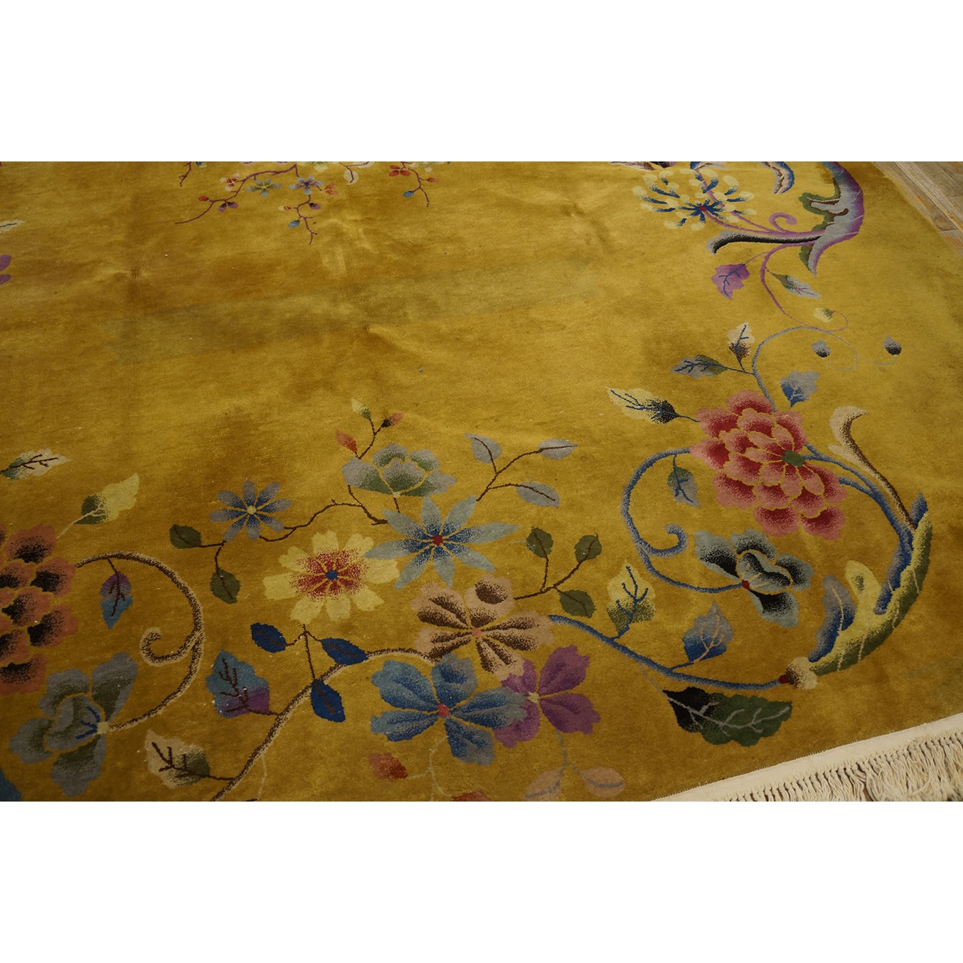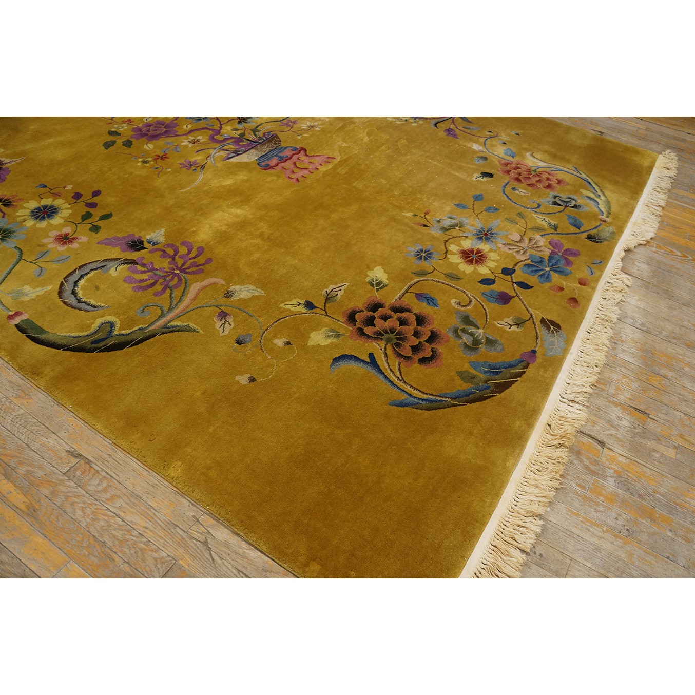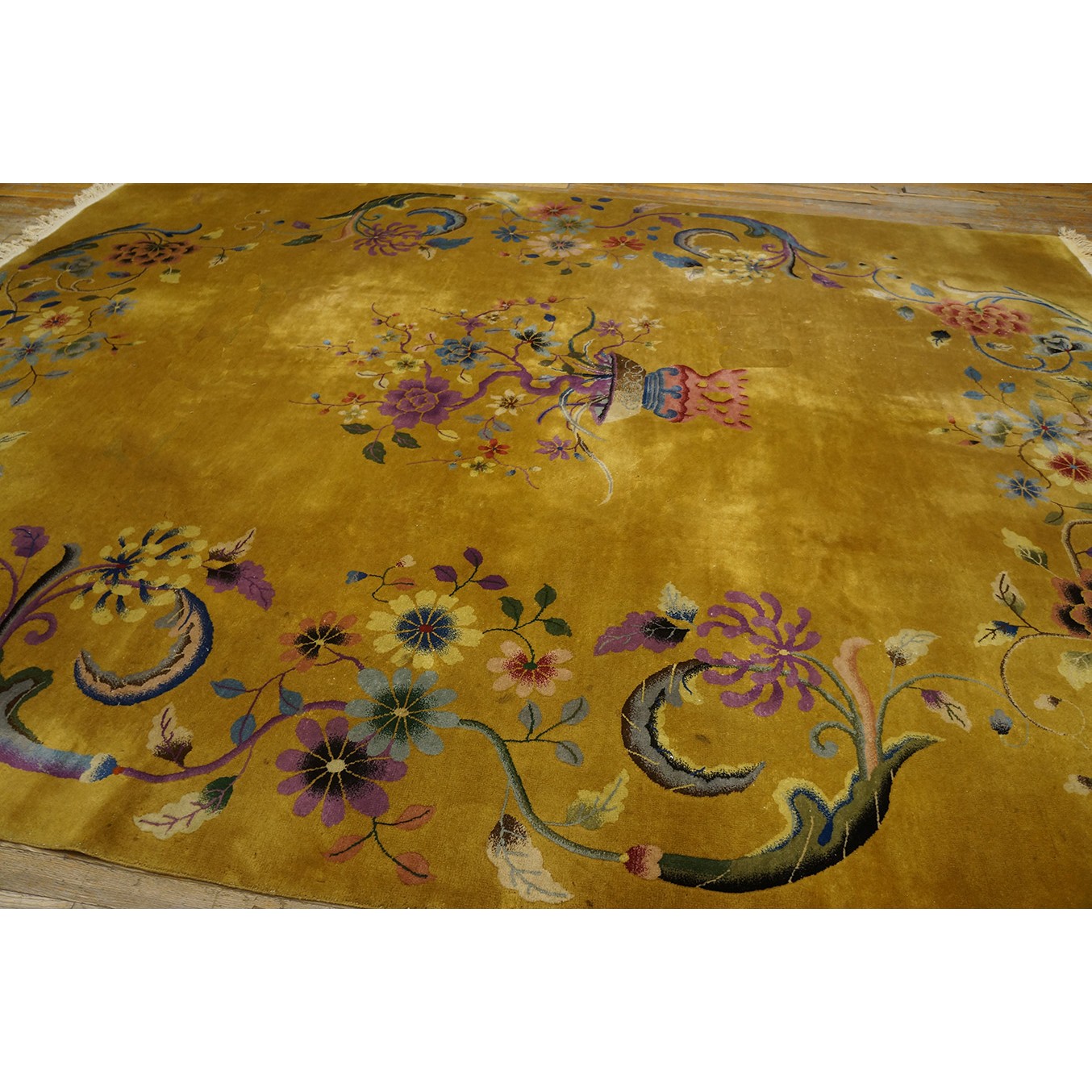DescriptionChineseCarpets made in China proper. See entries Ningshia, Peking, Art Deco. Chinese - Art DecoAs the name implies, pieces woven between the wars for the Western market by mostly American owned firms especially Nichols and Fette, in thick heavy weaves using strong colors, asymmetric patterns and downplaying the Chinese-ness of the carpet. Nichols rugs are more strong toned than the pastel Fette. Most were woven in the coastal port city of Tientsin. Other lesser known workshops were also active. Some pieces are ultra-geometric and haute-Deco moderne in character: these are very rare. More frequent are pieces with bits of Chinese ornament: vases or other precious objects, paeonies, vines, fences, etc. Most common is the 9 x 12 size, in colors never found in mainstream Chinese rugs: backgrounds in black, mauve, purple, hot pink, orange, olive, employing the best synthetic chrome dyes of the period. Prices are still reasonable and carpets in top condition are available. | |