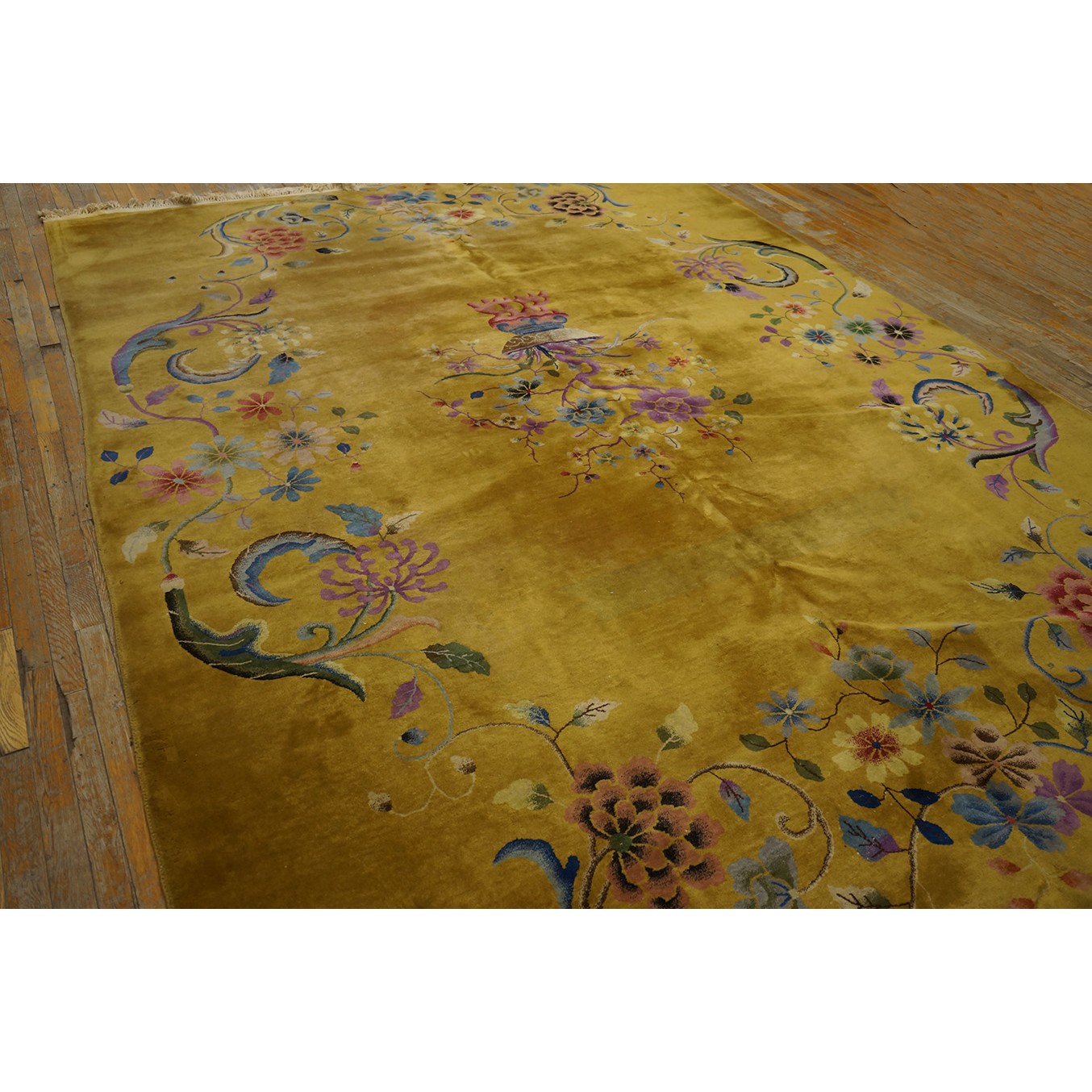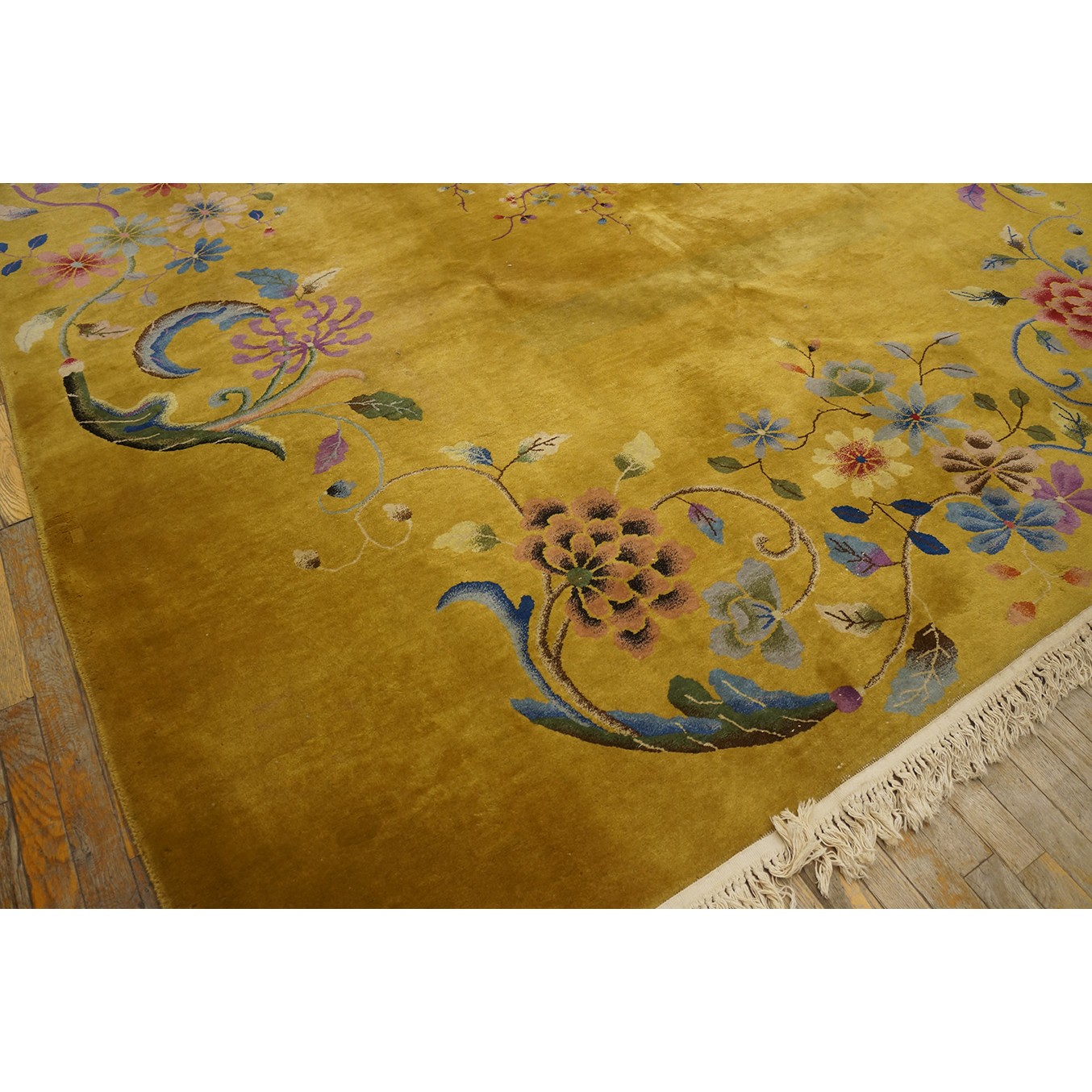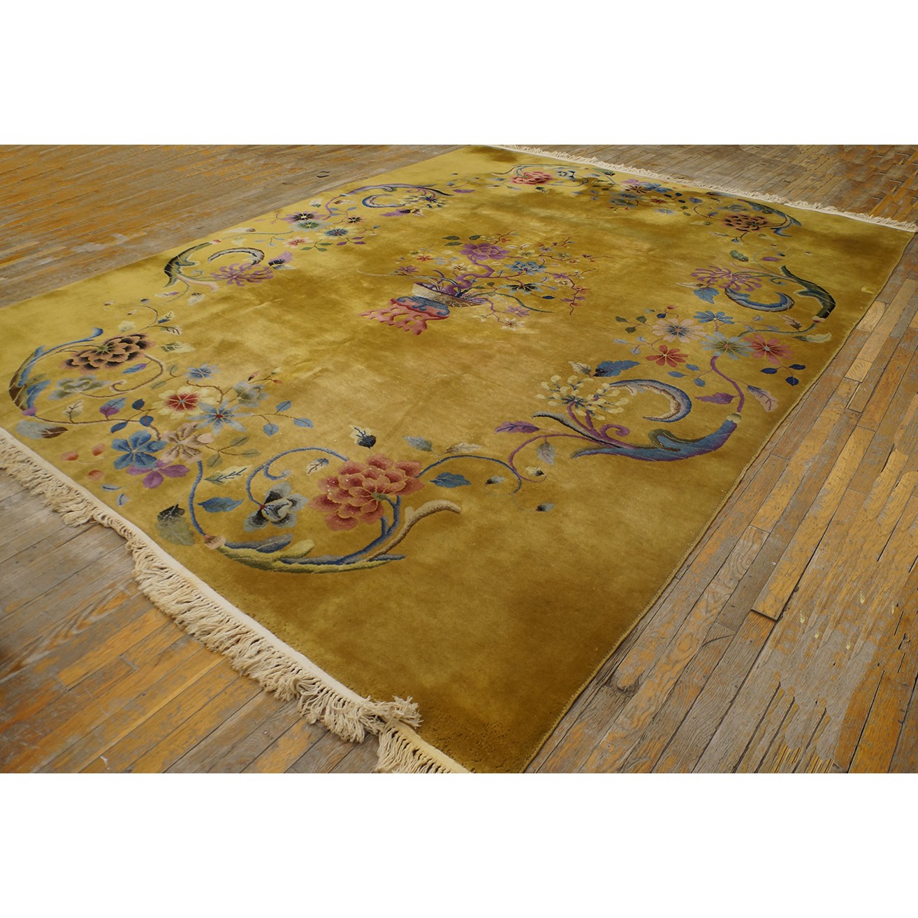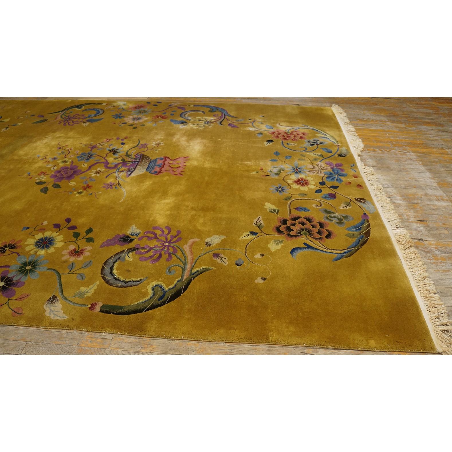 DescriptionChineseCarpets made in China proper. See entries Ningshia, Peking, Art Deco. Chinese - Art DecoAs the name implies, pieces woven between the wars for the Western market by mostly American owned firms especially Nichols and Fette, in thick heavy weaves using strong colors, asymmetric patterns and downplaying the Chinese-ness of the carpet. Nichols rugs are more strong toned than the pastel Fette. Most were woven in the coastal port city of Tientsin. Other lesser known workshops were also active. Some pieces are ultra-geometric and haute-Deco moderne in character: these are very rare. More frequent are pieces with bits of Chinese ornament: vases or other precious objects, paeonies, vines, fences, etc. Most common is the 9 x 12 size, in colors never found in mainstream Chinese rugs: backgrounds in black, mauve, purple, hot pink, orange, olive, employing the best synthetic chrome dyes of the period. Prices are still reasonable and carpets in top condition are available. | |