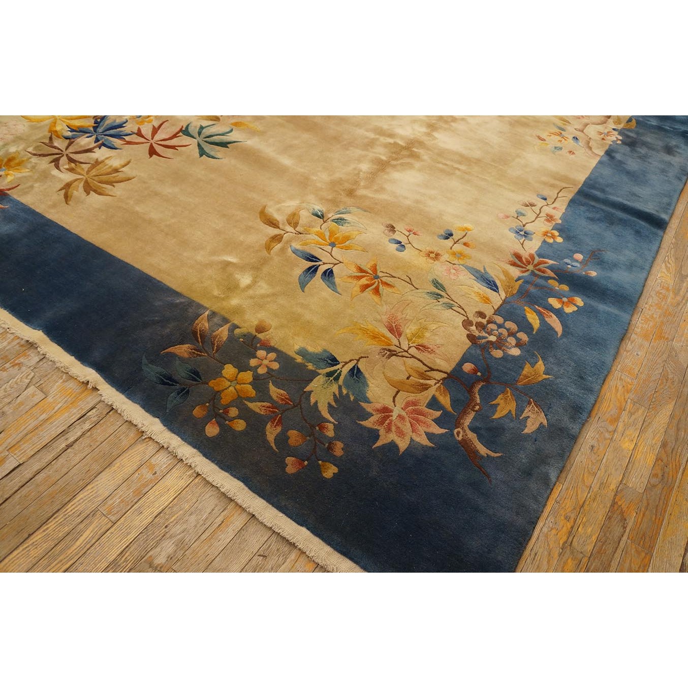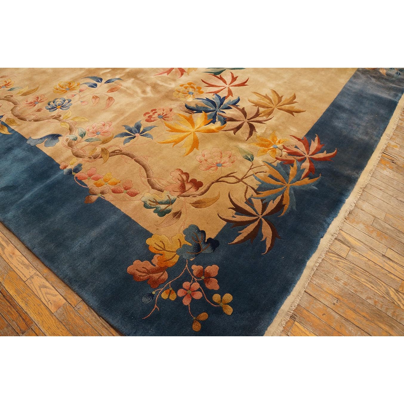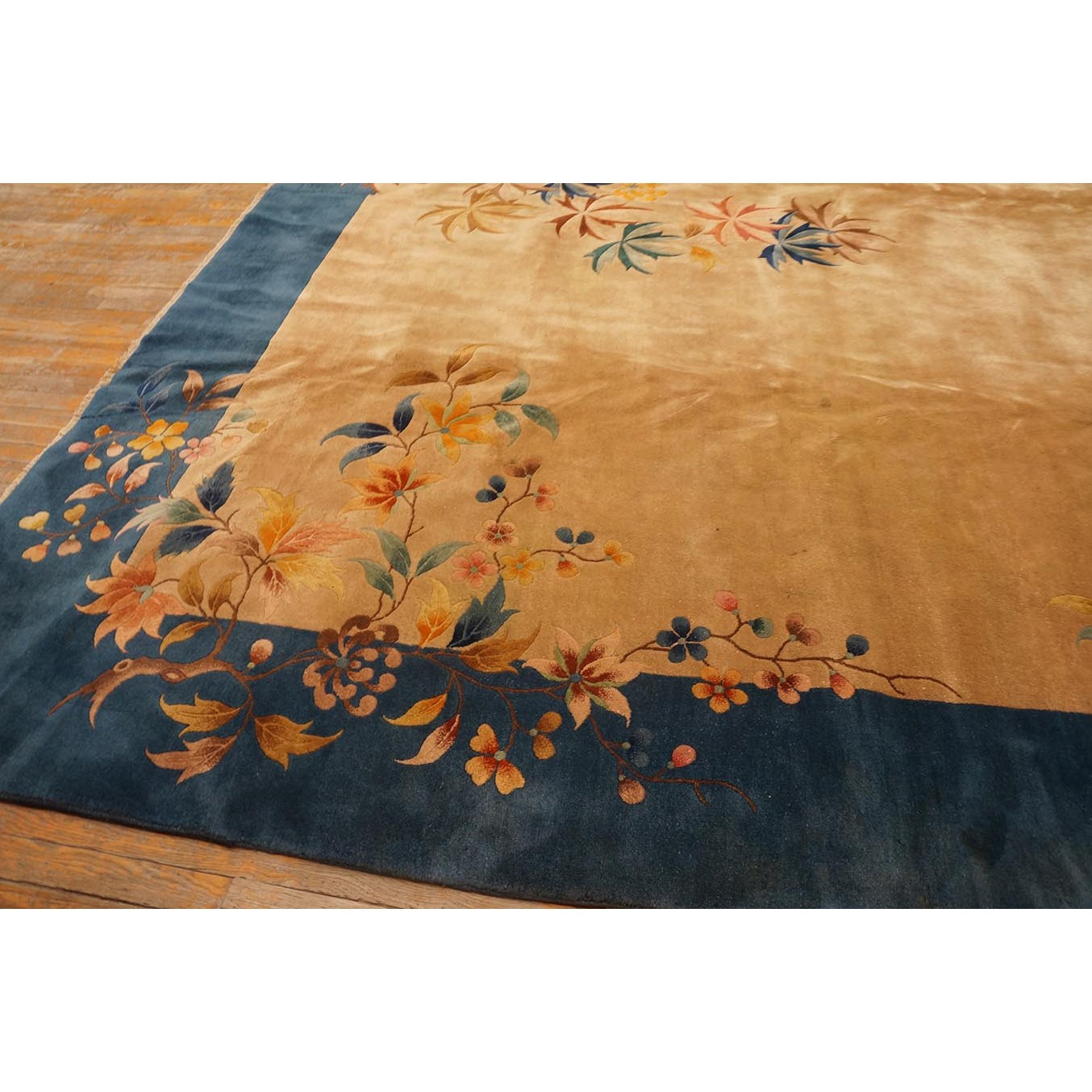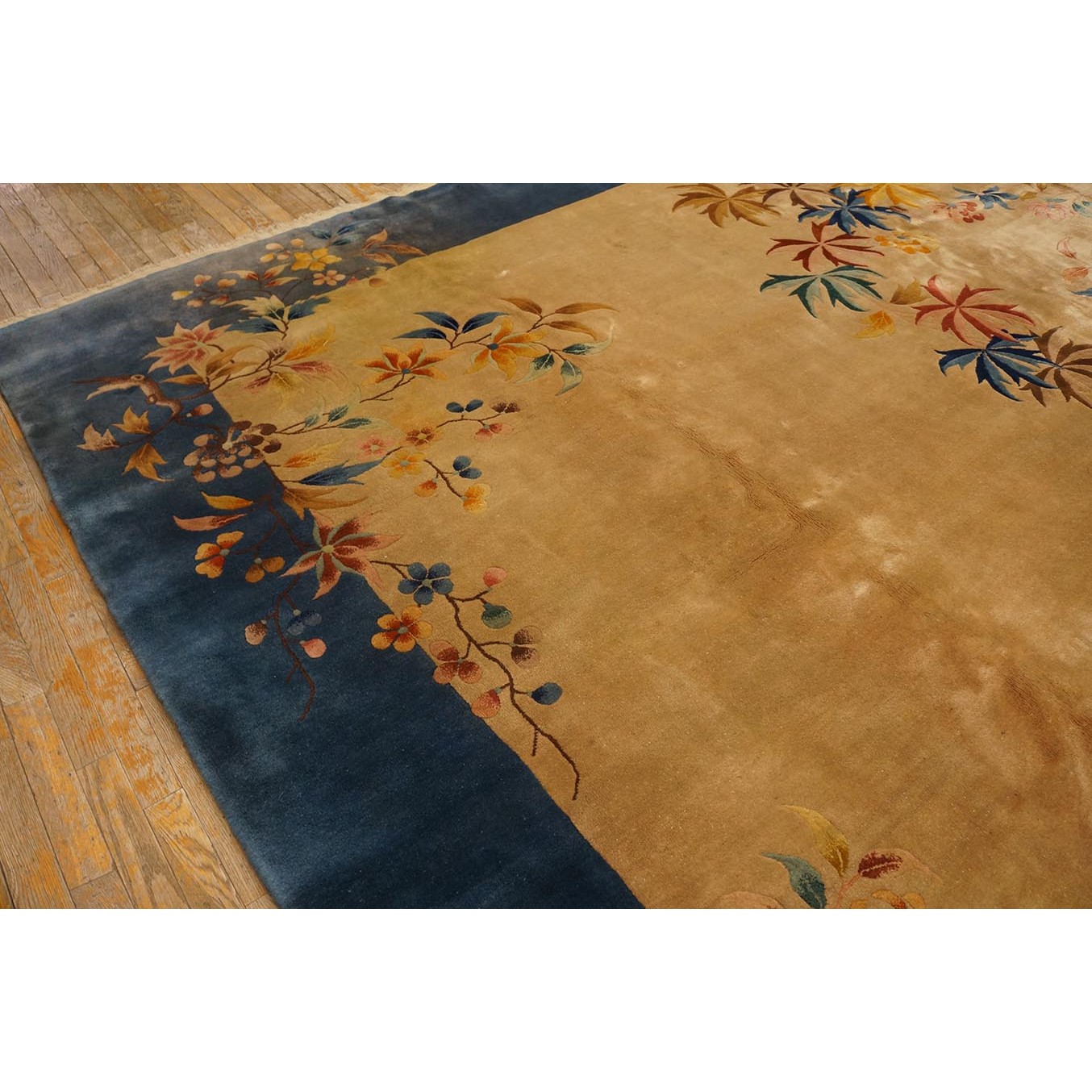 DescriptionChineseCarpets made in China proper. See entries Ningshia, Peking, Art Deco. Chinese - Art DecoAs the name implies, pieces woven between the wars for the Western market by mostly American owned firms especially Nichols and Fette, in thick heavy weaves using strong colors, asymmetric patterns and downplaying the Chinese-ness of the carpet. Nichols rugs are more strong toned than the pastel Fette. Most were woven in the coastal port city of Tientsin. Other lesser known workshops were also active. Some pieces are ultra-geometric and haute-Deco moderne in character: these are very rare. More frequent are pieces with bits of Chinese ornament: vases or other precious objects, paeonies, vines, fences, etc. Most common is the 9 x 12 size, in colors never found in mainstream Chinese rugs: backgrounds in black, mauve, purple, hot pink, orange, olive, employing the best synthetic chrome dyes of the period. Prices are still reasonable and carpets in top condition are available. | |
