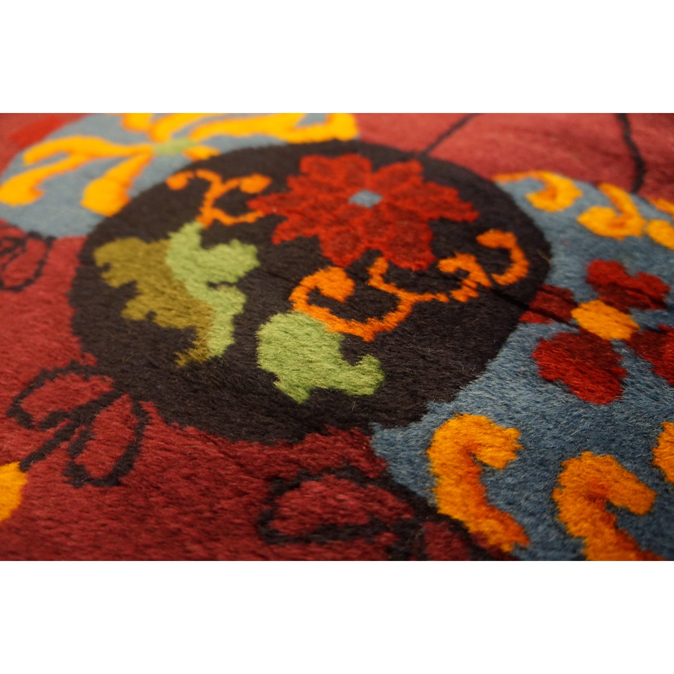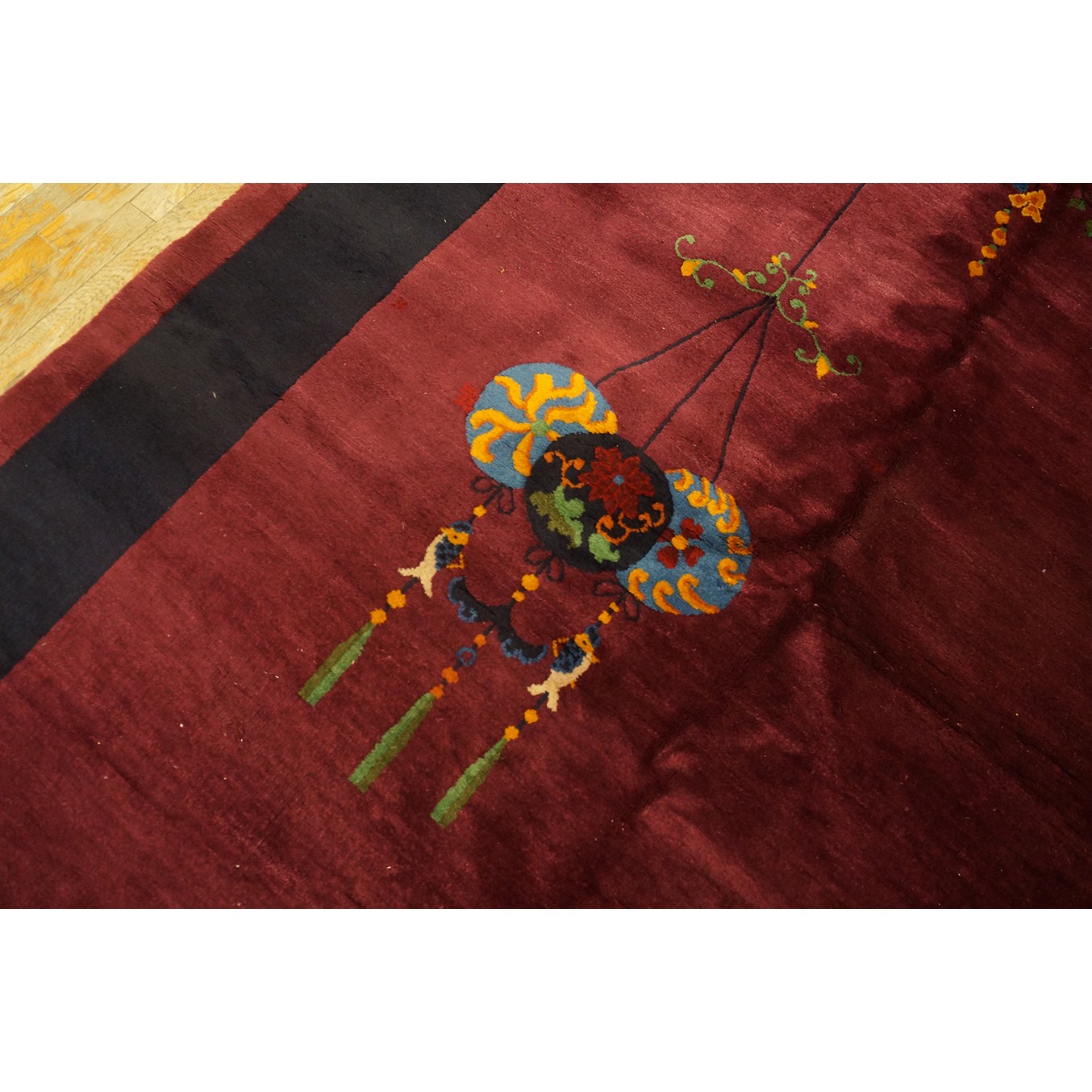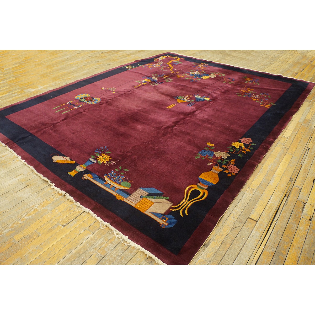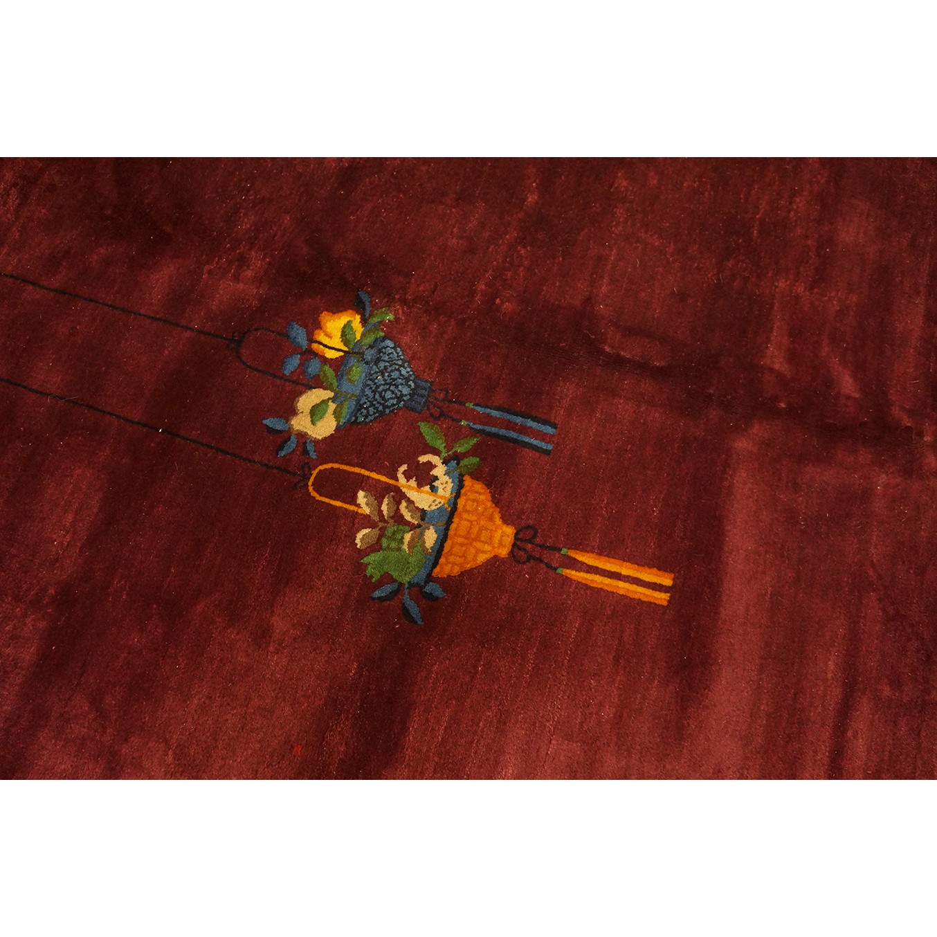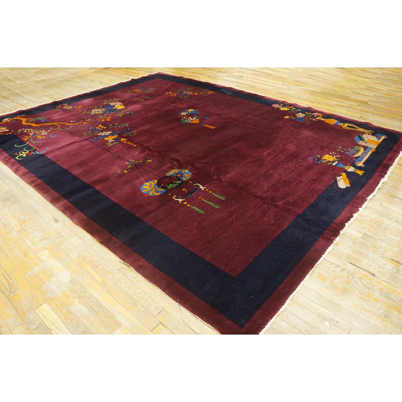 DescriptionChineseCarpets made in China proper. See entries Ningshia, Peking, Art Deco. Chinese - Art DecoAs the name implies, pieces woven between the wars for the Western market by mostly American owned firms especially Nichols and Fette, in thick heavy weaves using strong colors, asymmetric patterns and downplaying the Chinese-ness of the carpet. Nichols rugs are more strong toned than the pastel Fette. Most were woven in the coastal port city of Tientsin. Other lesser known workshops were also active. Some pieces are ultra-geometric and haute-Deco moderne in character: these are very rare. More frequent are pieces with bits of Chinese ornament: vases or other precious objects, paeonies, vines, fences, etc. Most common is the 9 x 12 size, in colors never found in mainstream Chinese rugs: backgrounds in black, mauve, purple, hot pink, orange, olive, employing the best synthetic chrome dyes of the period. Prices are still reasonable and carpets in top condition are available. | |