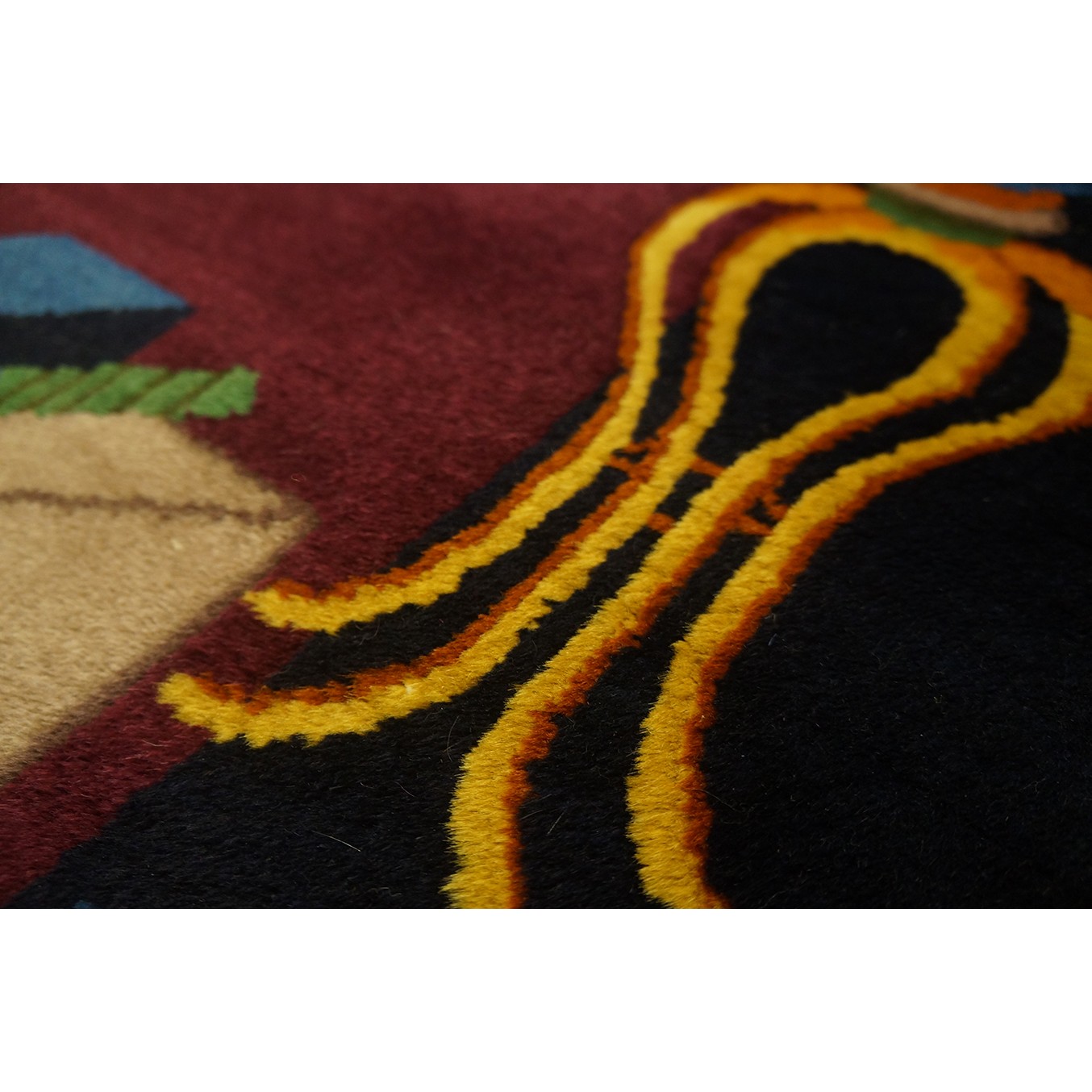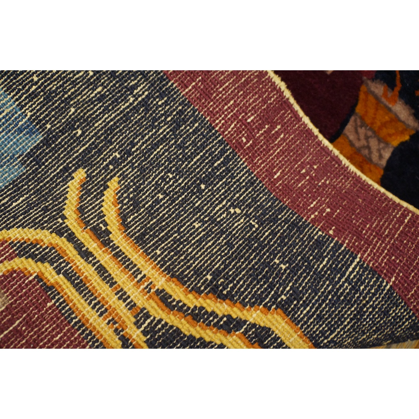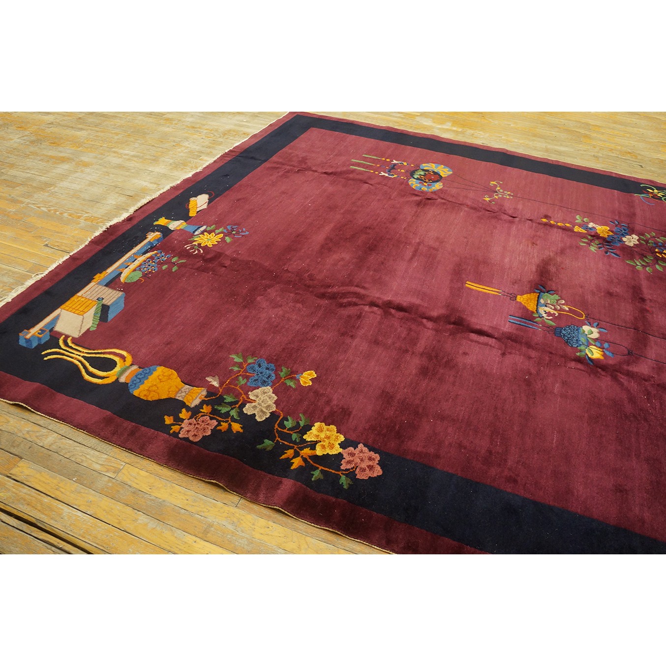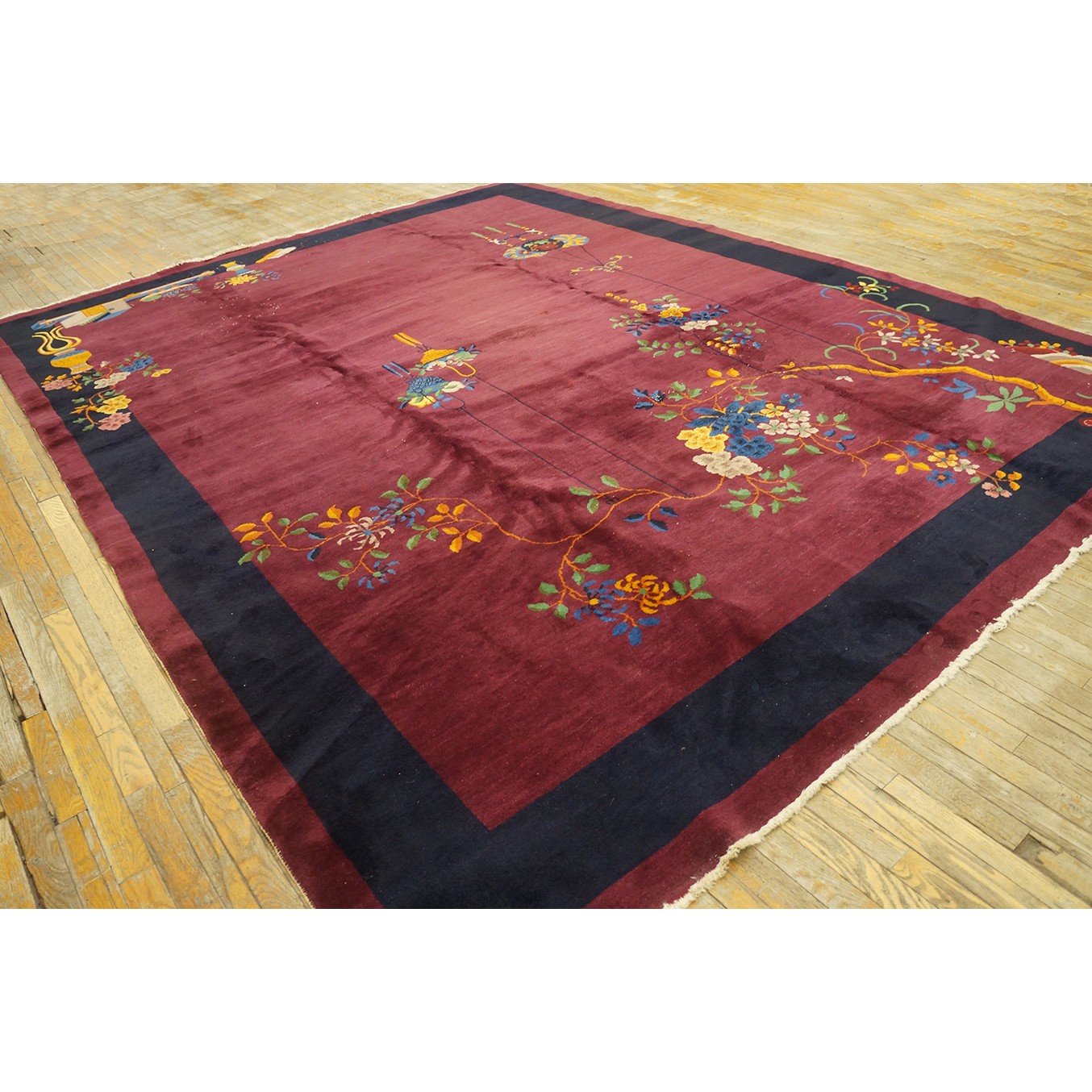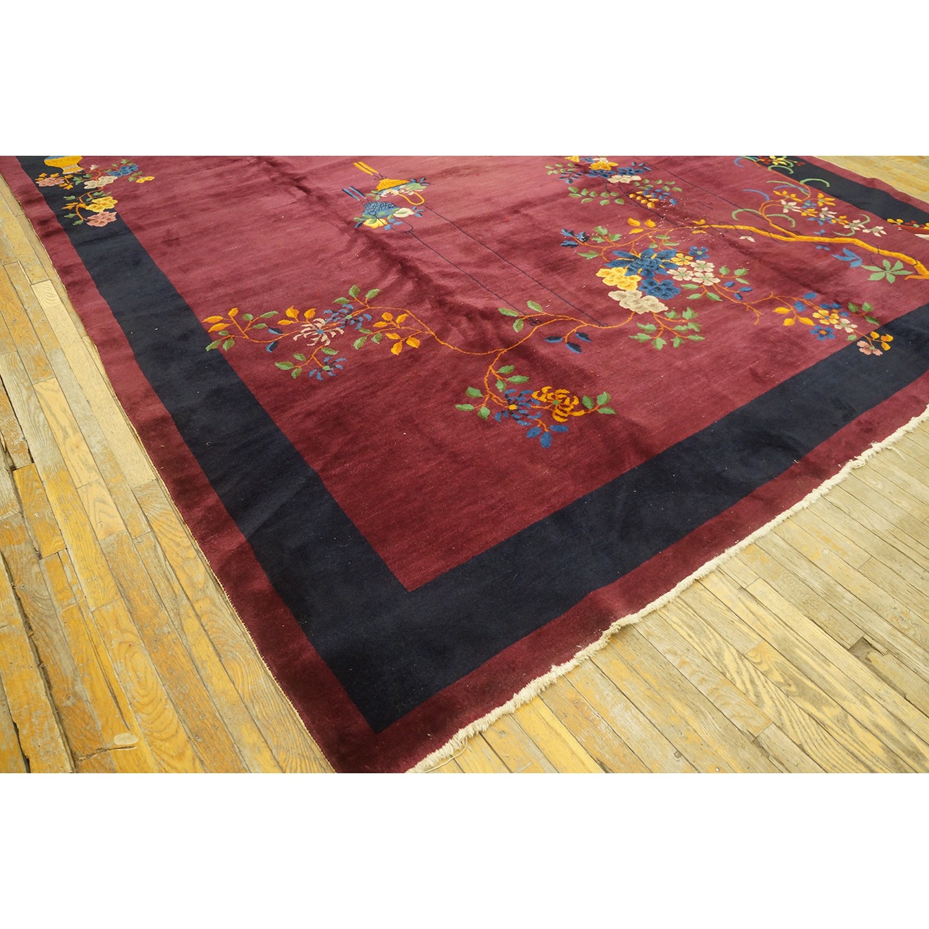 DescriptionChineseCarpets made in China proper. See entries Ningshia, Peking, Art Deco. Chinese - Art DecoAs the name implies, pieces woven between the wars for the Western market by mostly American owned firms especially Nichols and Fette, in thick heavy weaves using strong colors, asymmetric patterns and downplaying the Chinese-ness of the carpet. Nichols rugs are more strong toned than the pastel Fette. Most were woven in the coastal port city of Tientsin. Other lesser known workshops were also active. Some pieces are ultra-geometric and haute-Deco moderne in character: these are very rare. More frequent are pieces with bits of Chinese ornament: vases or other precious objects, paeonies, vines, fences, etc. Most common is the 9 x 12 size, in colors never found in mainstream Chinese rugs: backgrounds in black, mauve, purple, hot pink, orange, olive, employing the best synthetic chrome dyes of the period. Prices are still reasonable and carpets in top condition are available. | |