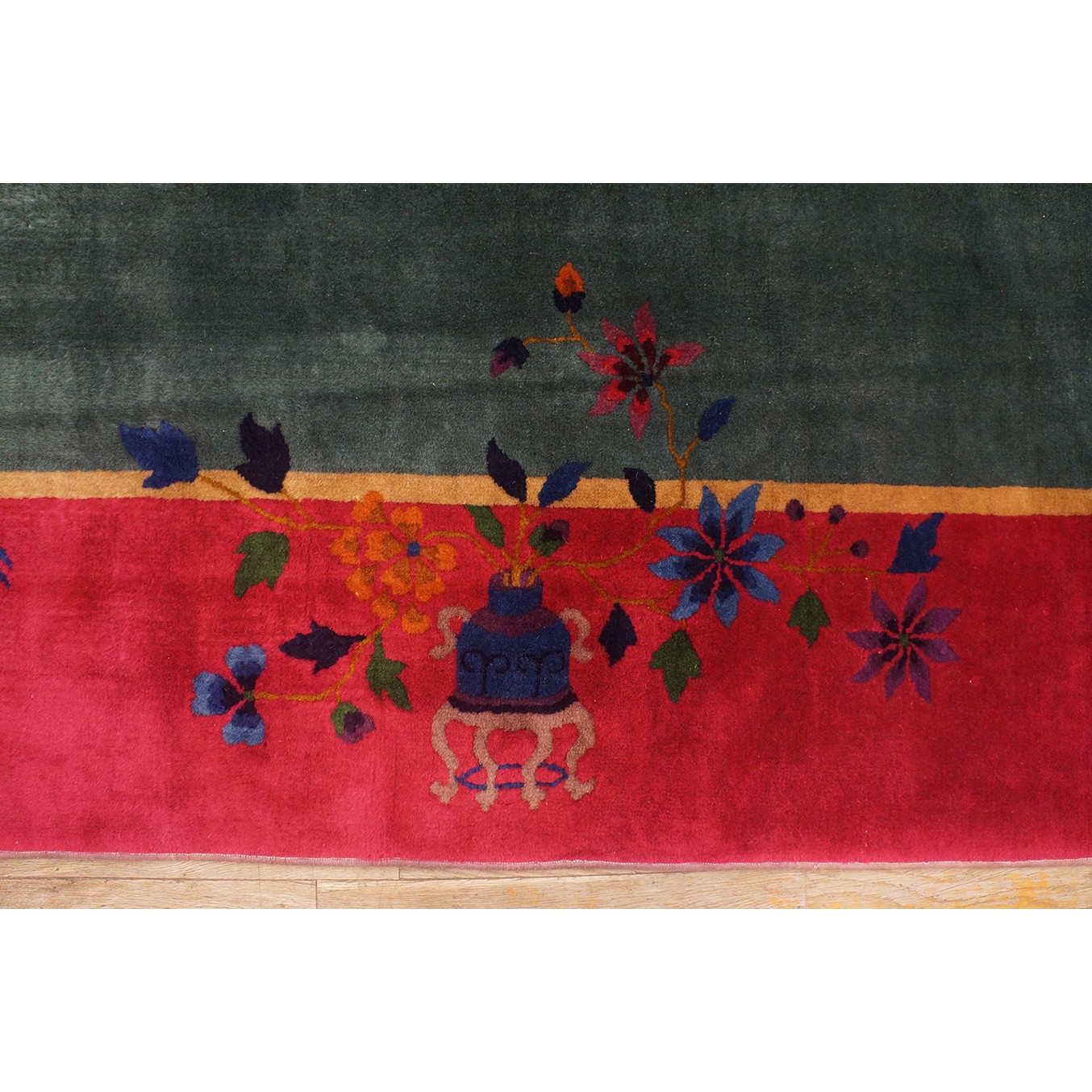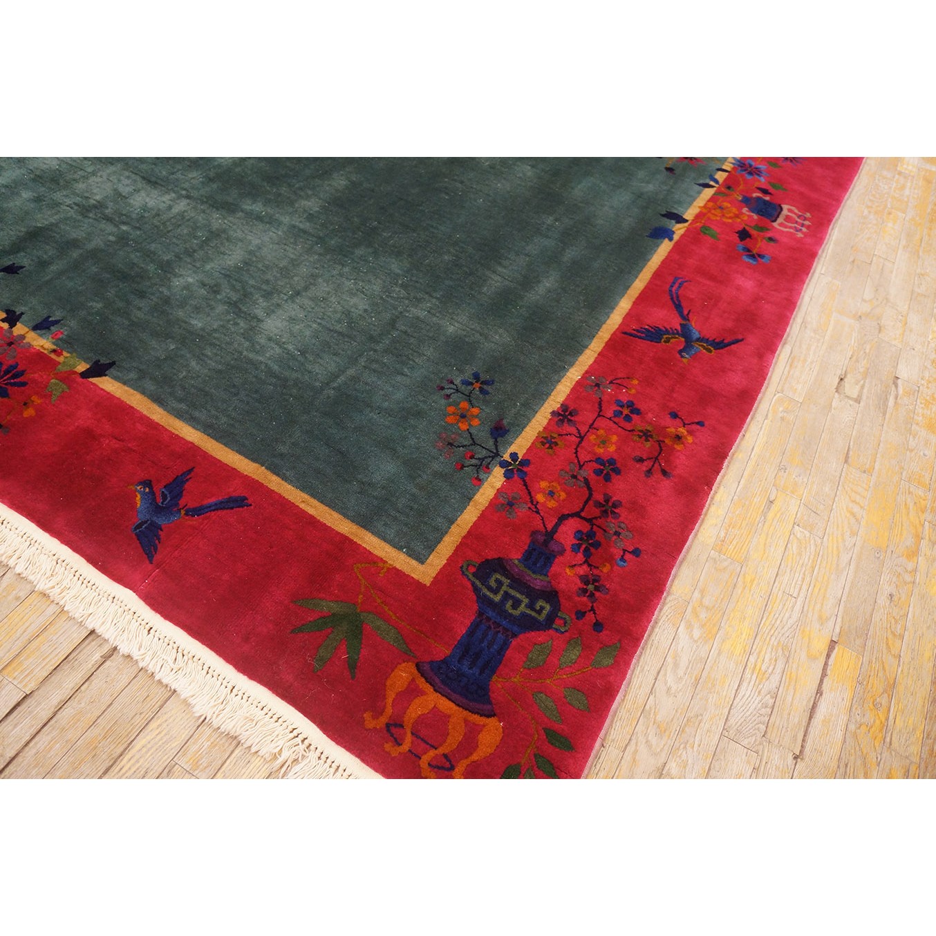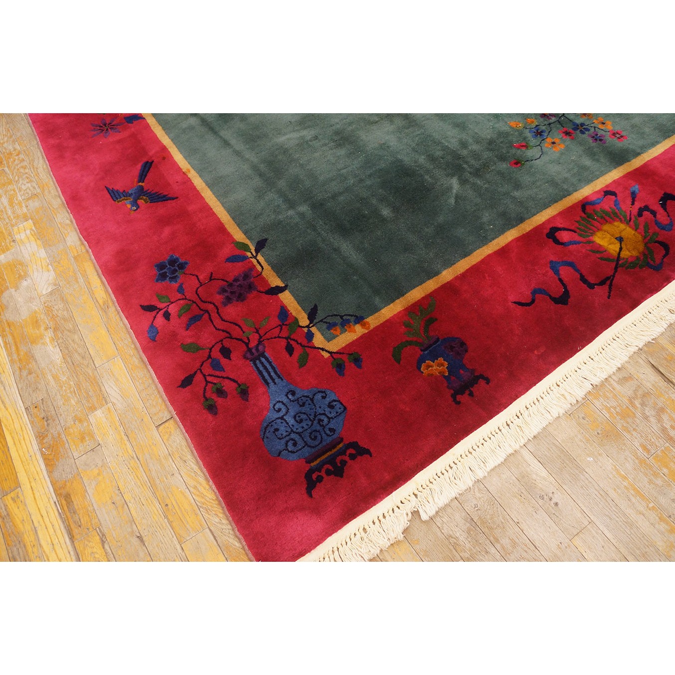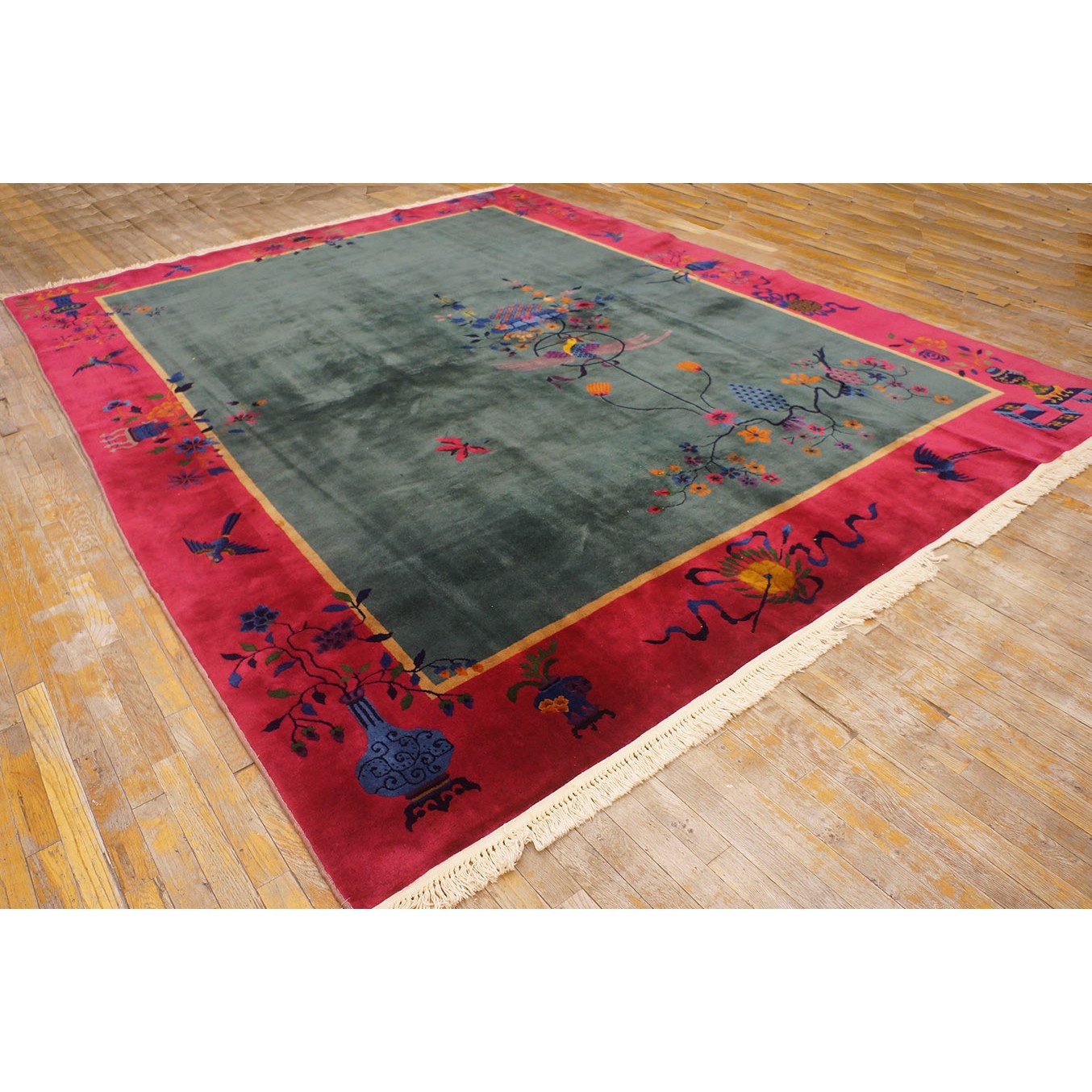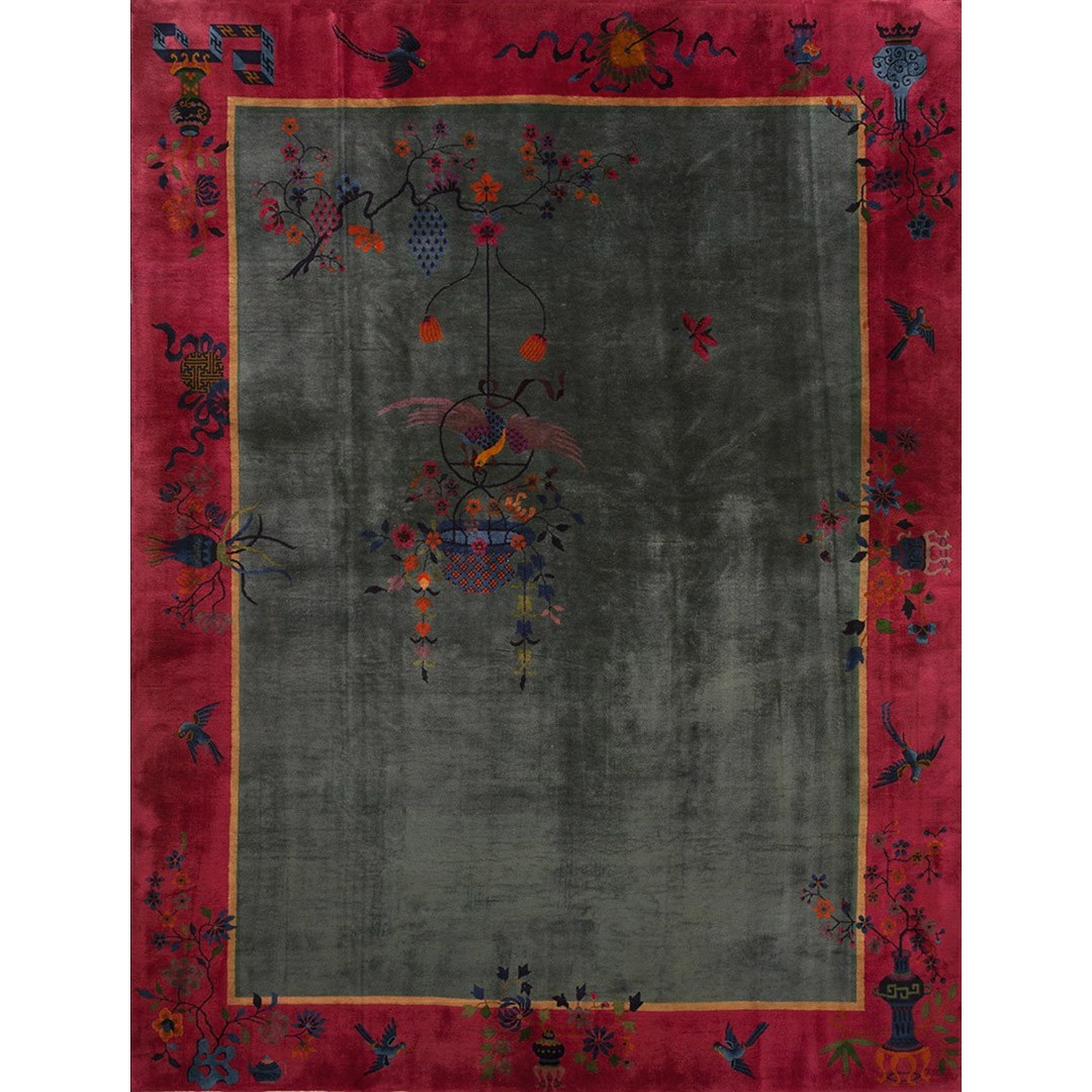 DescriptionChineseCarpets made in China proper. See entries Ningshia, Peking, Art Deco. Chinese - Art DecoAs the name implies, pieces woven between the wars for the Western market by mostly American owned firms especially Nichols and Fette, in thick heavy weaves using strong colors, asymmetric patterns and downplaying the Chinese-ness of the carpet. Nichols rugs are more strong toned than the pastel Fette. Most were woven in the coastal port city of Tientsin. Other lesser known workshops were also active. Some pieces are ultra-geometric and haute-Deco moderne in character: these are very rare. More frequent are pieces with bits of Chinese ornament: vases or other precious objects, paeonies, vines, fences, etc. Most common is the 9 x 12 size, in colors never found in mainstream Chinese rugs: backgrounds in black, mauve, purple, hot pink, orange, olive, employing the best synthetic chrome dyes of the period. Prices are still reasonable and carpets in top condition are available. | |