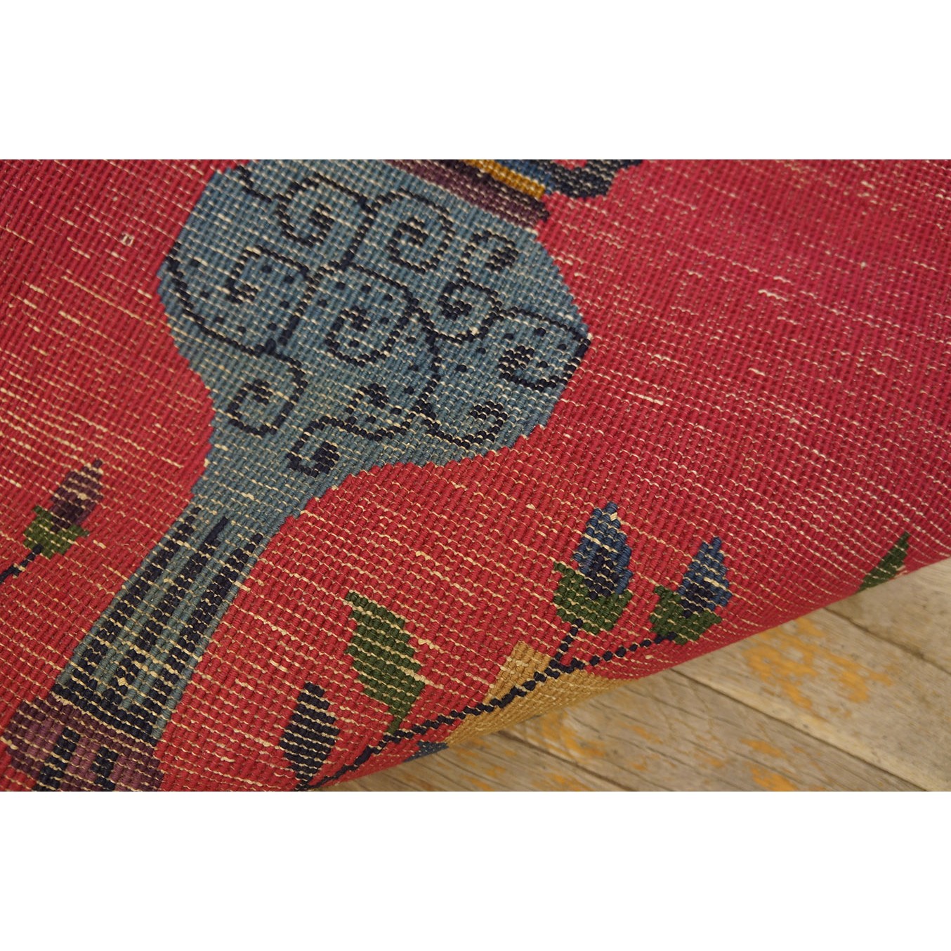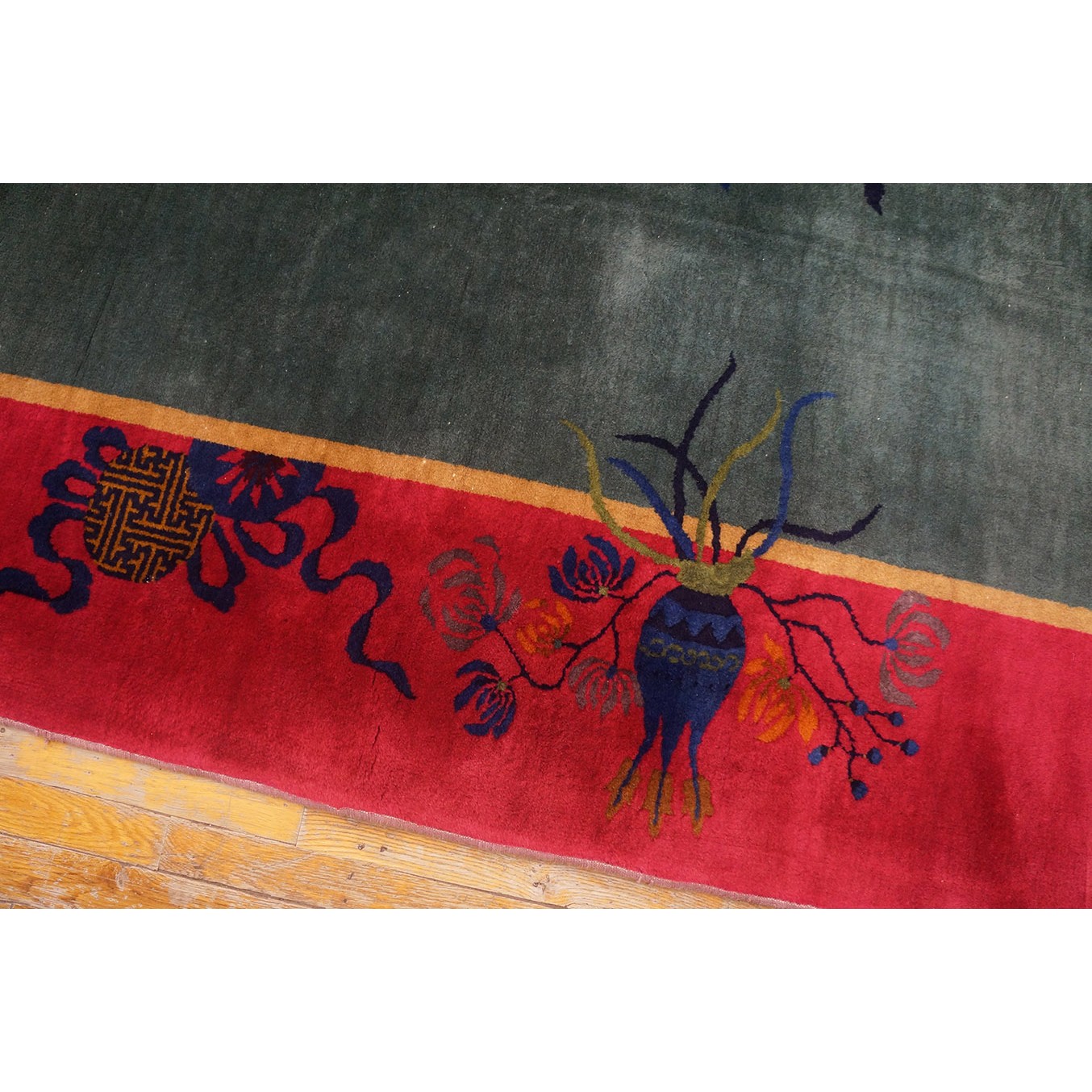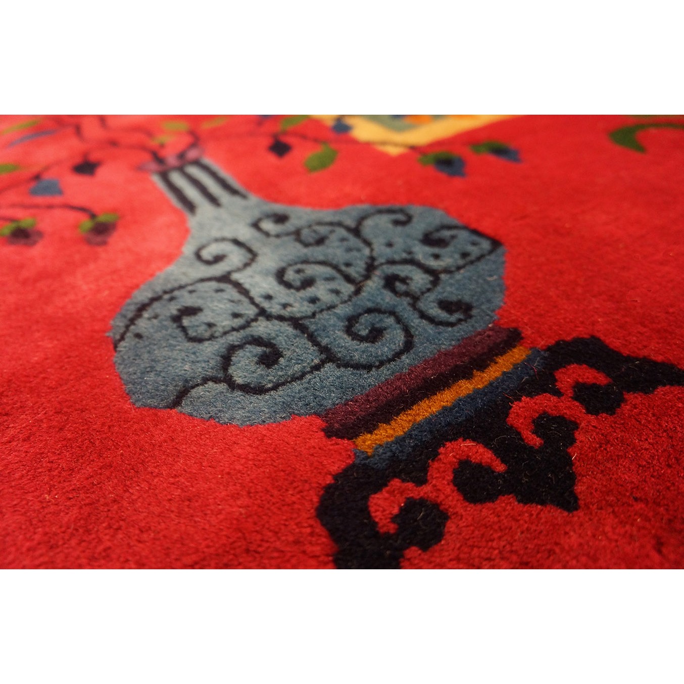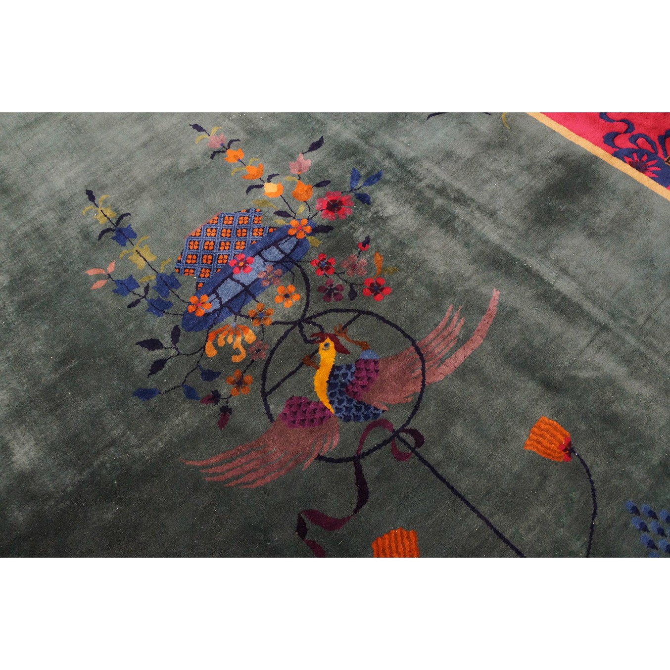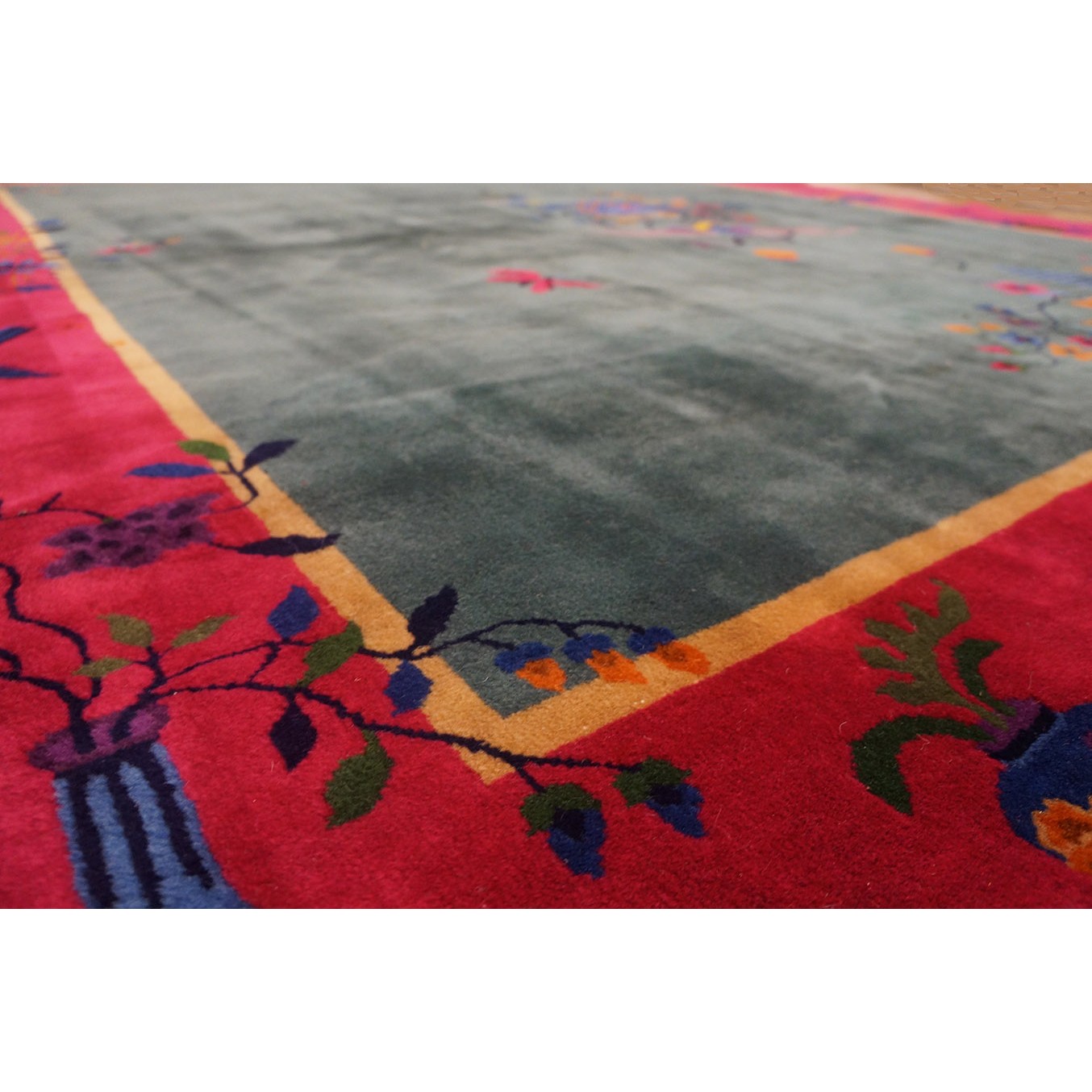 DescriptionChineseCarpets made in China proper. See entries Ningshia, Peking, Art Deco. Chinese - Art DecoAs the name implies, pieces woven between the wars for the Western market by mostly American owned firms especially Nichols and Fette, in thick heavy weaves using strong colors, asymmetric patterns and downplaying the Chinese-ness of the carpet. Nichols rugs are more strong toned than the pastel Fette. Most were woven in the coastal port city of Tientsin. Other lesser known workshops were also active. Some pieces are ultra-geometric and haute-Deco moderne in character: these are very rare. More frequent are pieces with bits of Chinese ornament: vases or other precious objects, paeonies, vines, fences, etc. Most common is the 9 x 12 size, in colors never found in mainstream Chinese rugs: backgrounds in black, mauve, purple, hot pink, orange, olive, employing the best synthetic chrome dyes of the period. Prices are still reasonable and carpets in top condition are available. | |