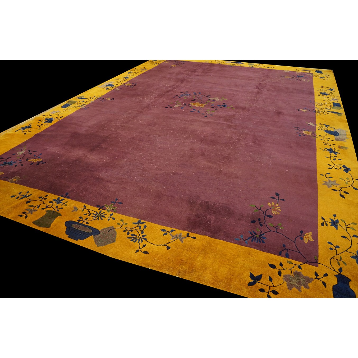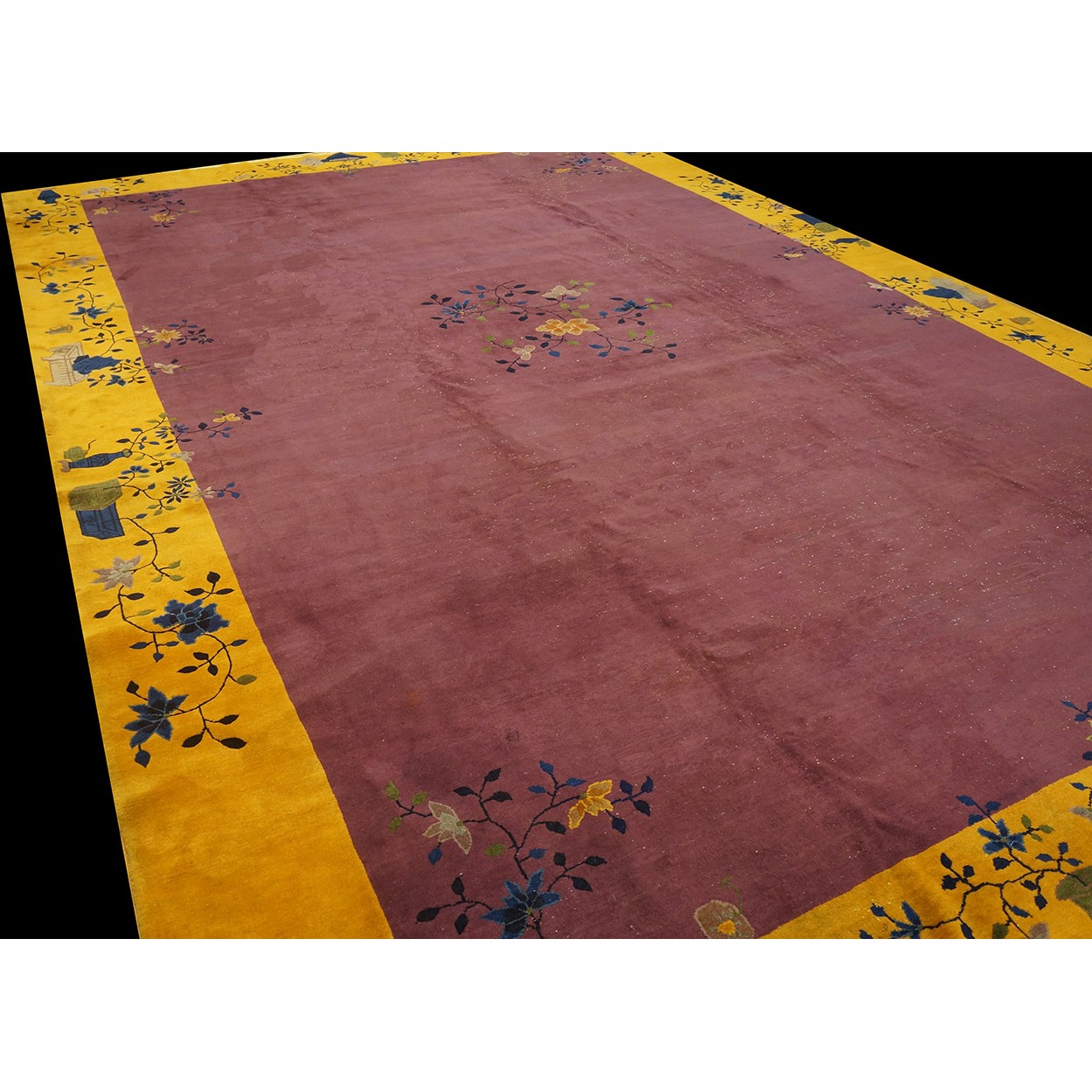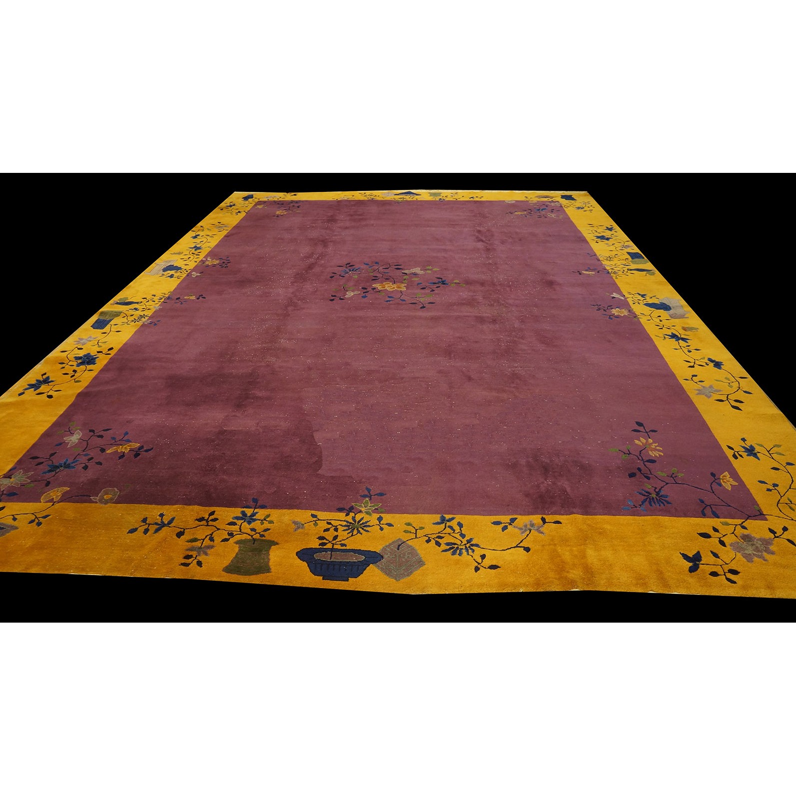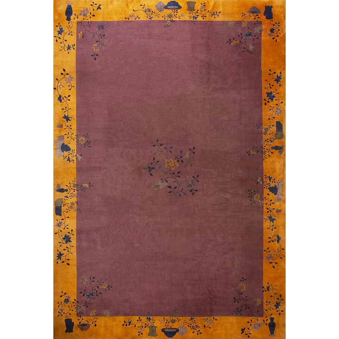 DescriptionChineseCarpets made in China proper. See entries Ningshia, Peking, Art Deco. Chinese - Art DecoAs the name implies, pieces woven between the wars for the Western market by mostly American owned firms especially Nichols and Fette, in thick heavy weaves using strong colors, asymmetric patterns and downplaying the Chinese-ness of the carpet. Nichols rugs are more strong toned than the pastel Fette. Most were woven in the coastal port city of Tientsin. Other lesser known workshops were also active. Some pieces are ultra-geometric and haute-Deco moderne in character: these are very rare. More frequent are pieces with bits of Chinese ornament: vases or other precious objects, paeonies, vines, fences, etc. Most common is the 9 x 12 size, in colors never found in mainstream Chinese rugs: backgrounds in black, mauve, purple, hot pink, orange, olive, employing the best synthetic chrome dyes of the period. Prices are still reasonable and carpets in top condition are available. | |