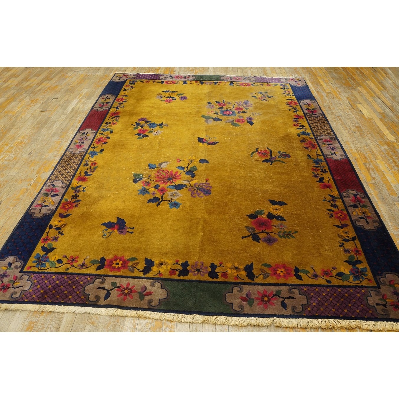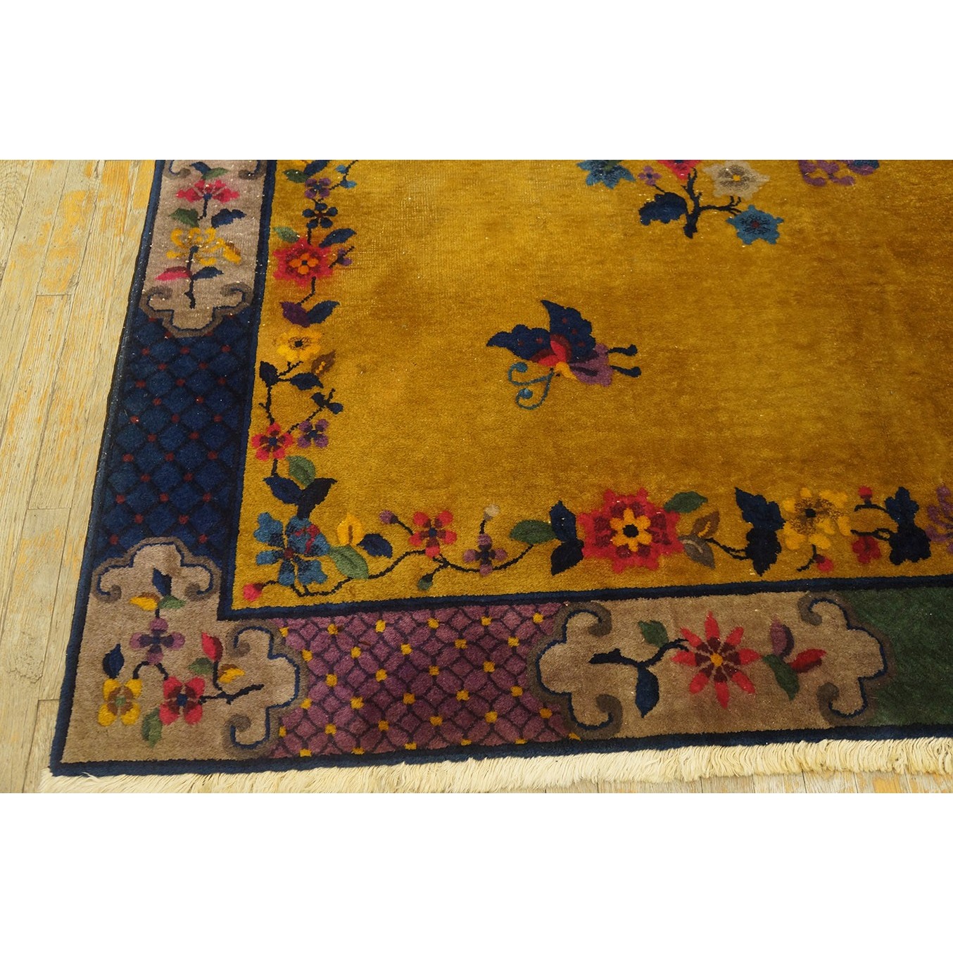DescriptionChineseCarpets made in China proper. See entries Ningshia, Peking, Art Deco. Chinese - Art DecoAs the name implies, pieces woven between the wars for the Western market by mostly American owned firms especially Nichols and Fette, in thick heavy weaves using strong colors, asymmetric patterns and downplaying the Chinese-ness of the carpet. Nichols rugs are more strong toned than the pastel Fette. Most were woven in the coastal port city of Tientsin. Other lesser known workshops were also active. Some pieces are ultra-geometric and haute-Deco moderne in character: these are very rare. More frequent are pieces with bits of Chinese ornament: vases or other precious objects, paeonies, vines, fences, etc. Most common is the 9 x 12 size, in colors never found in mainstream Chinese rugs: backgrounds in black, mauve, purple, hot pink, orange, olive, employing the best synthetic chrome dyes of the period. Prices are still reasonable and carpets in top condition are available. | |