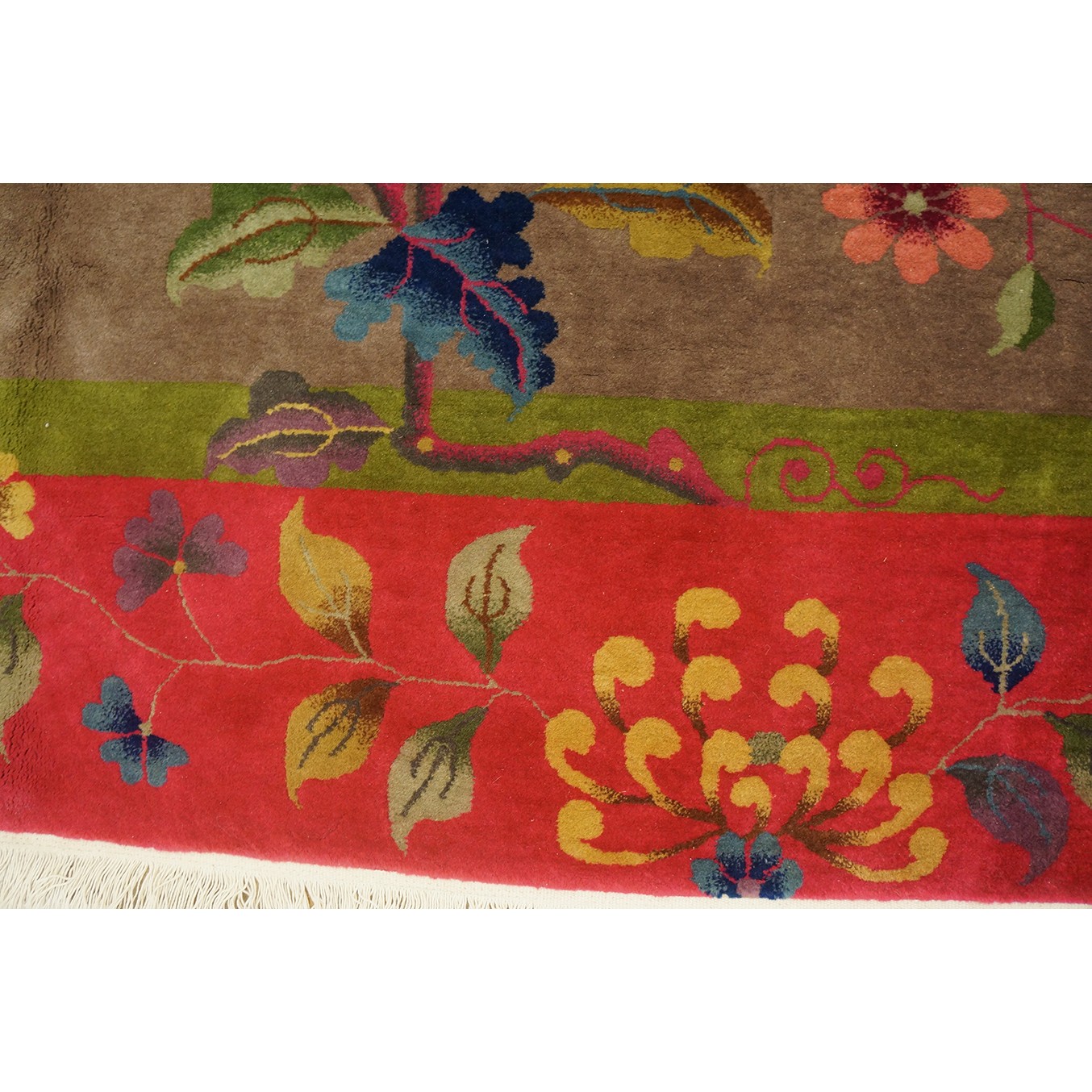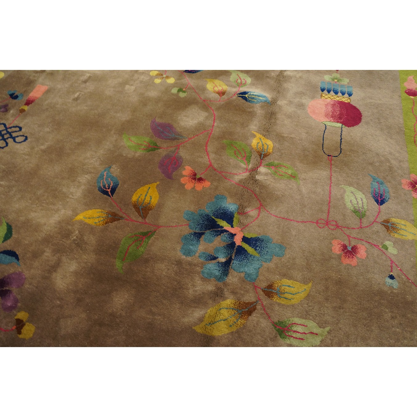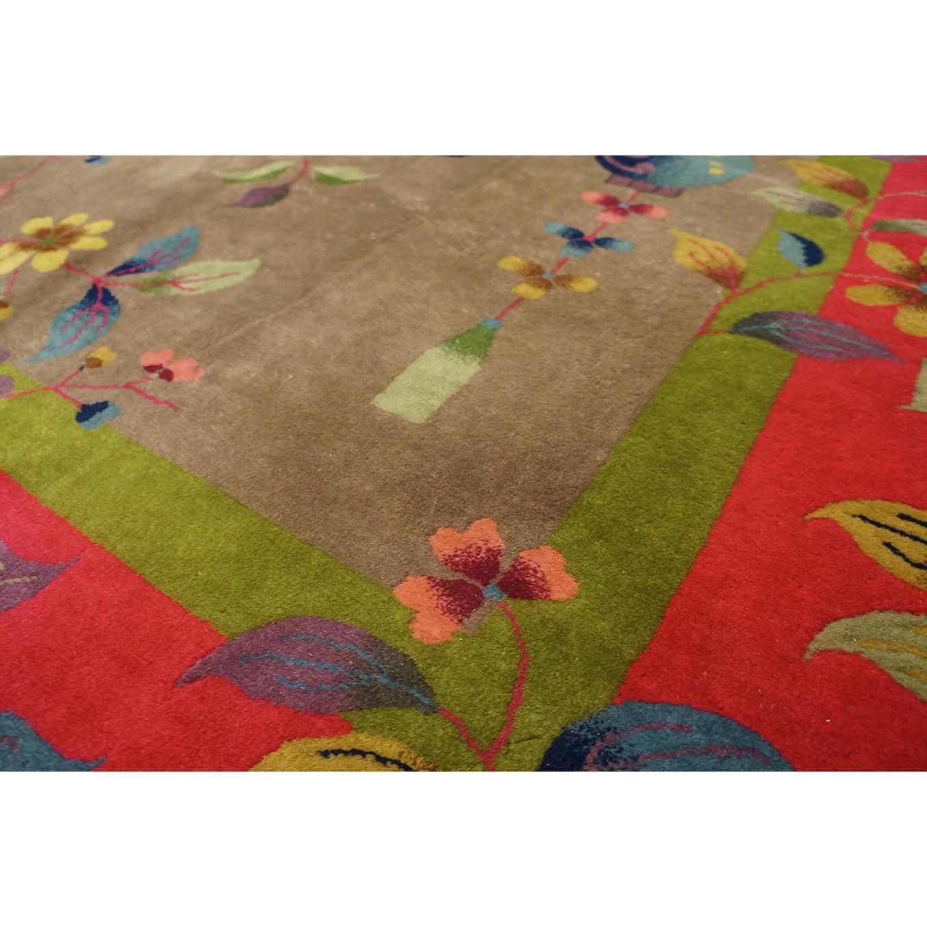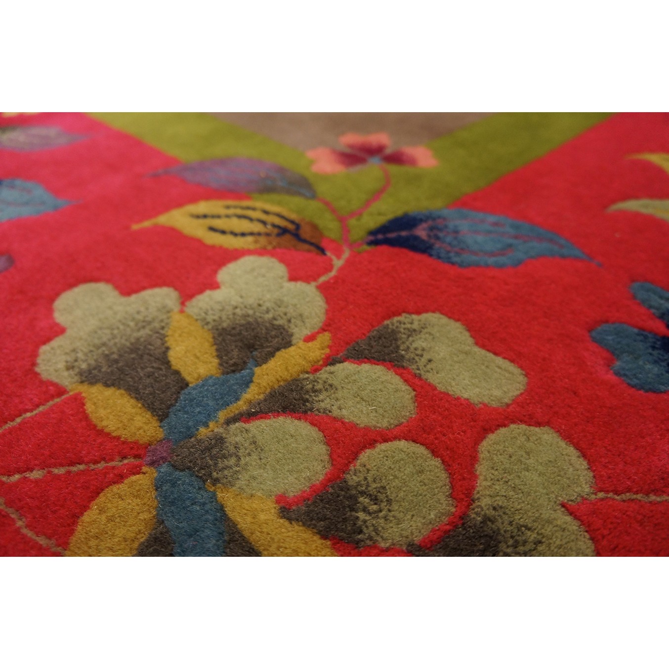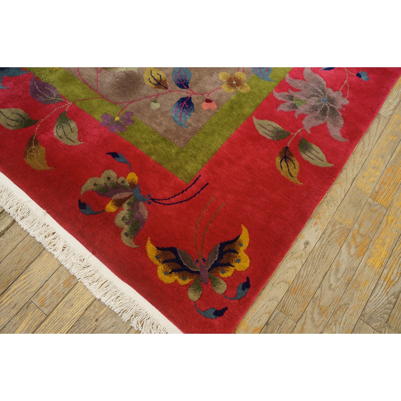 DescriptionChineseCarpets made in China proper. See entries Ningshia, Peking, Art Deco. Chinese - Art DecoAs the name implies, pieces woven between the wars for the Western market by mostly American owned firms especially Nichols and Fette, in thick heavy weaves using strong colors, asymmetric patterns and downplaying the Chinese-ness of the carpet. Nichols rugs are more strong toned than the pastel Fette. Most were woven in the coastal port city of Tientsin. Other lesser known workshops were also active. Some pieces are ultra-geometric and haute-Deco moderne in character: these are very rare. More frequent are pieces with bits of Chinese ornament: vases or other precious objects, paeonies, vines, fences, etc. Most common is the 9 x 12 size, in colors never found in mainstream Chinese rugs: backgrounds in black, mauve, purple, hot pink, orange, olive, employing the best synthetic chrome dyes of the period. Prices are still reasonable and carpets in top condition are available. | |