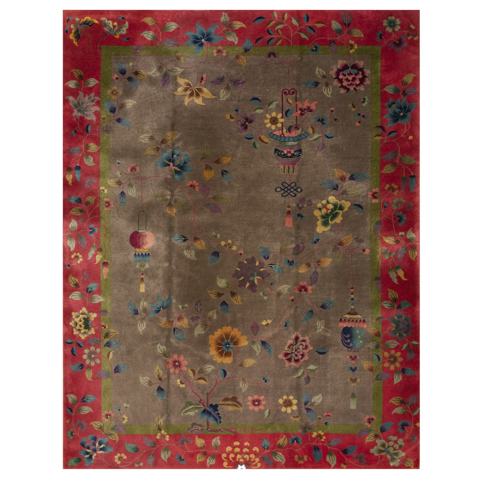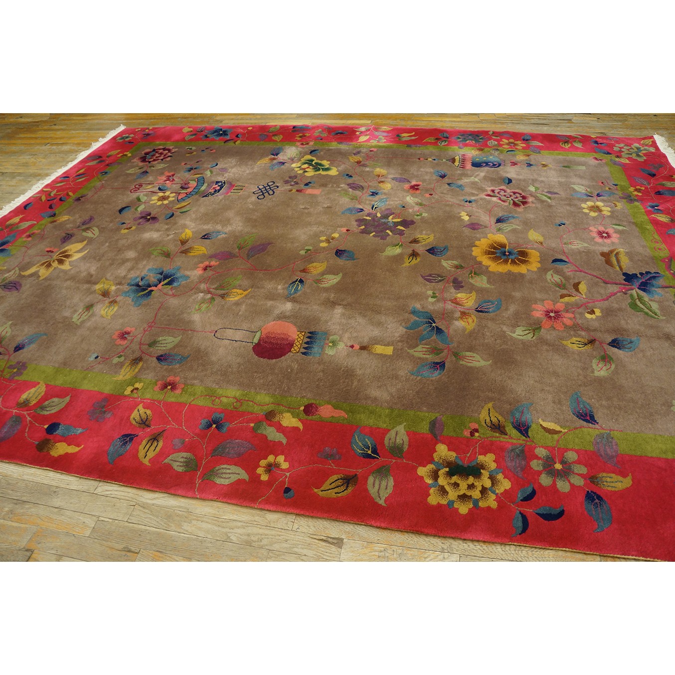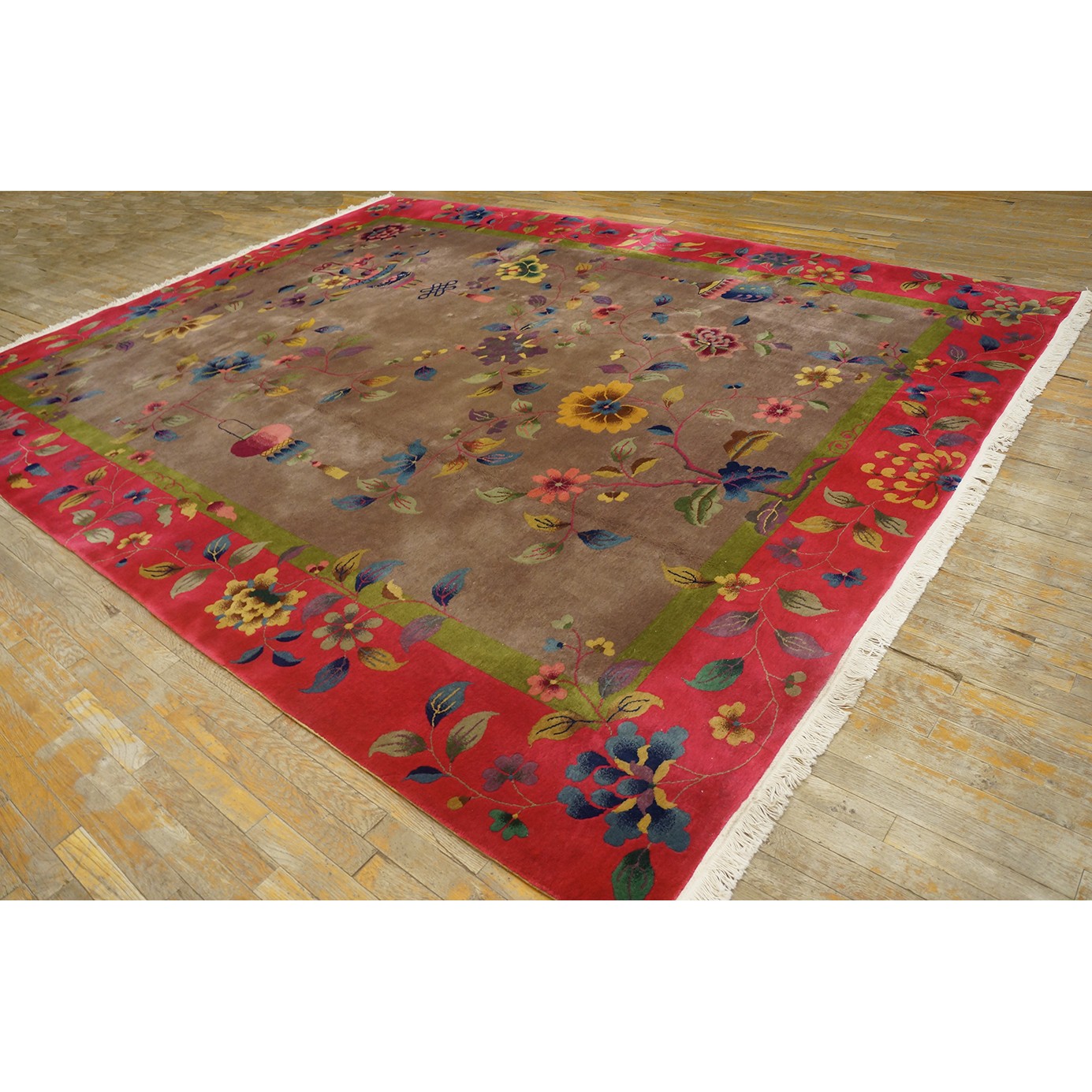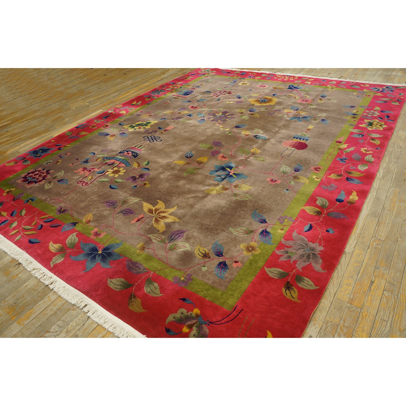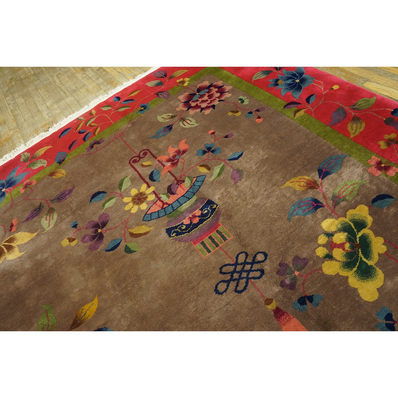 DescriptionChineseCarpets made in China proper. See entries Ningshia, Peking, Art Deco. Chinese - Art DecoAs the name implies, pieces woven between the wars for the Western market by mostly American owned firms especially Nichols and Fette, in thick heavy weaves using strong colors, asymmetric patterns and downplaying the Chinese-ness of the carpet. Nichols rugs are more strong toned than the pastel Fette. Most were woven in the coastal port city of Tientsin. Other lesser known workshops were also active. Some pieces are ultra-geometric and haute-Deco moderne in character: these are very rare. More frequent are pieces with bits of Chinese ornament: vases or other precious objects, paeonies, vines, fences, etc. Most common is the 9 x 12 size, in colors never found in mainstream Chinese rugs: backgrounds in black, mauve, purple, hot pink, orange, olive, employing the best synthetic chrome dyes of the period. Prices are still reasonable and carpets in top condition are available. | |