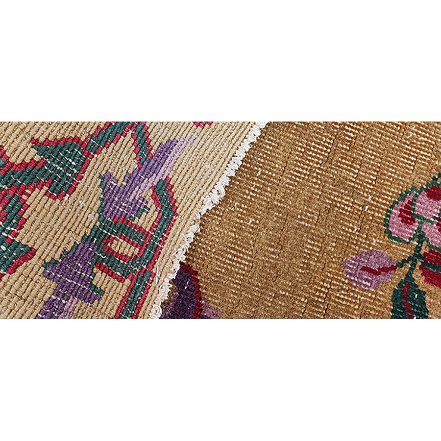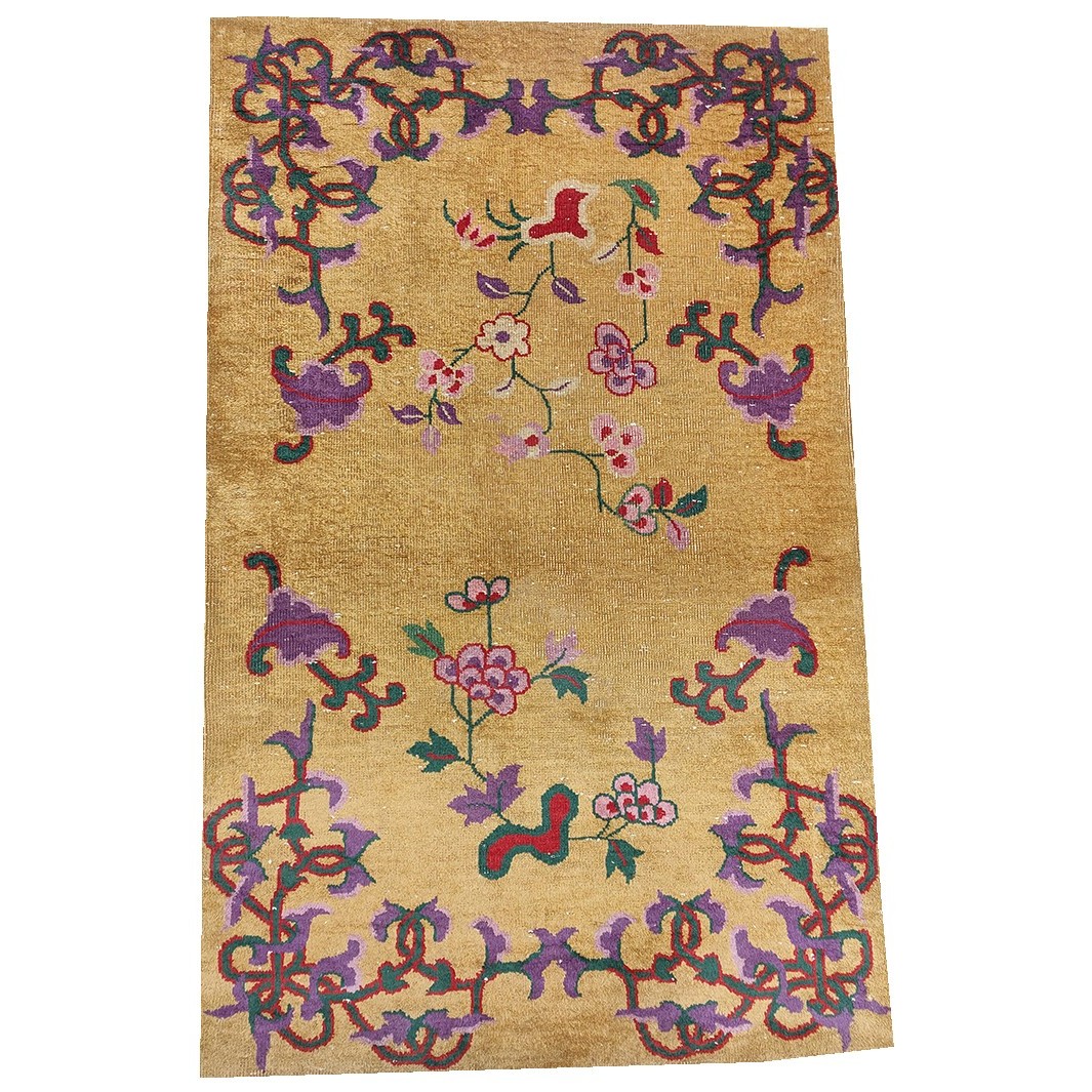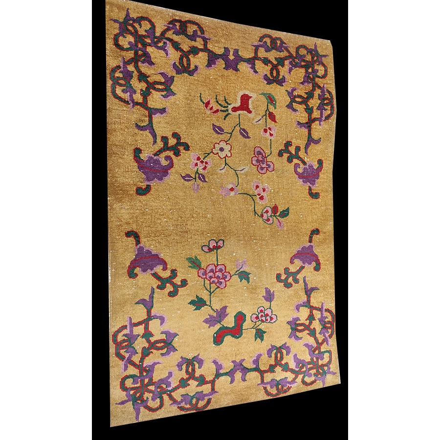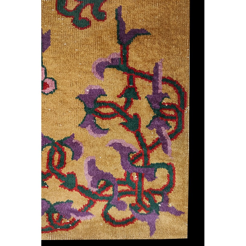 DescriptionChineseCarpets made in China proper. See entries Ningshia, Peking, Art Deco. Chinese - Art DecoAs the name implies, pieces woven between the wars for the Western market by mostly American owned firms especially Nichols and Fette, in thick heavy weaves using strong colors, asymmetric patterns and downplaying the Chinese-ness of the carpet. Nichols rugs are more strong toned than the pastel Fette. Most were woven in the coastal port city of Tientsin. Other lesser known workshops were also active. Some pieces are ultra-geometric and haute-Deco moderne in character: these are very rare. More frequent are pieces with bits of Chinese ornament: vases or other precious objects, paeonies, vines, fences, etc. Most common is the 9 x 12 size, in colors never found in mainstream Chinese rugs: backgrounds in black, mauve, purple, hot pink, orange, olive, employing the best synthetic chrome dyes of the period. Prices are still reasonable and carpets in top condition are available. | |