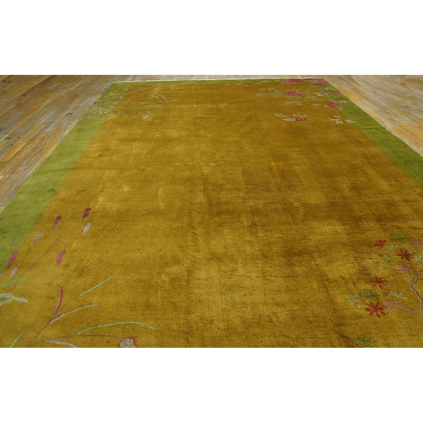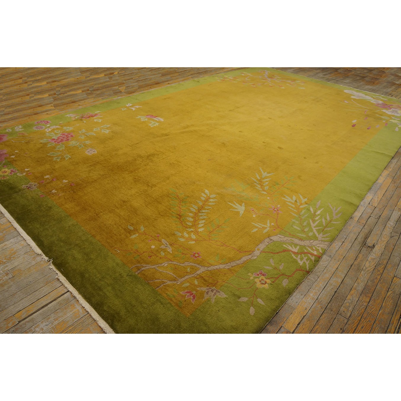DescriptionChineseCarpets made in China proper. See entries Ningshia, Peking, Art Deco. Chinese - Art DecoAs the name implies, pieces woven between the wars for the Western market by mostly American owned firms especially Nichols and Fette, in thick heavy weaves using strong colors, asymmetric patterns and downplaying the Chinese-ness of the carpet. Nichols rugs are more strong toned than the pastel Fette. Most were woven in the coastal port city of Tientsin. Other lesser known workshops were also active. Some pieces are ultra-geometric and haute-Deco moderne in character: these are very rare. More frequent are pieces with bits of Chinese ornament: vases or other precious objects, paeonies, vines, fences, etc. Most common is the 9 x 12 size, in colors never found in mainstream Chinese rugs: backgrounds in black, mauve, purple, hot pink, orange, olive, employing the best synthetic chrome dyes of the period. Prices are still reasonable and carpets in top condition are available. | |