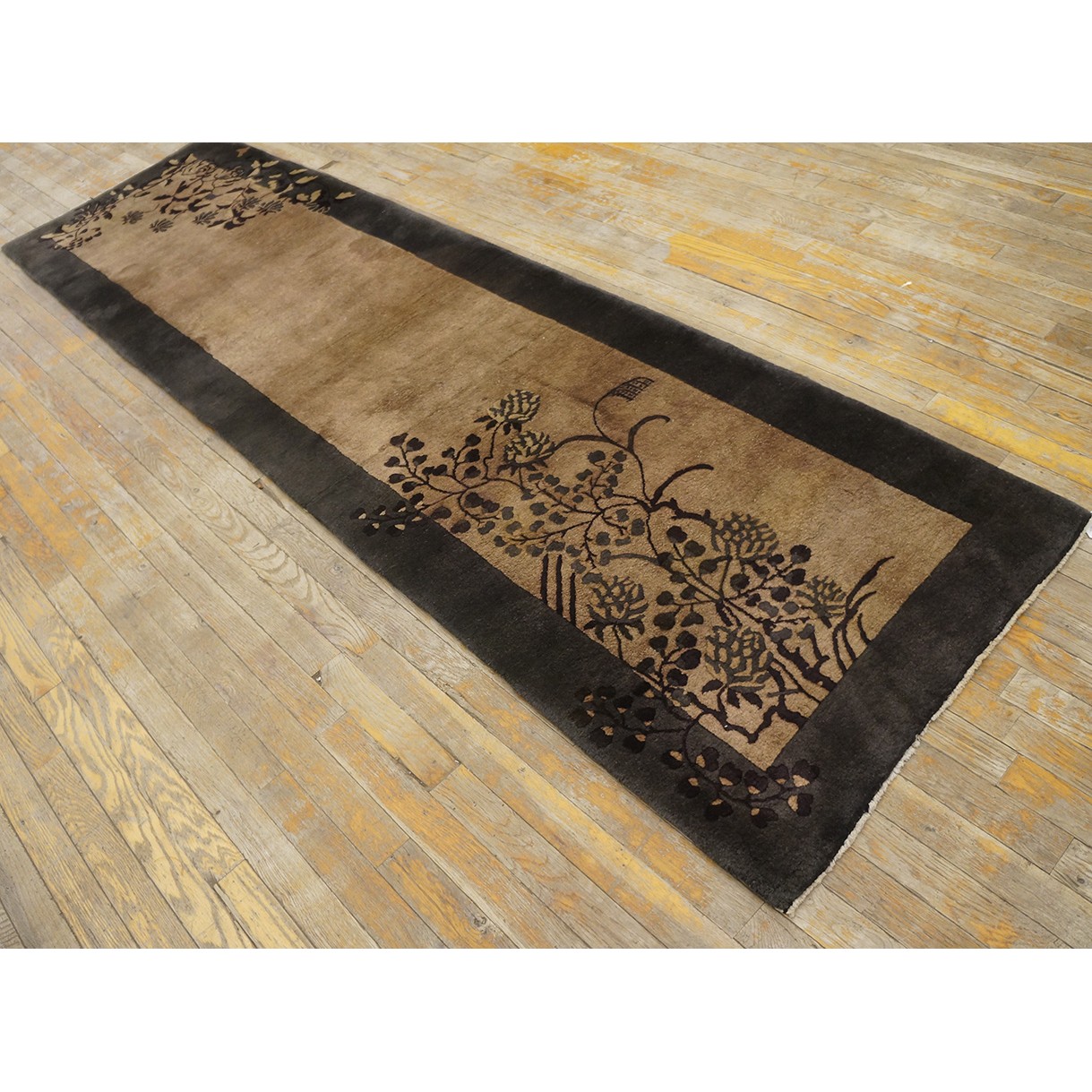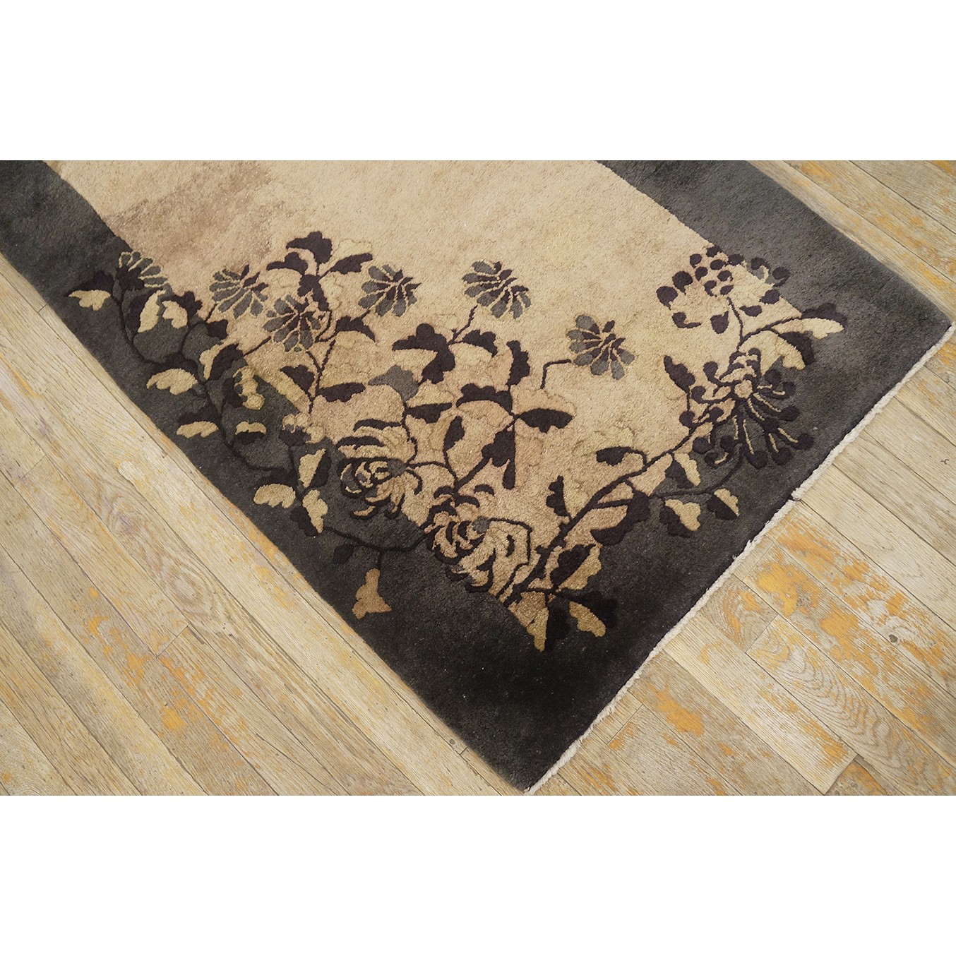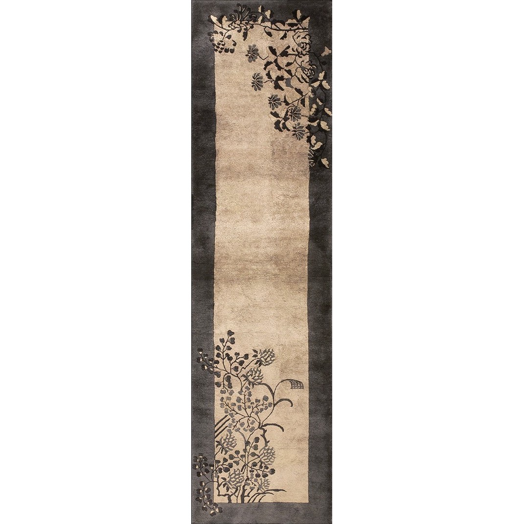 DescriptionChineseCarpets made in China proper. See entries Ningshia, Peking, Art Deco. Chinese - Art DecoAs the name implies, pieces woven between the wars for the Western market by mostly American owned firms especially Nichols and Fette, in thick heavy weaves using strong colors, asymmetric patterns and downplaying the Chinese-ness of the carpet. Nichols rugs are more strong toned than the pastel Fette. Most were woven in the coastal port city of Tientsin. Other lesser known workshops were also active. Some pieces are ultra-geometric and haute-Deco moderne in character: these are very rare. More frequent are pieces with bits of Chinese ornament: vases or other precious objects, paeonies, vines, fences, etc. Most common is the 9 x 12 size, in colors never found in mainstream Chinese rugs: backgrounds in black, mauve, purple, hot pink, orange, olive, employing the best synthetic chrome dyes of the period. Prices are still reasonable and carpets in top condition are available. | |