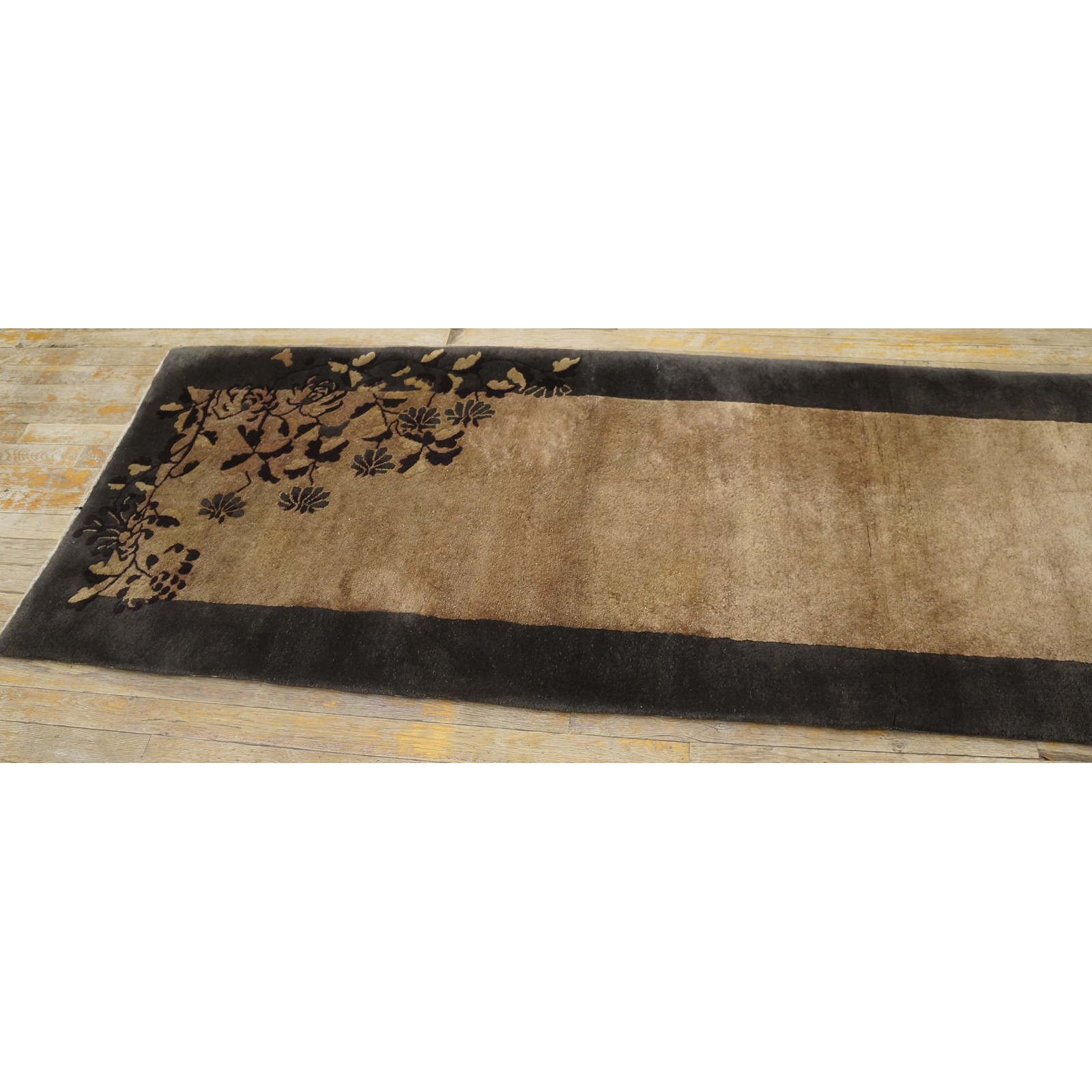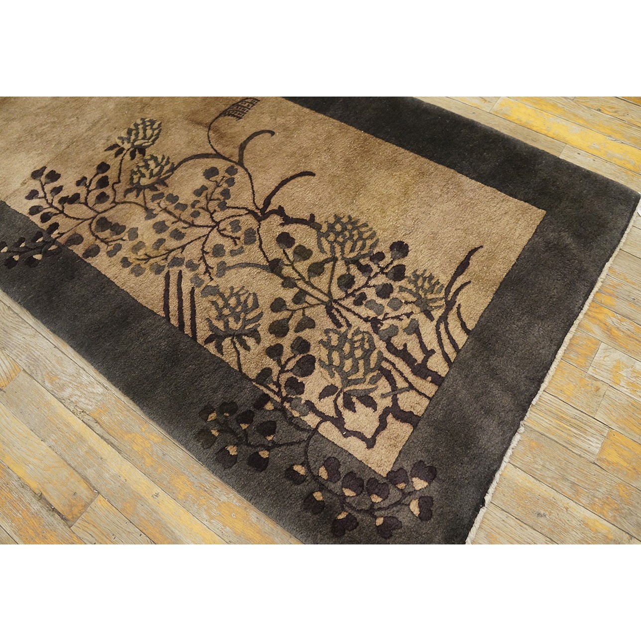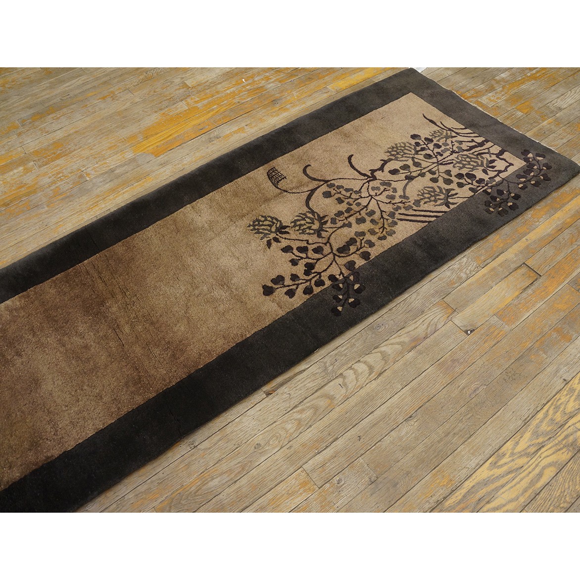 DescriptionChineseCarpets made in China proper. See entries Ningshia, Peking, Art Deco. Chinese - Art DecoAs the name implies, pieces woven between the wars for the Western market by mostly American owned firms especially Nichols and Fette, in thick heavy weaves using strong colors, asymmetric patterns and downplaying the Chinese-ness of the carpet. Nichols rugs are more strong toned than the pastel Fette. Most were woven in the coastal port city of Tientsin. Other lesser known workshops were also active. Some pieces are ultra-geometric and haute-Deco moderne in character: these are very rare. More frequent are pieces with bits of Chinese ornament: vases or other precious objects, paeonies, vines, fences, etc. Most common is the 9 x 12 size, in colors never found in mainstream Chinese rugs: backgrounds in black, mauve, purple, hot pink, orange, olive, employing the best synthetic chrome dyes of the period. Prices are still reasonable and carpets in top condition are available. | |