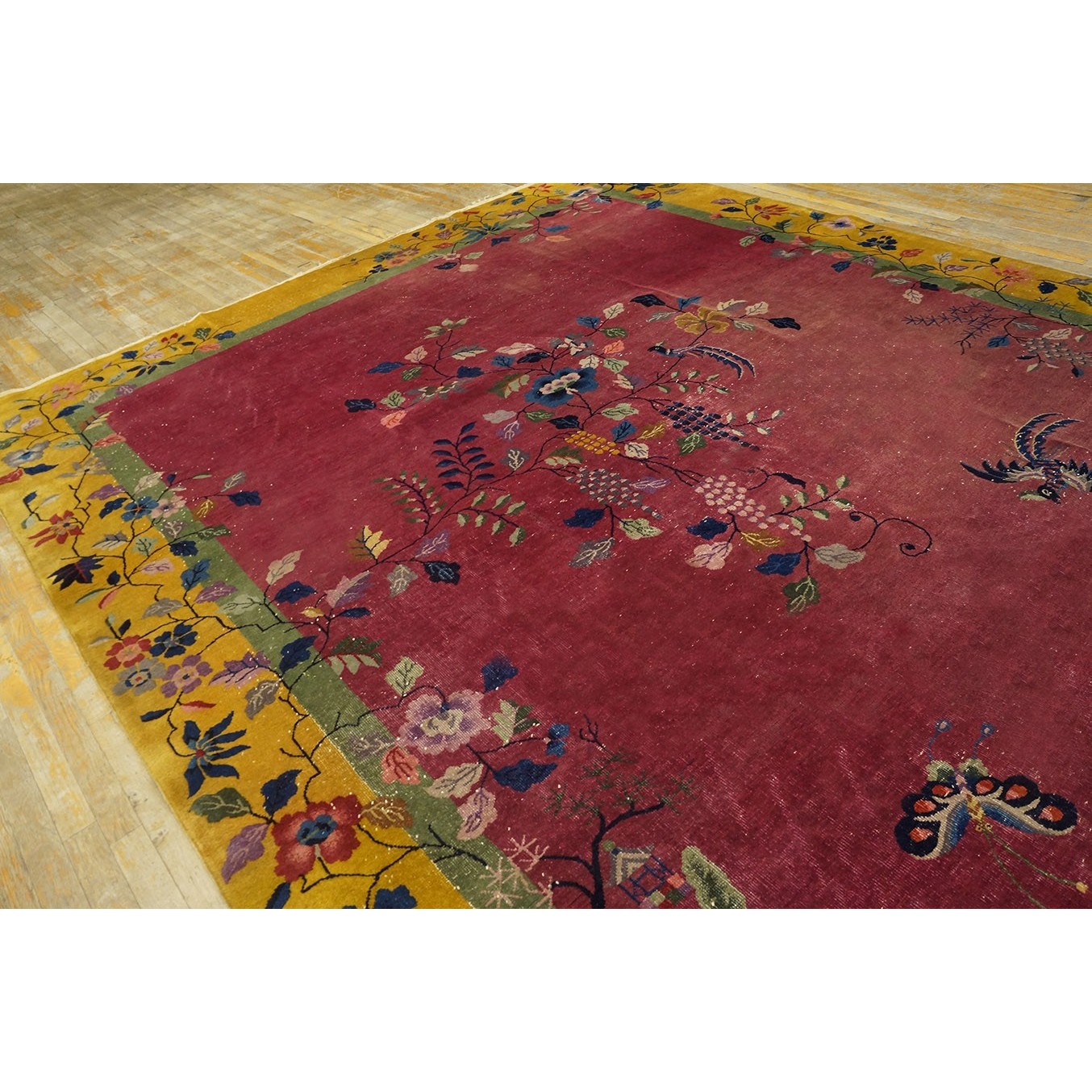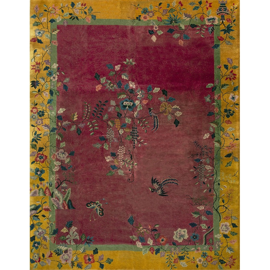 DescriptionChineseCarpets made in China proper. See entries Ningshia, Peking, Art Deco. Chinese - Art DecoAs the name implies, pieces woven between the wars for the Western market by mostly American owned firms especially Nichols and Fette, in thick heavy weaves using strong colors, asymmetric patterns and downplaying the Chinese-ness of the carpet. Nichols rugs are more strong toned than the pastel Fette. Most were woven in the coastal port city of Tientsin. Other lesser known workshops were also active. Some pieces are ultra-geometric and haute-Deco moderne in character: these are very rare. More frequent are pieces with bits of Chinese ornament: vases or other precious objects, paeonies, vines, fences, etc. Most common is the 9 x 12 size, in colors never found in mainstream Chinese rugs: backgrounds in black, mauve, purple, hot pink, orange, olive, employing the best synthetic chrome dyes of the period. Prices are still reasonable and carpets in top condition are available. | |