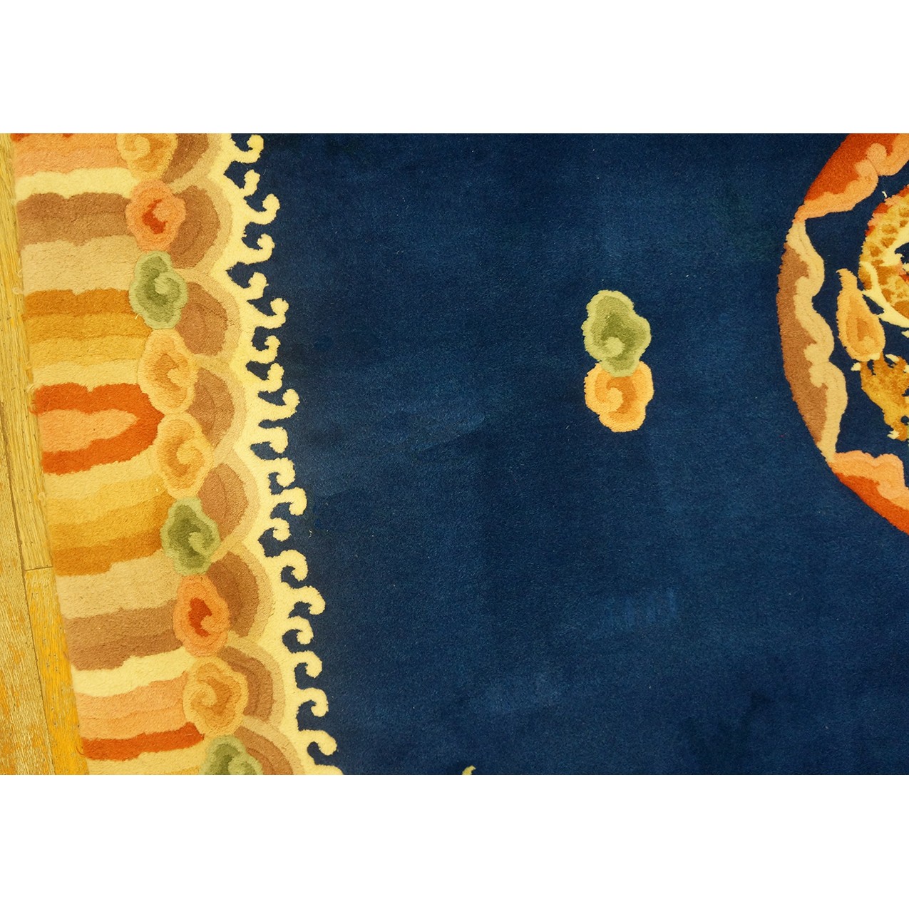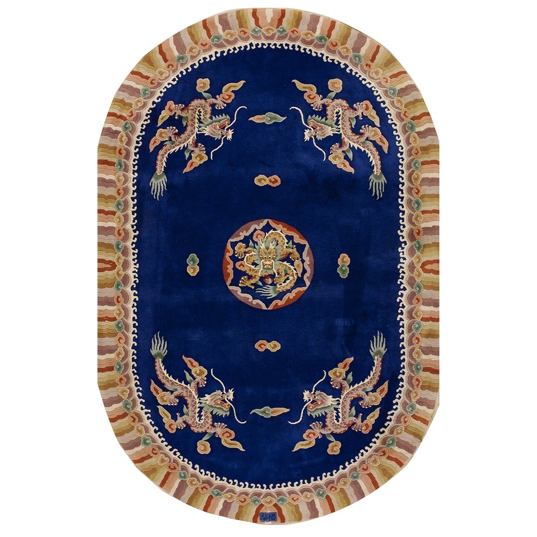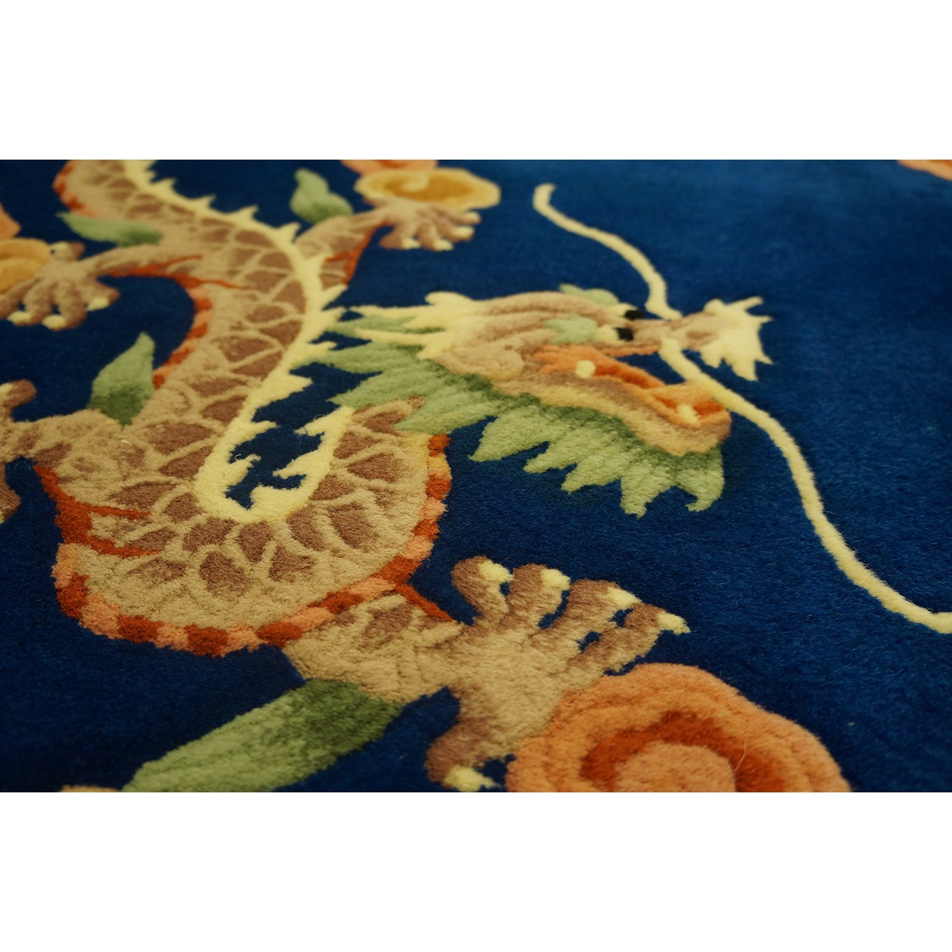 DescriptionChineseCarpets made in China proper. See entries Ningshia, Peking, Art Deco. Chinese - Art DecoAs the name implies, pieces woven between the wars for the Western market by mostly American owned firms especially Nichols and Fette, in thick heavy weaves using strong colors, asymmetric patterns and downplaying the Chinese-ness of the carpet. Nichols rugs are more strong toned than the pastel Fette. Most were woven in the coastal port city of Tientsin. Other lesser known workshops were also active. Some pieces are ultra-geometric and haute-Deco moderne in character: these are very rare. More frequent are pieces with bits of Chinese ornament: vases or other precious objects, paeonies, vines, fences, etc. Most common is the 9 x 12 size, in colors never found in mainstream Chinese rugs: backgrounds in black, mauve, purple, hot pink, orange, olive, employing the best synthetic chrome dyes of the period. Prices are still reasonable and carpets in top condition are available. | |