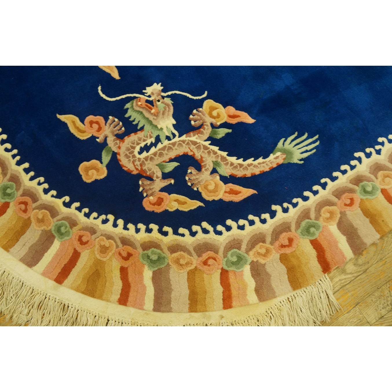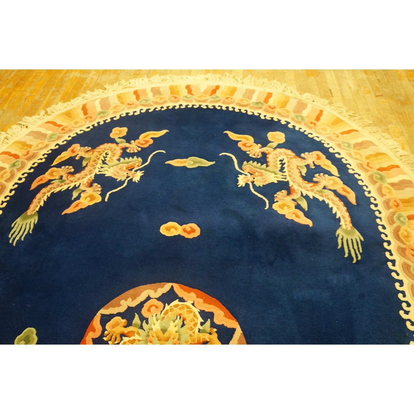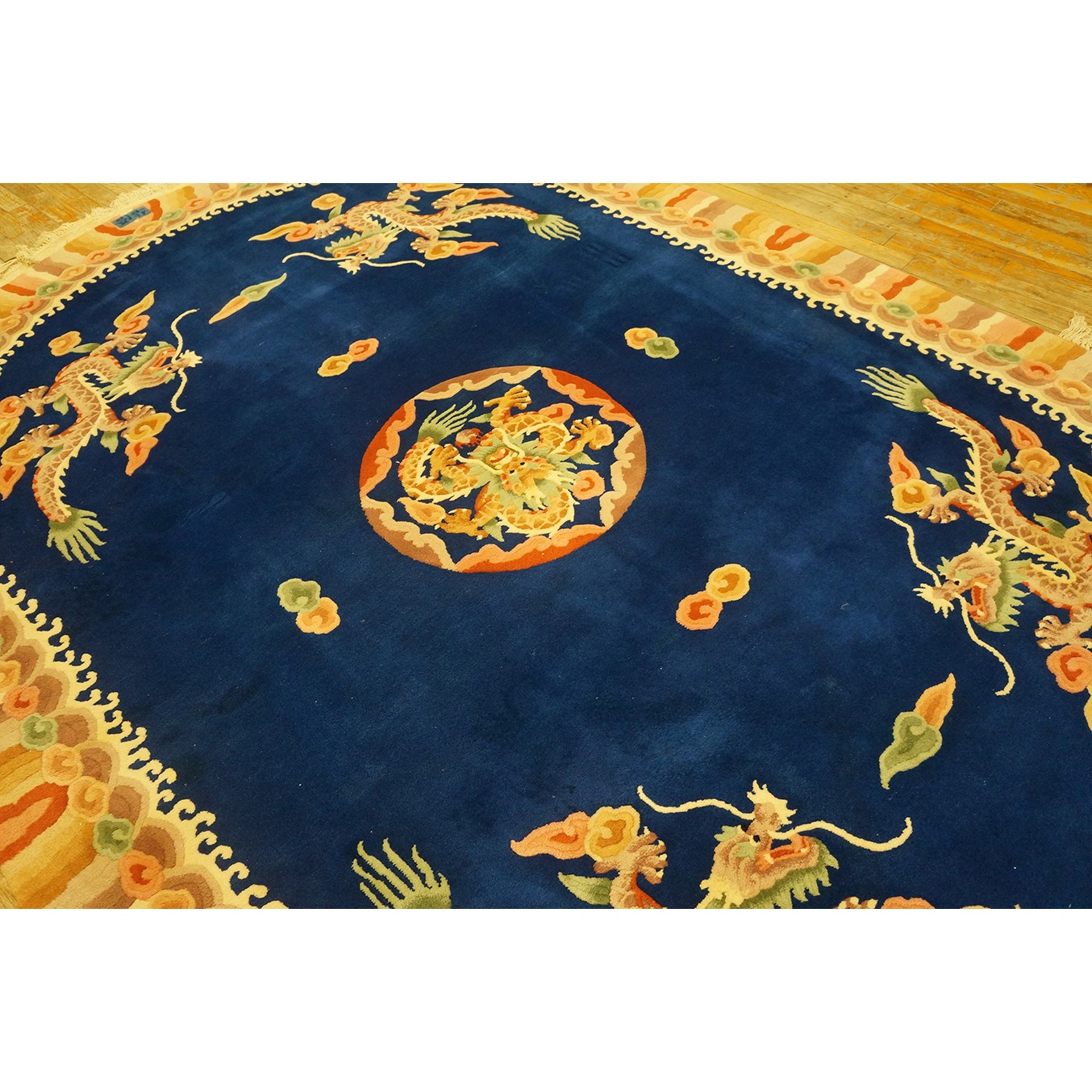 DescriptionChineseCarpets made in China proper. See entries Ningshia, Peking, Art Deco. Chinese - Art DecoAs the name implies, pieces woven between the wars for the Western market by mostly American owned firms especially Nichols and Fette, in thick heavy weaves using strong colors, asymmetric patterns and downplaying the Chinese-ness of the carpet. Nichols rugs are more strong toned than the pastel Fette. Most were woven in the coastal port city of Tientsin. Other lesser known workshops were also active. Some pieces are ultra-geometric and haute-Deco moderne in character: these are very rare. More frequent are pieces with bits of Chinese ornament: vases or other precious objects, paeonies, vines, fences, etc. Most common is the 9 x 12 size, in colors never found in mainstream Chinese rugs: backgrounds in black, mauve, purple, hot pink, orange, olive, employing the best synthetic chrome dyes of the period. Prices are still reasonable and carpets in top condition are available. | |