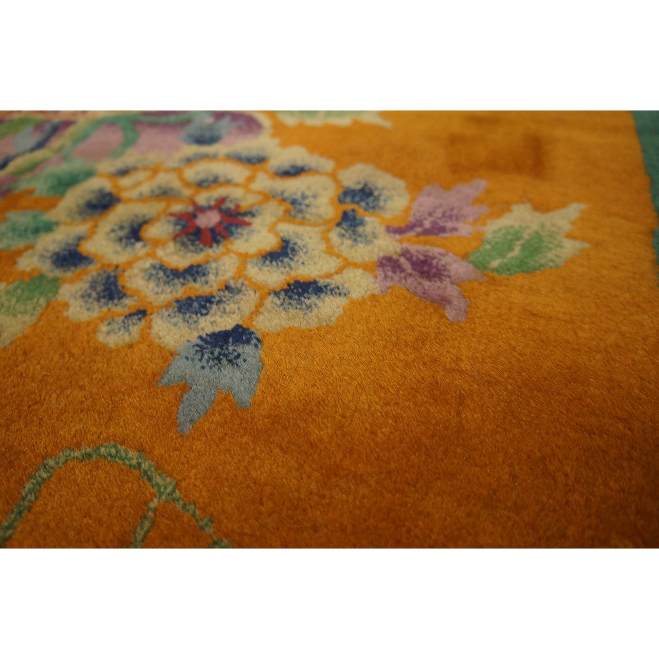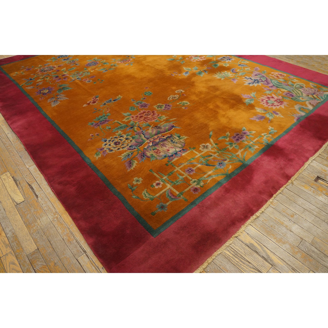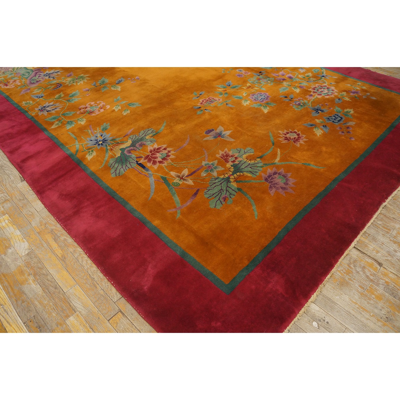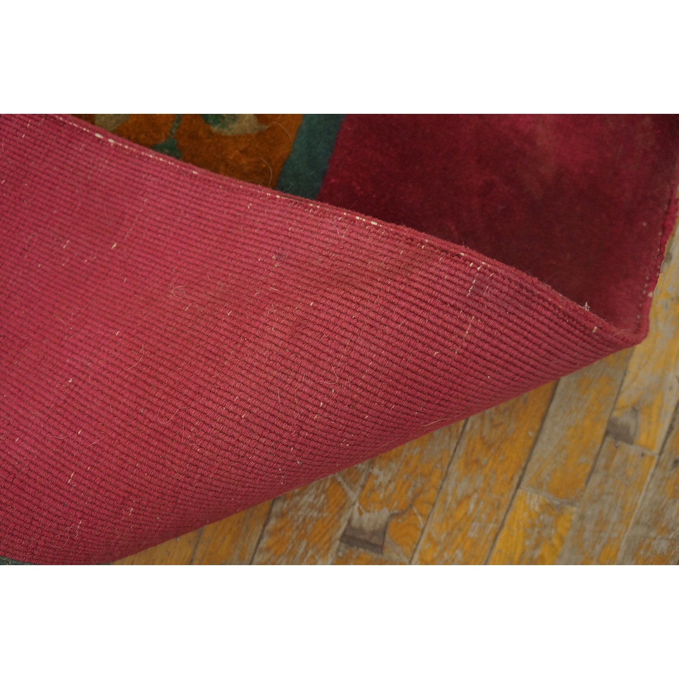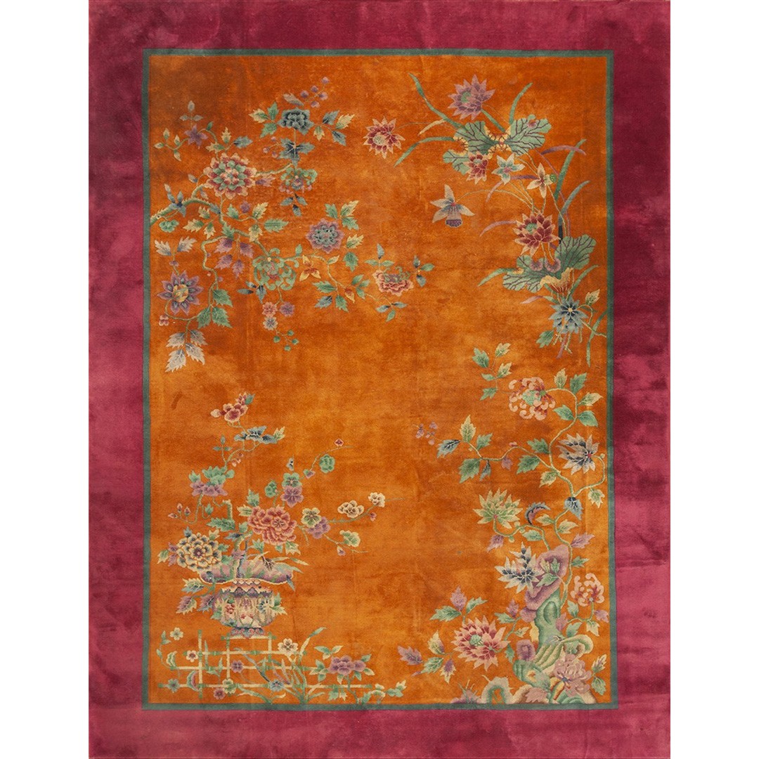 DescriptionChineseCarpets made in China proper. See entries Ningshia, Peking, Art Deco. Chinese - Art DecoAs the name implies, pieces woven between the wars for the Western market by mostly American owned firms especially Nichols and Fette, in thick heavy weaves using strong colors, asymmetric patterns and downplaying the Chinese-ness of the carpet. Nichols rugs are more strong toned than the pastel Fette. Most were woven in the coastal port city of Tientsin. Other lesser known workshops were also active. Some pieces are ultra-geometric and haute-Deco moderne in character: these are very rare. More frequent are pieces with bits of Chinese ornament: vases or other precious objects, paeonies, vines, fences, etc. Most common is the 9 x 12 size, in colors never found in mainstream Chinese rugs: backgrounds in black, mauve, purple, hot pink, orange, olive, employing the best synthetic chrome dyes of the period. Prices are still reasonable and carpets in top condition are available. | |