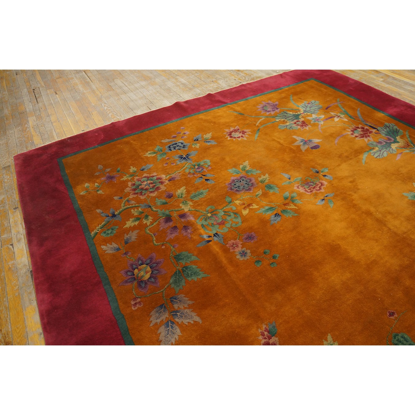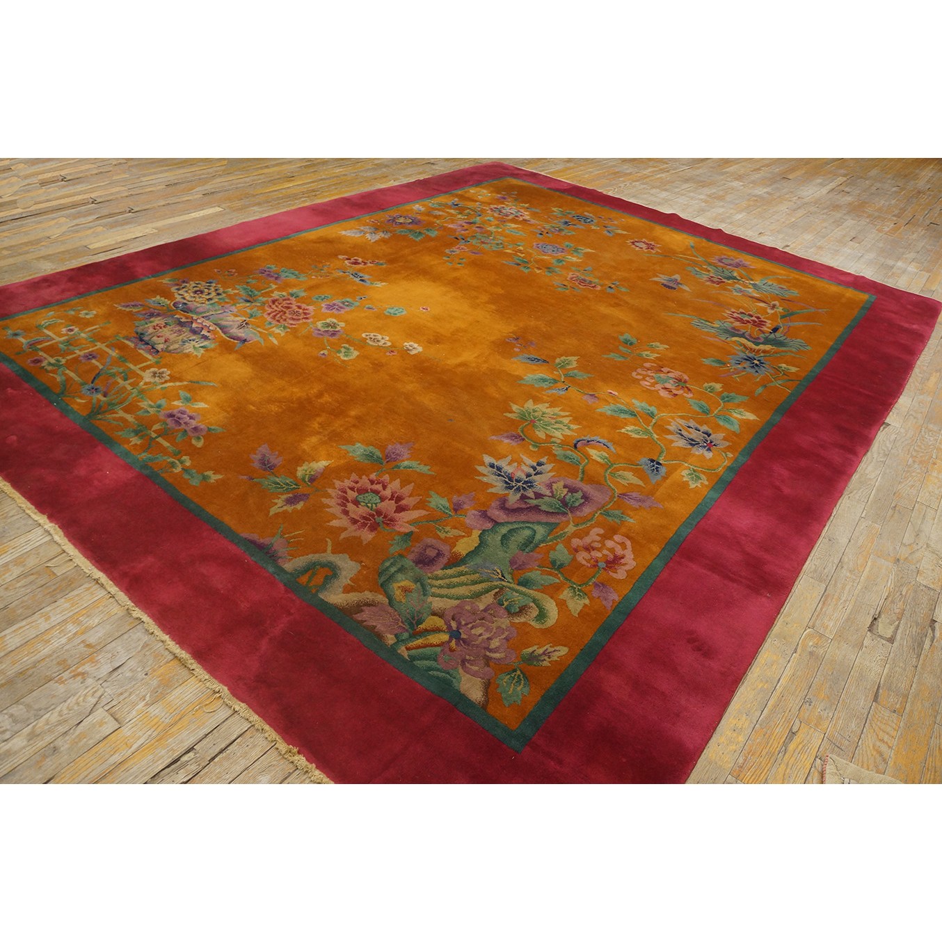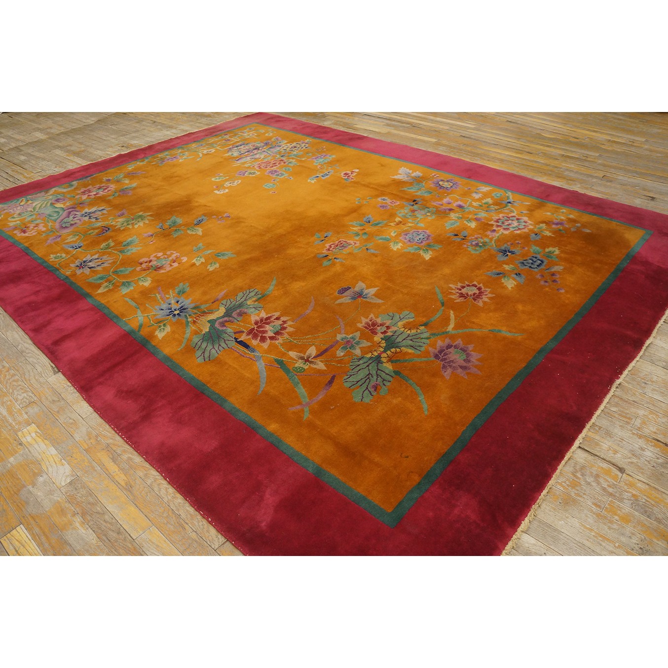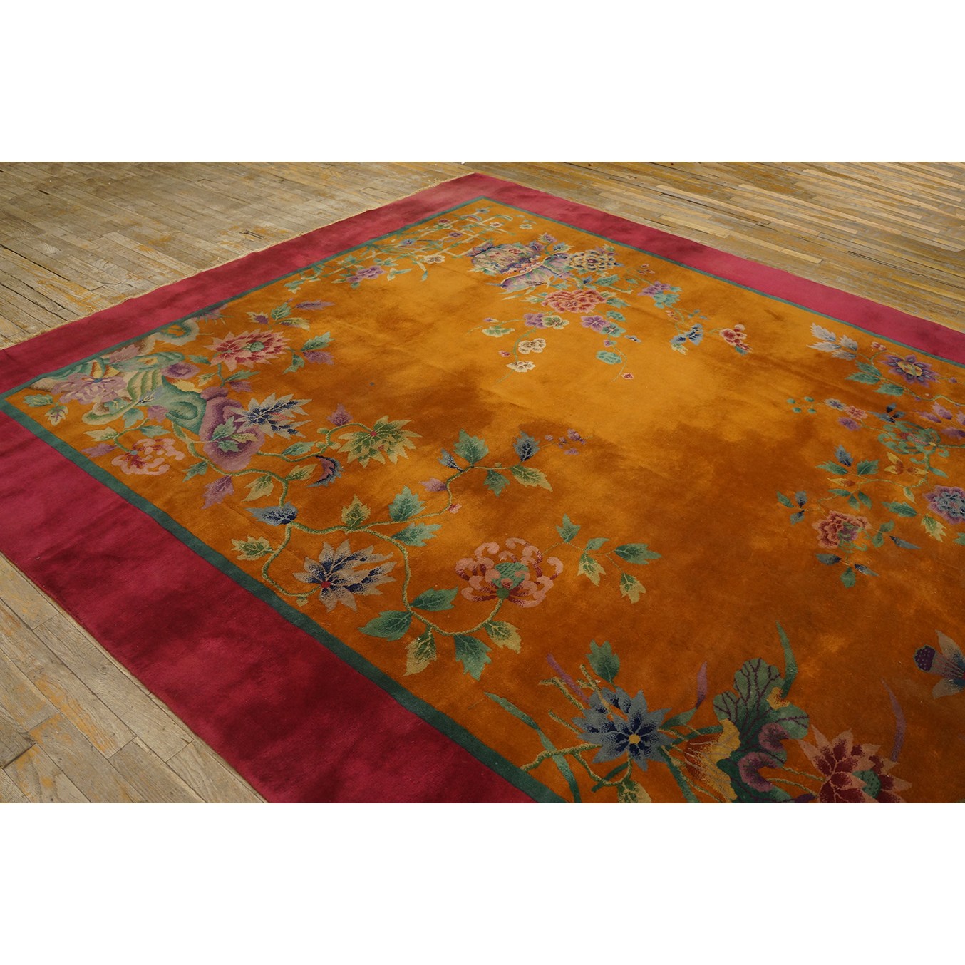 DescriptionChineseCarpets made in China proper. See entries Ningshia, Peking, Art Deco. Chinese - Art DecoAs the name implies, pieces woven between the wars for the Western market by mostly American owned firms especially Nichols and Fette, in thick heavy weaves using strong colors, asymmetric patterns and downplaying the Chinese-ness of the carpet. Nichols rugs are more strong toned than the pastel Fette. Most were woven in the coastal port city of Tientsin. Other lesser known workshops were also active. Some pieces are ultra-geometric and haute-Deco moderne in character: these are very rare. More frequent are pieces with bits of Chinese ornament: vases or other precious objects, paeonies, vines, fences, etc. Most common is the 9 x 12 size, in colors never found in mainstream Chinese rugs: backgrounds in black, mauve, purple, hot pink, orange, olive, employing the best synthetic chrome dyes of the period. Prices are still reasonable and carpets in top condition are available. | |